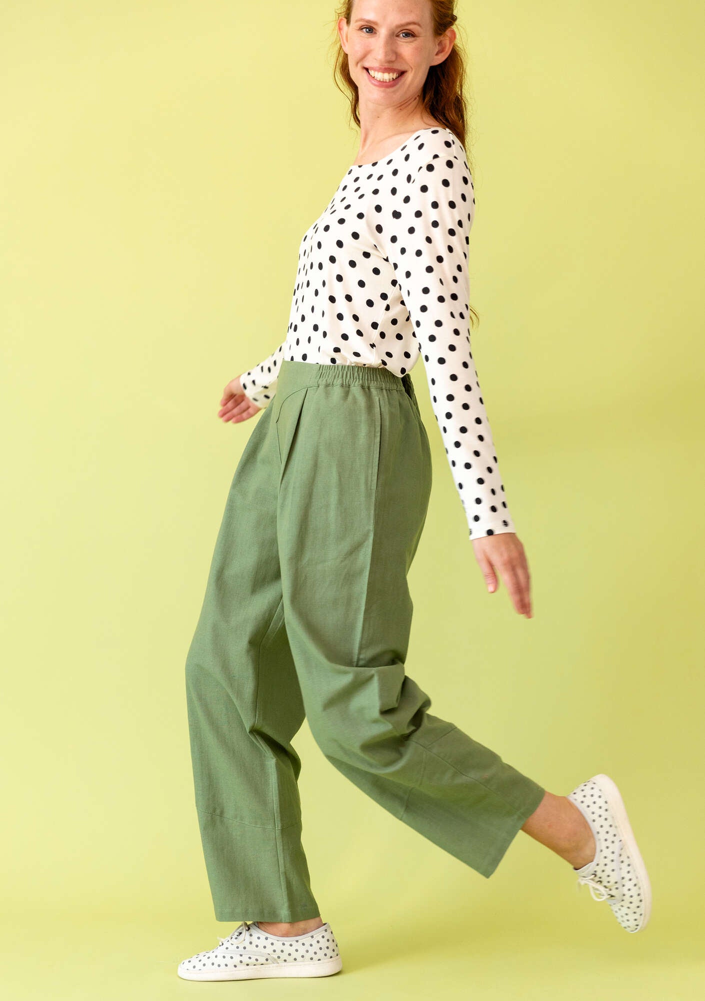 Ankle length and crafted from a soft, breathable fabric. Elasticated waistband and a V-shaped yoke at the waist. Two front box pleats and side pockets. Attractive stitching detail at the hem creates a curved look.