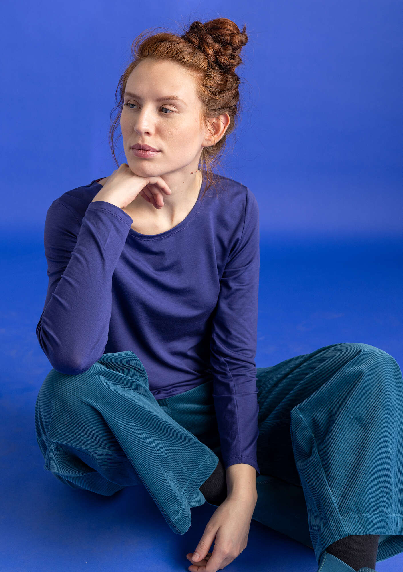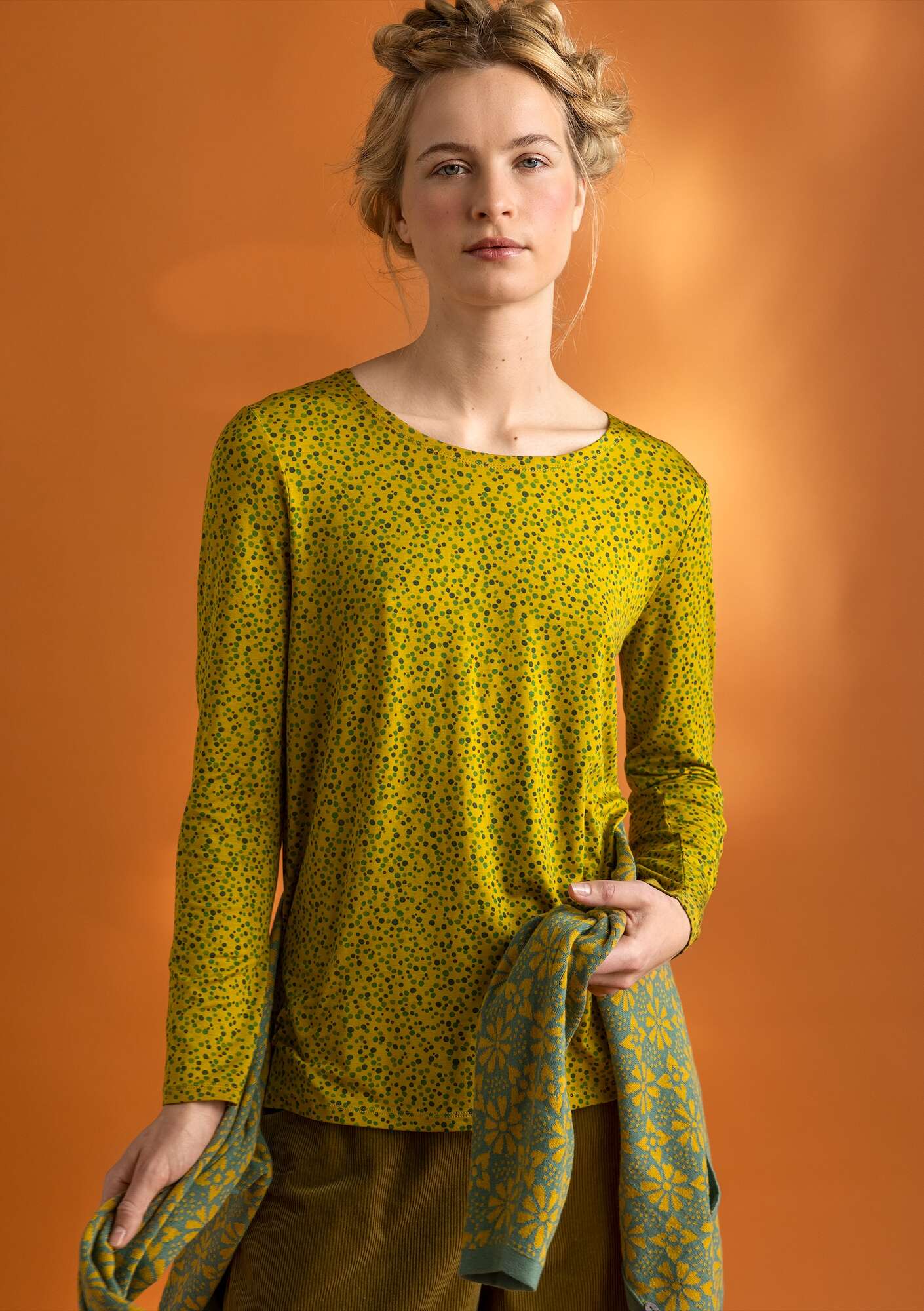 A simple style with a round neck and full-length sleeves. Available in solid colours and with our “Helga” printed design.