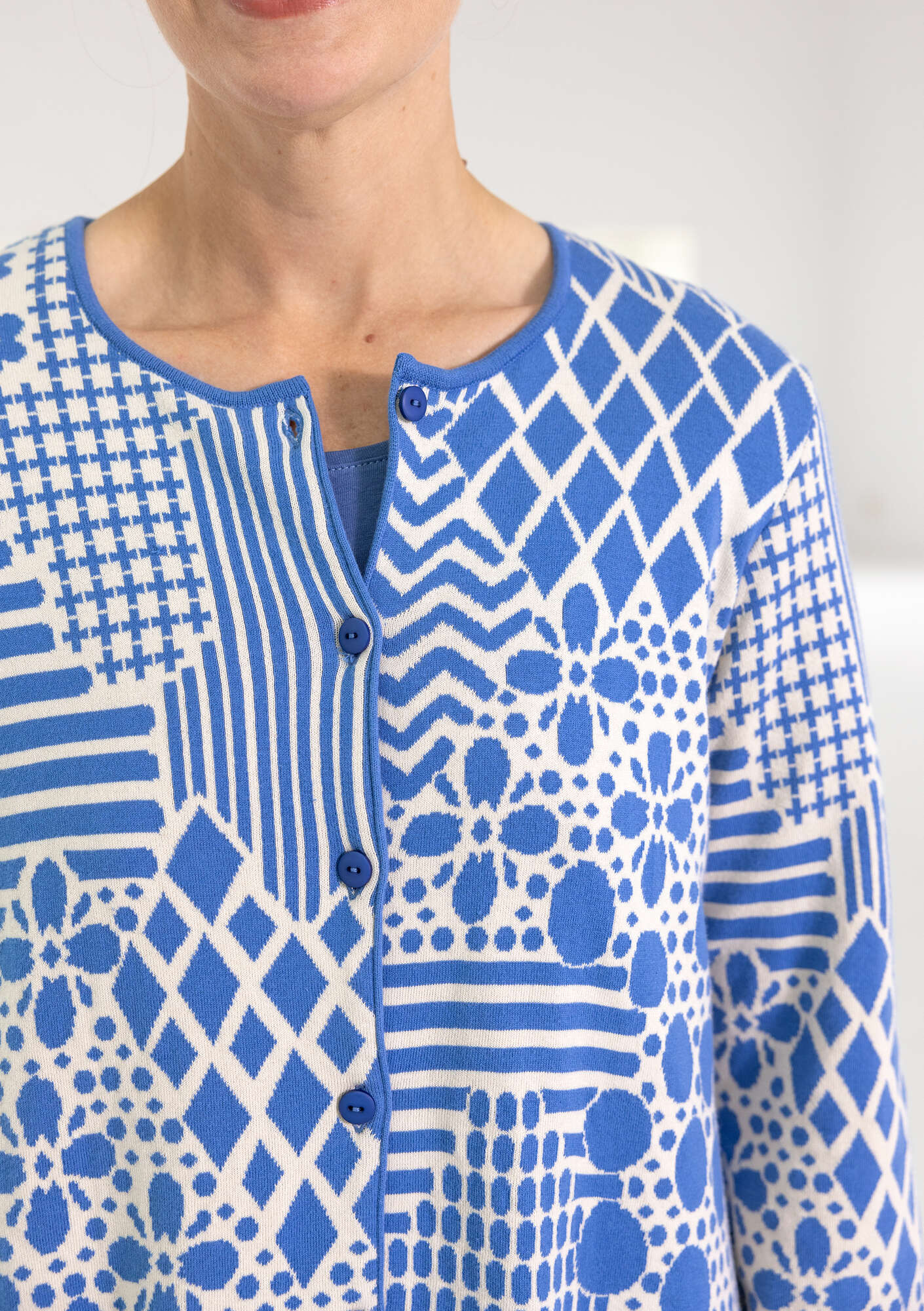 • Jacquard cardigan with full-length sleeves. Double-sided, two-tone pattern in easy-wear colours. Extremely beautiful on the inside too. Subtly designed pockets, striped inside. Dyed buttons.
