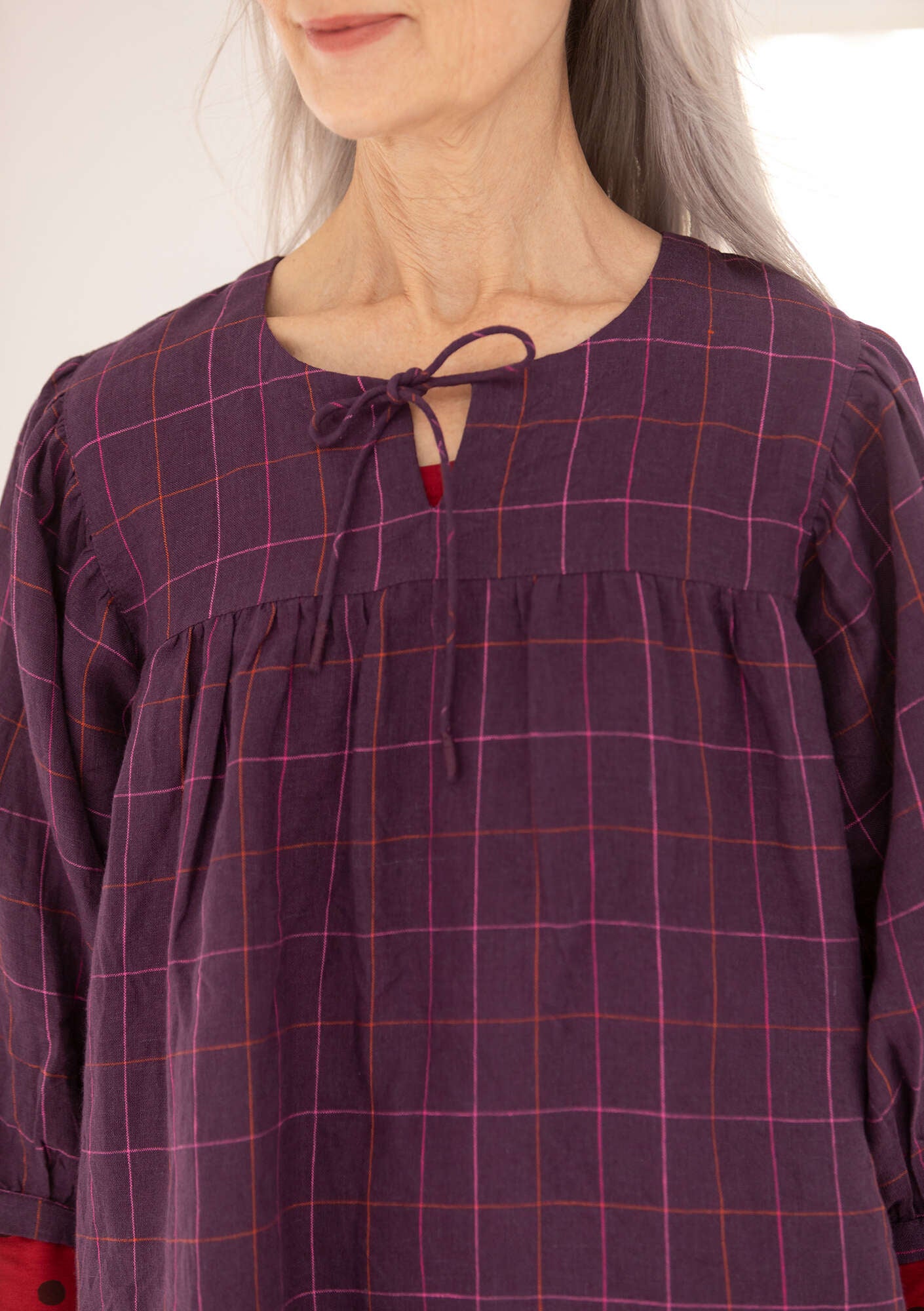 • Whimsical style with a generous fit. Yoke with front slit and tie. Puff sleeves that hit just below the elbow. Comes in solid colours and with a yarn-dyed check print.