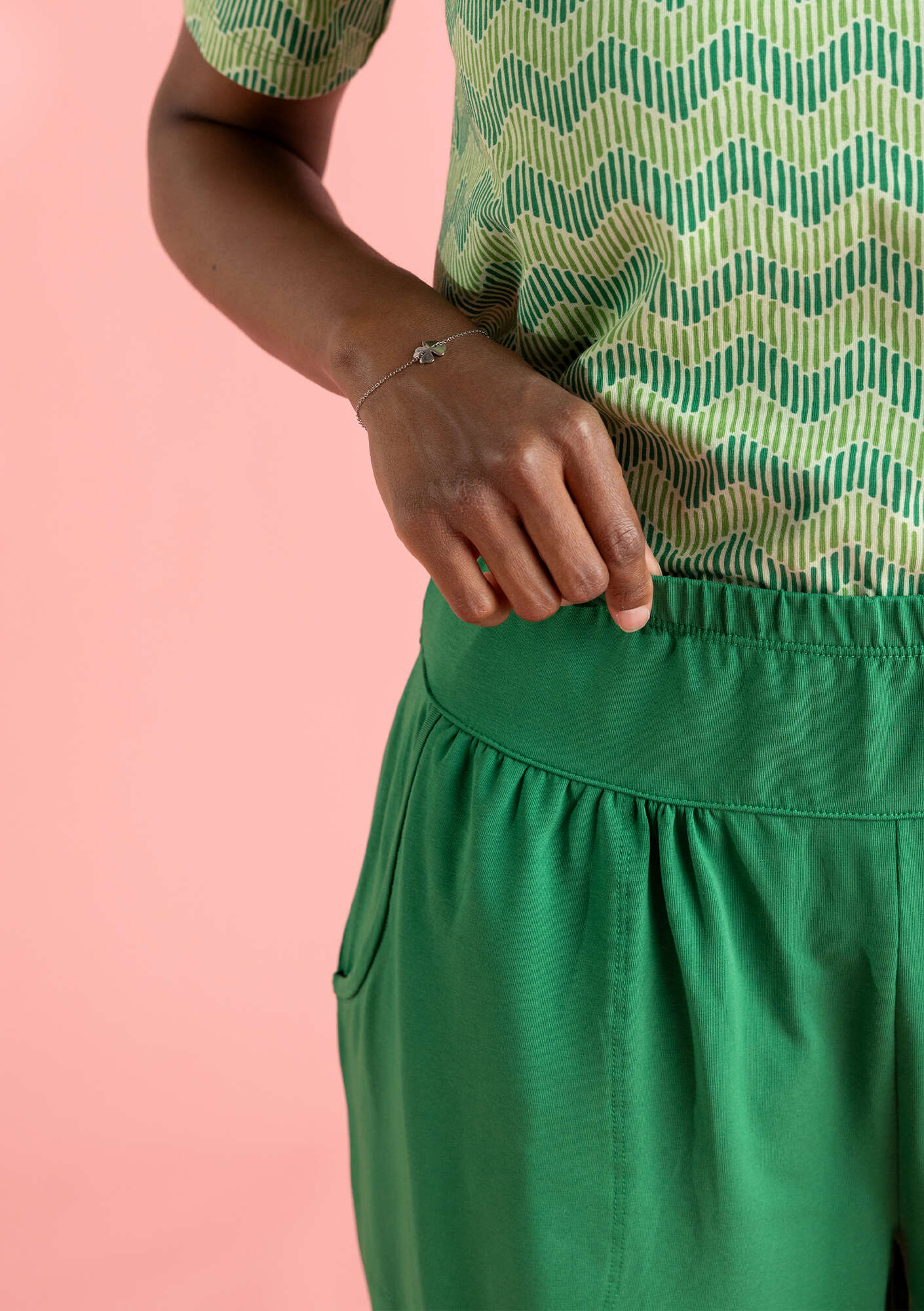 Solid-colour harem trousers with a comfortable elasticated waistband. Practical side pockets.