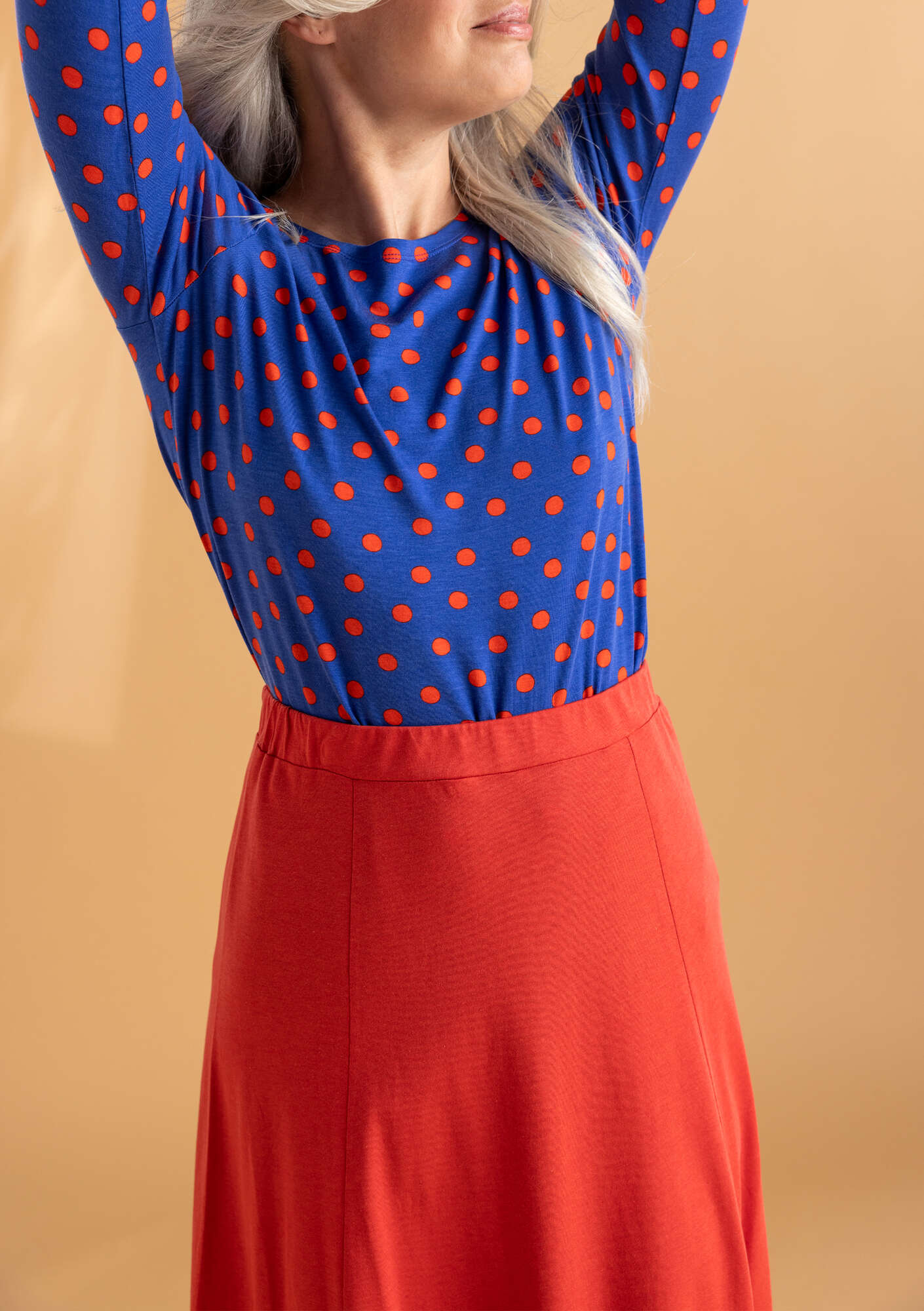 A simple, solid-colour style. Constructed in panels, the skirt drops from a smooth waistline into a flared silhouette. Elastic sewn in the waist.