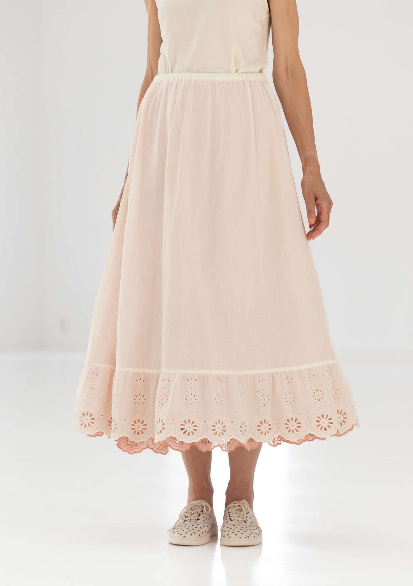A simple style with elasticated waist and floral broderie anglaise along the hem. A small button allows the elastic to be adjusted for a personal fit.