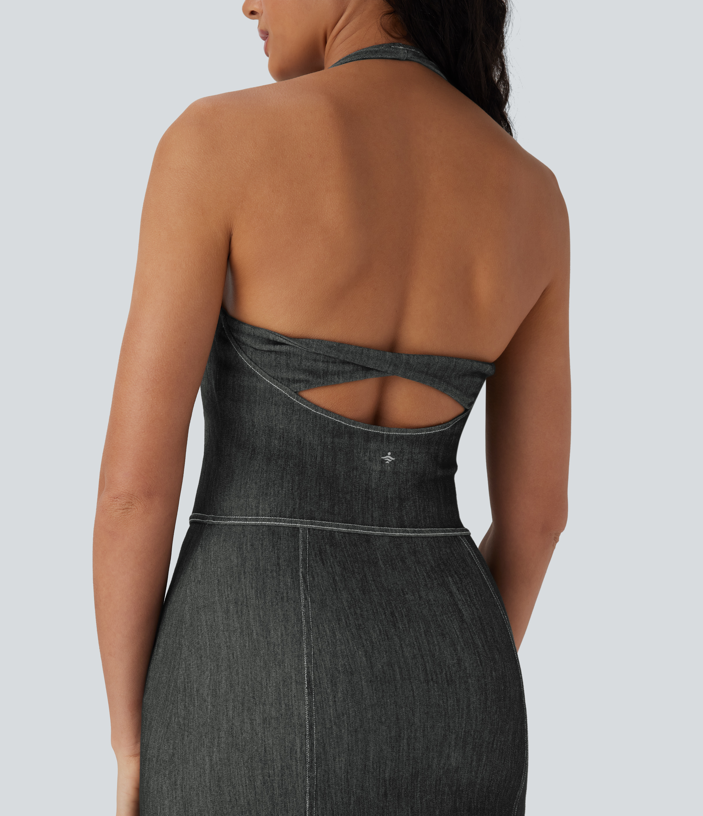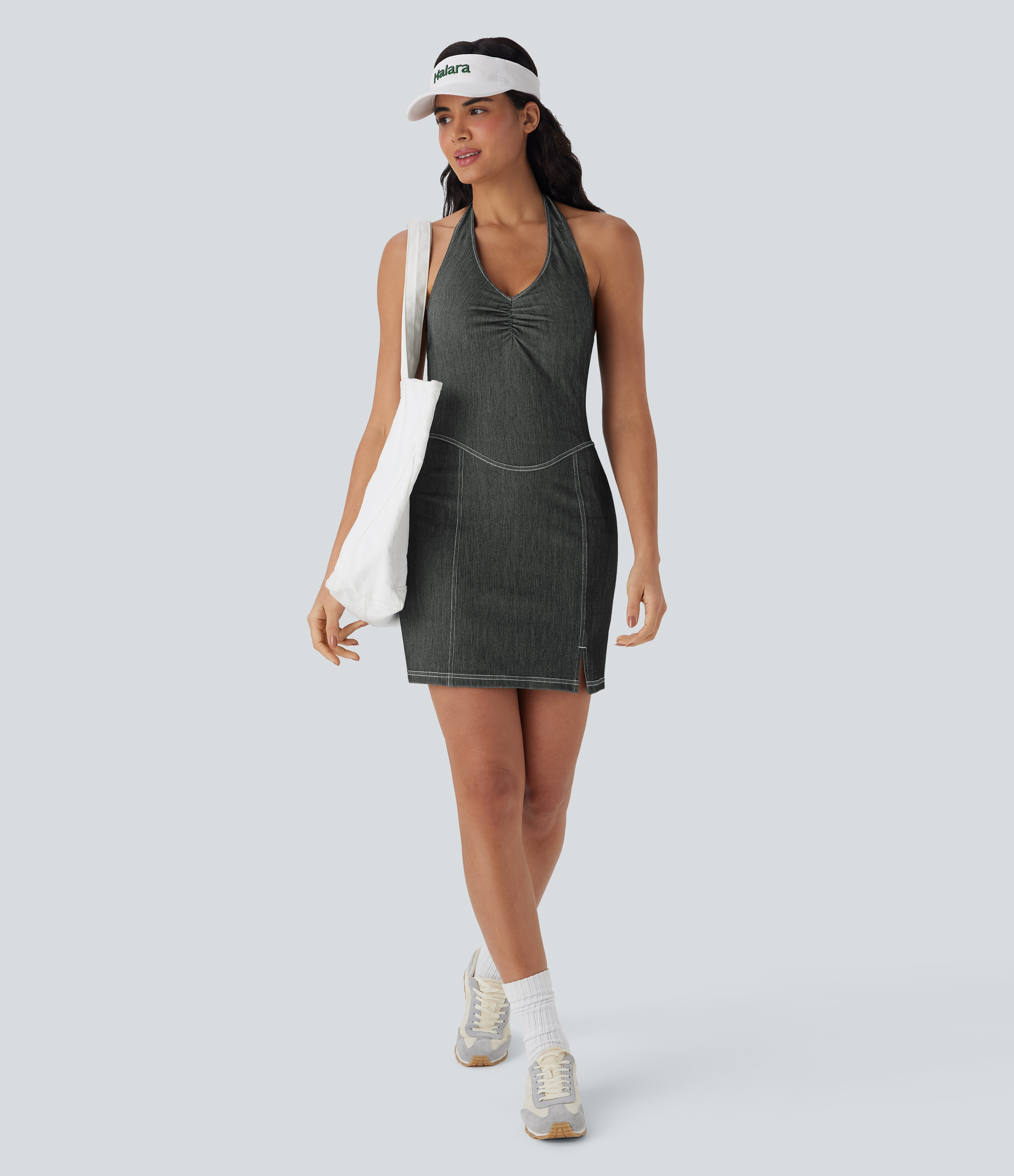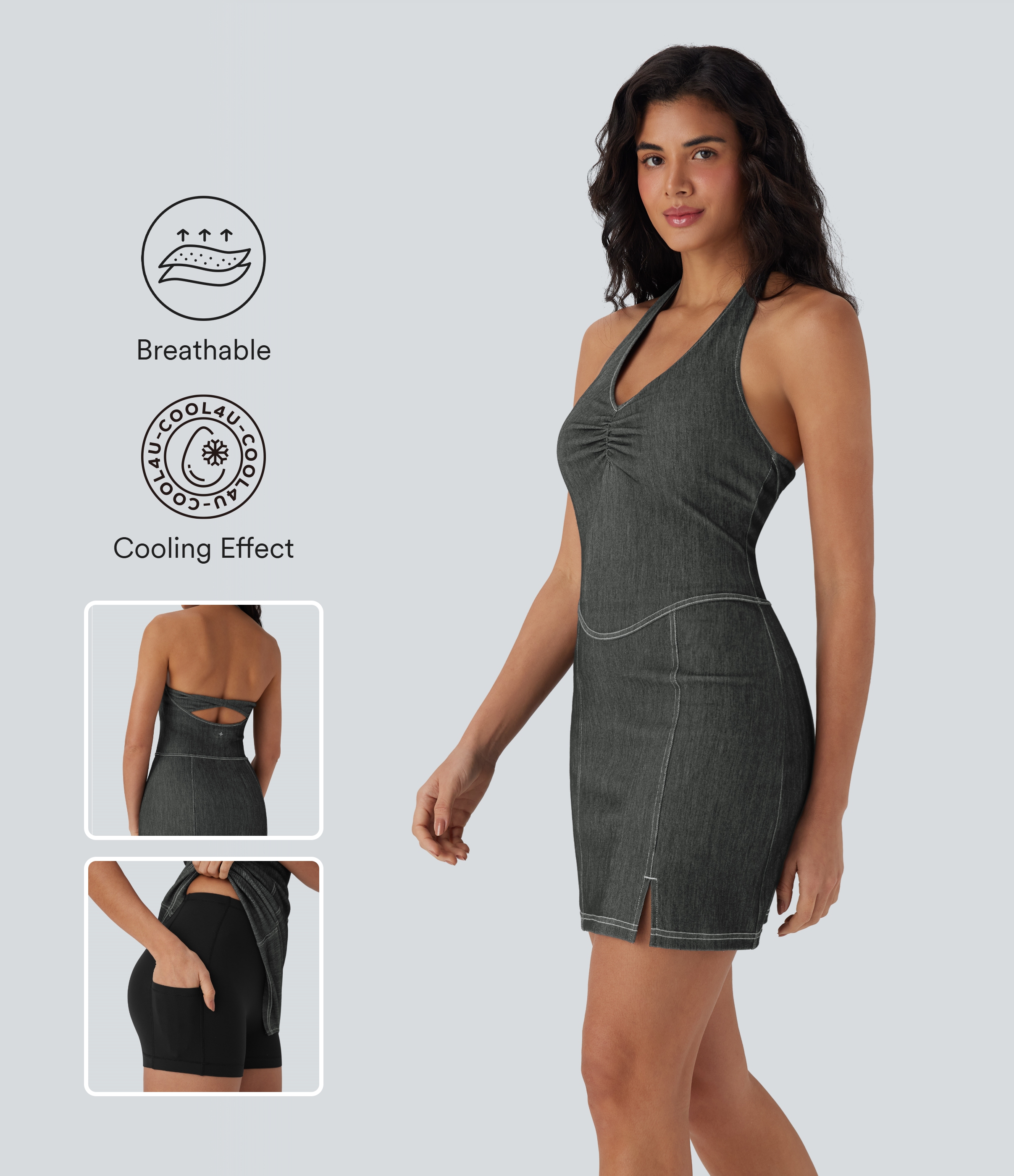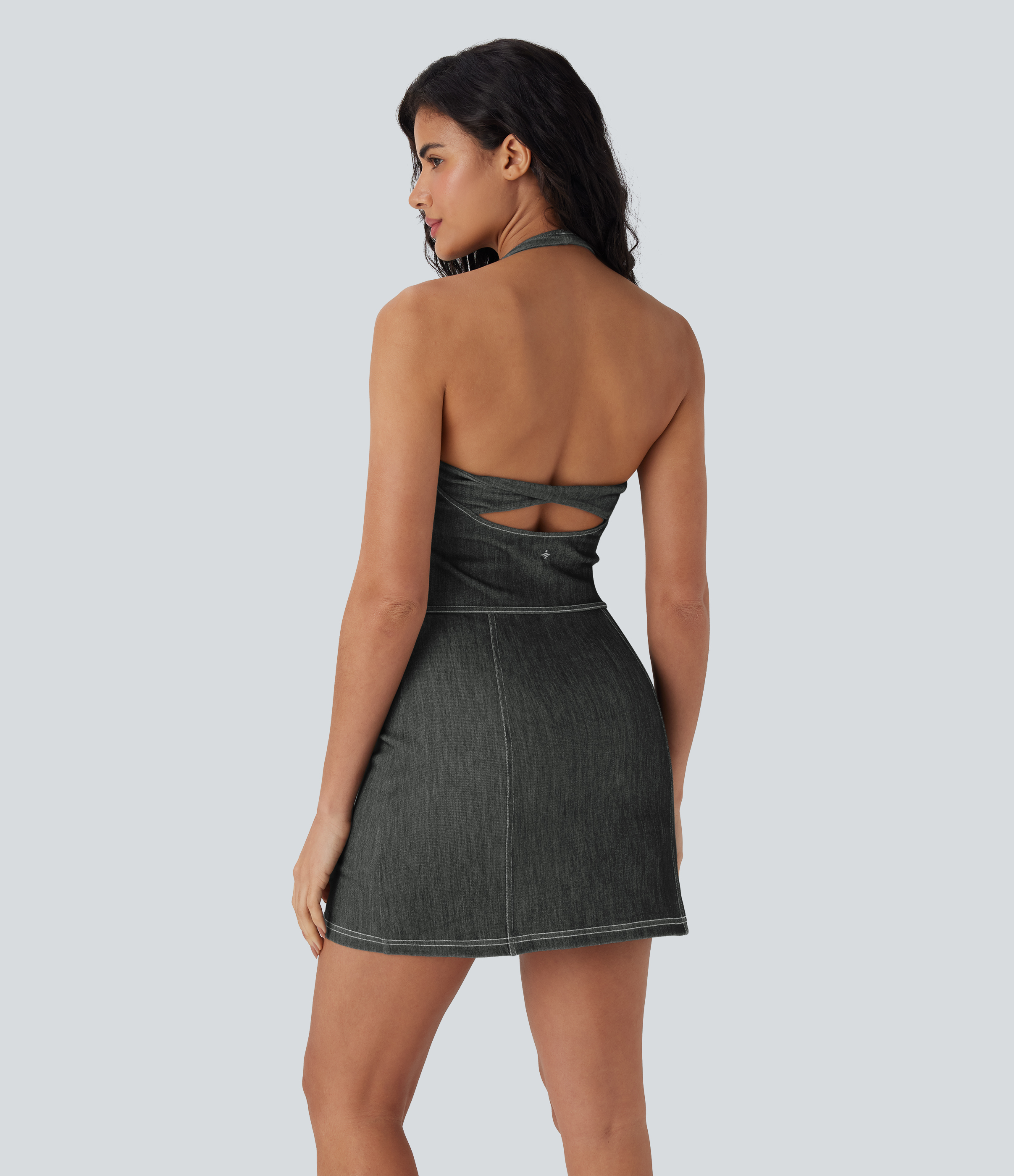 • Halara FlexTM Halter Bodycon 2-Piece Cool Touch Washed Denim Mini Tennis Active Dress with Pockets