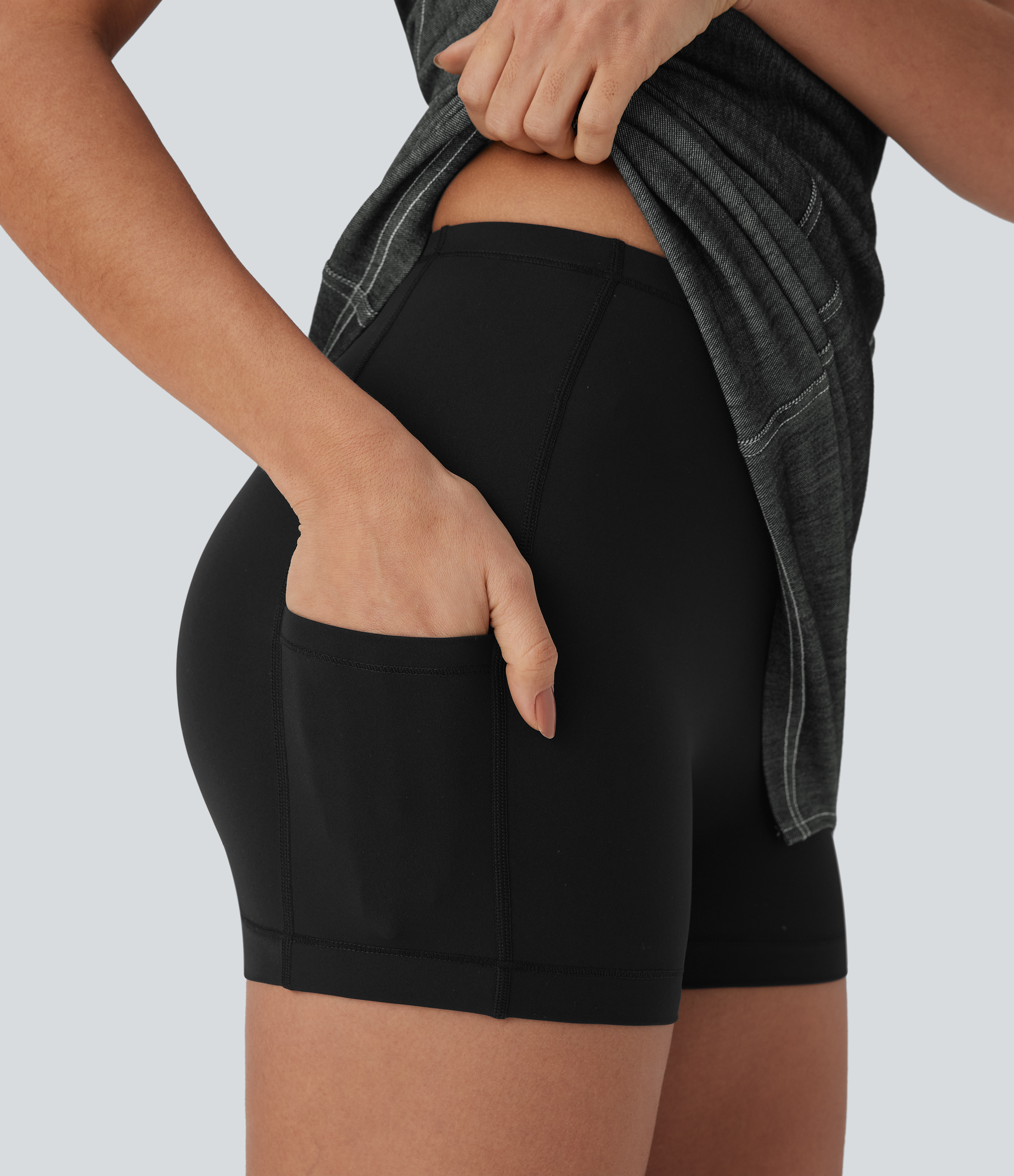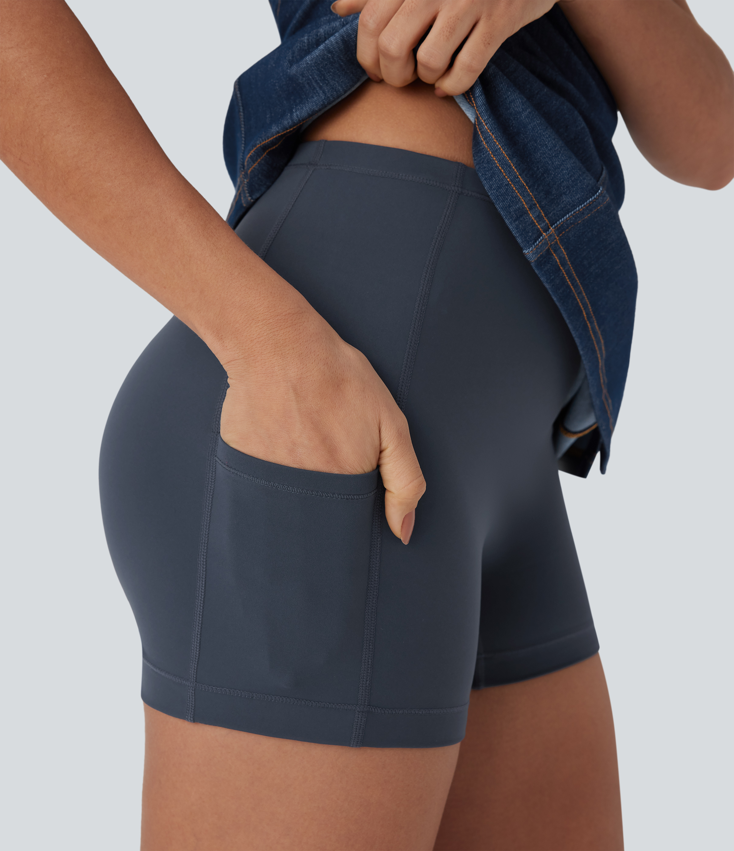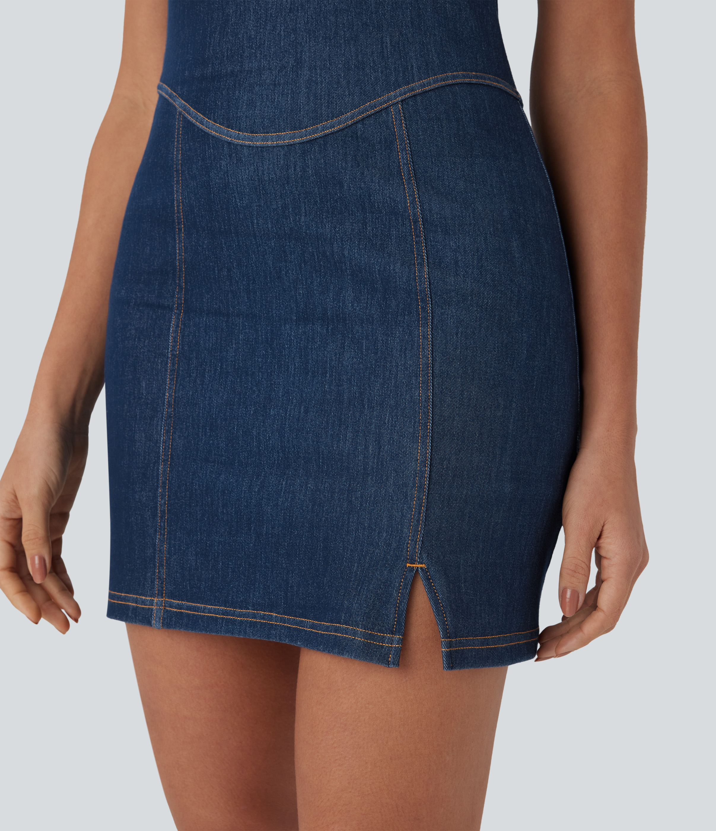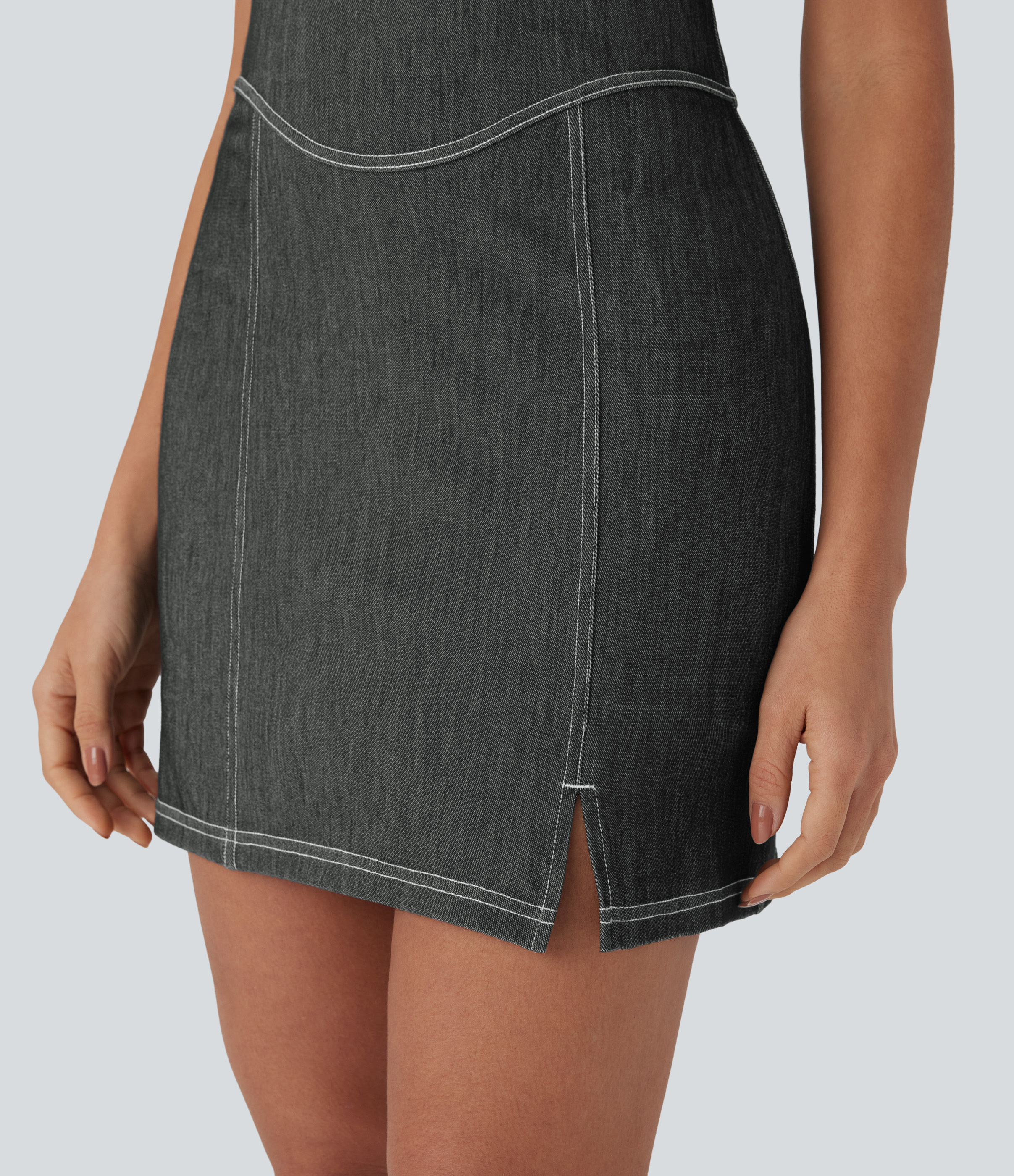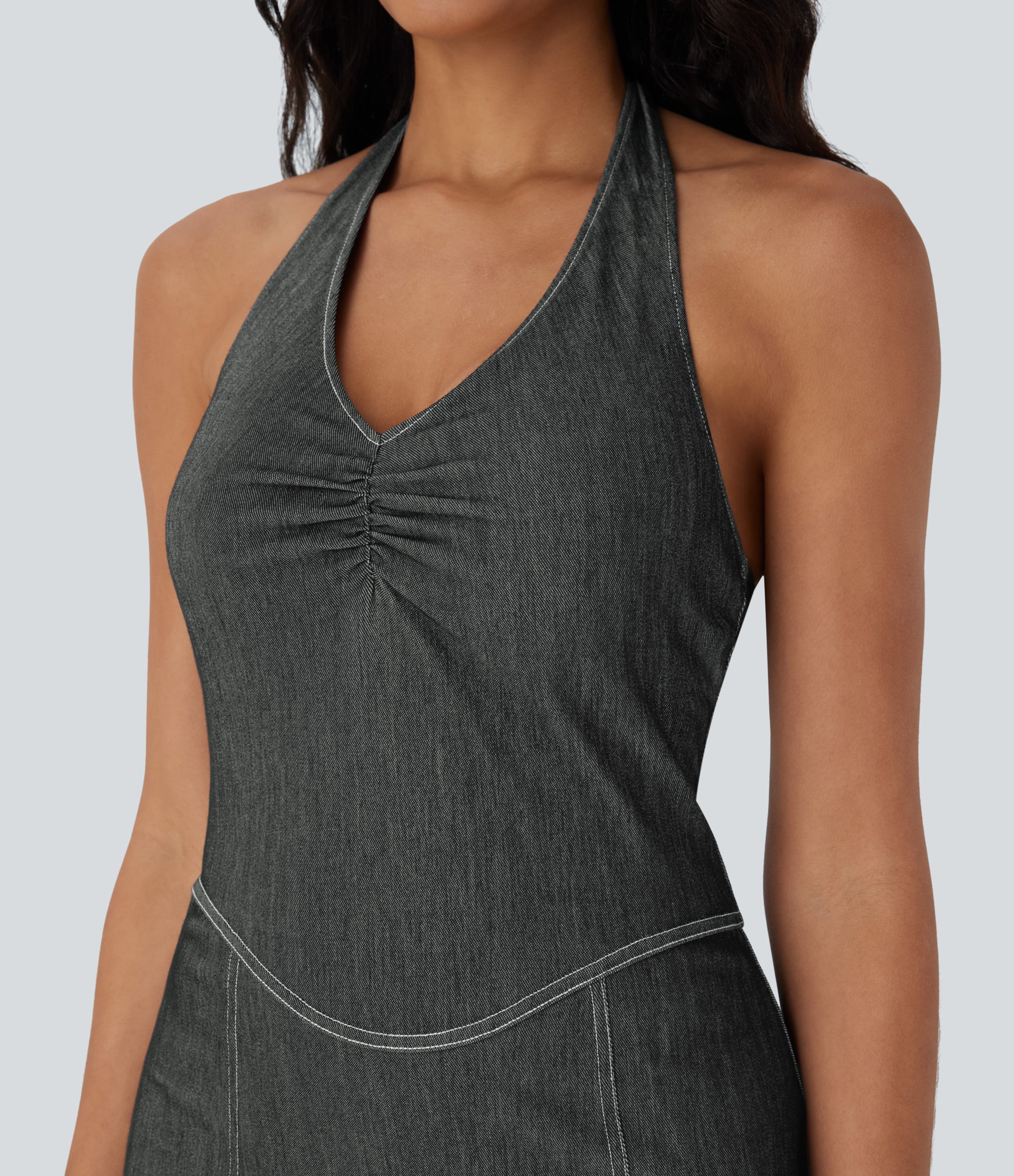 • Halara FlexTM Halter Bodycon 2-Piece Cool Touch Washed Denim Mini Tennis Active Dress with Pockets