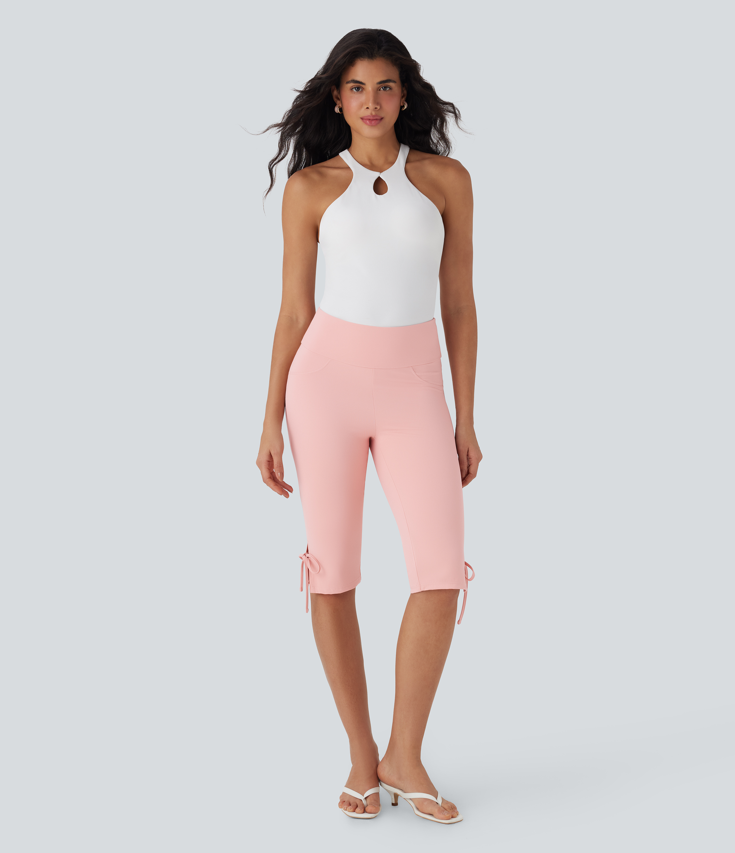 Mid Rise Lace Up Capri Casual Pants with Pockets