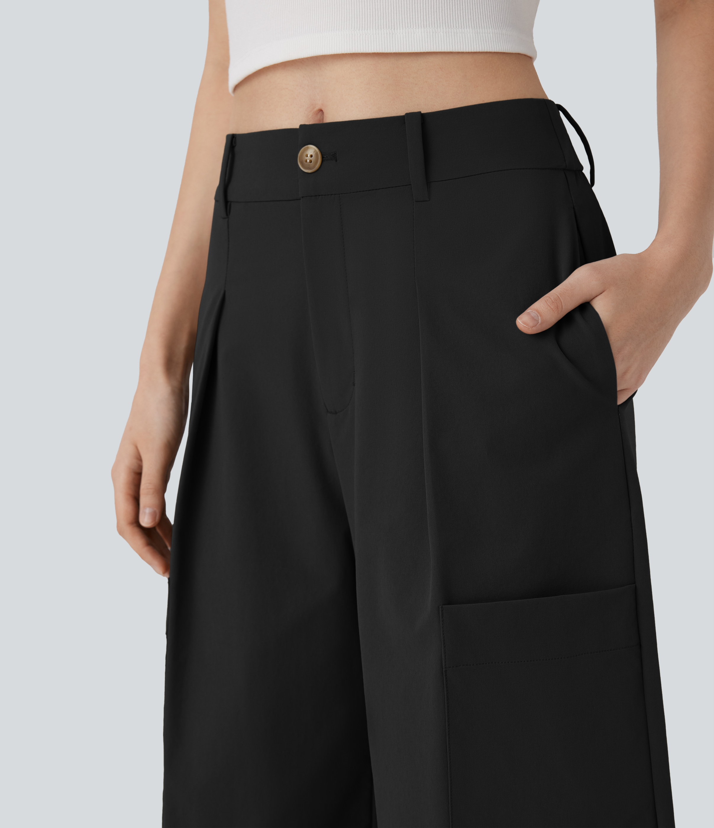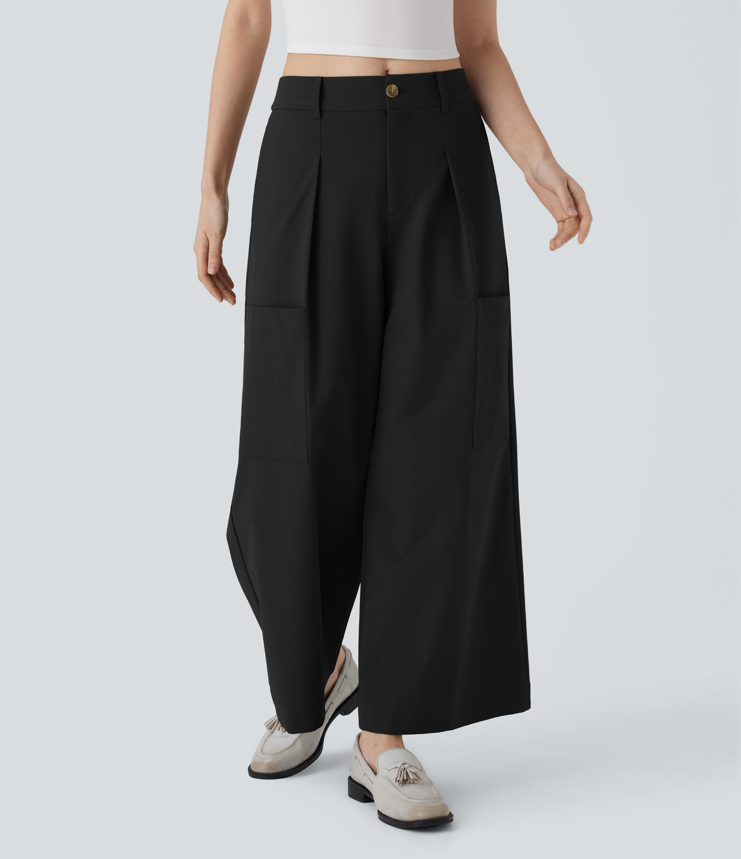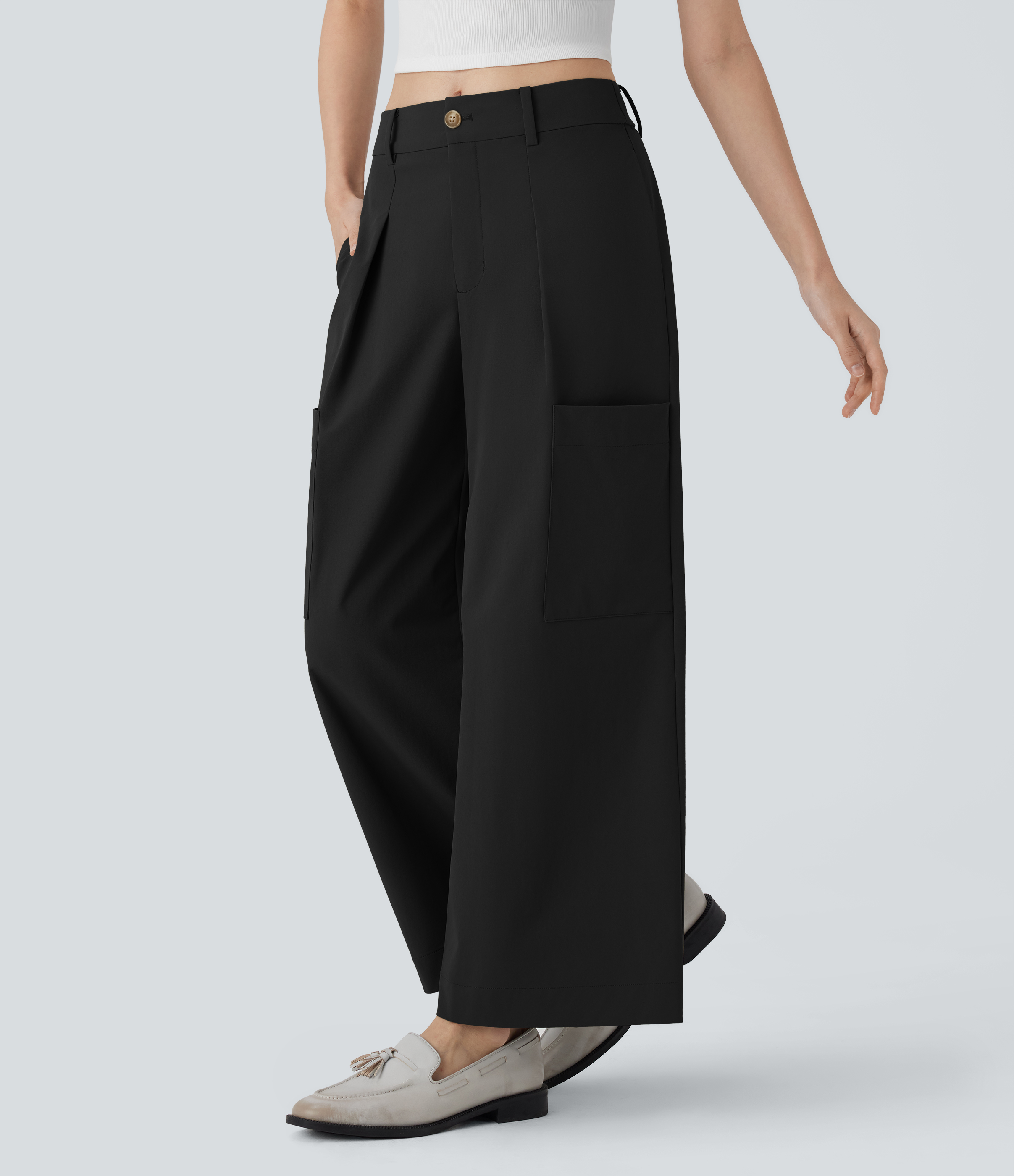 - Wide leg style gives a timeless look, while providing comfortable wear.