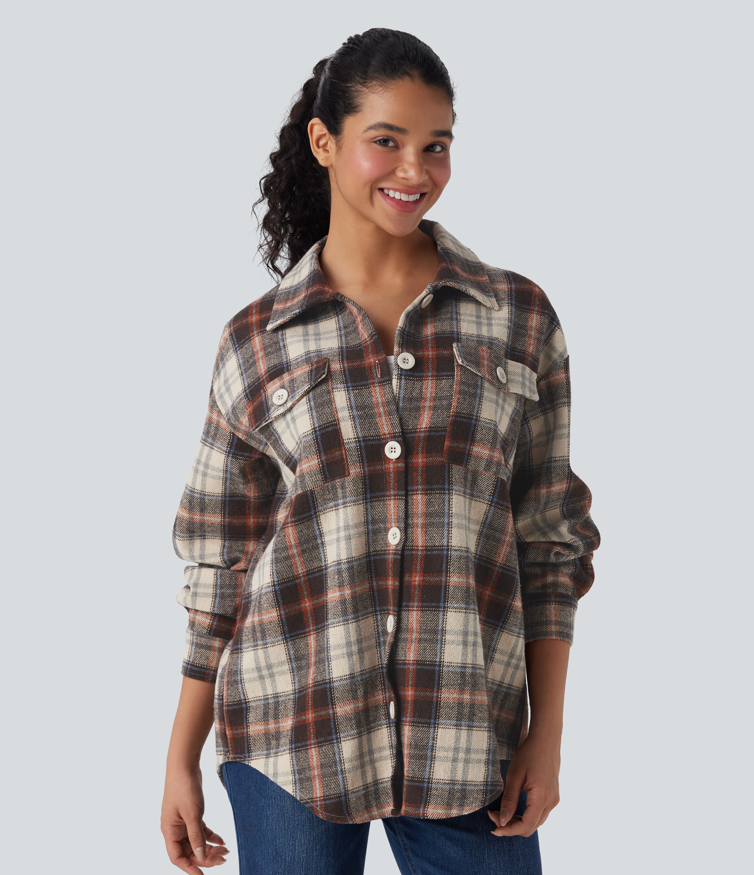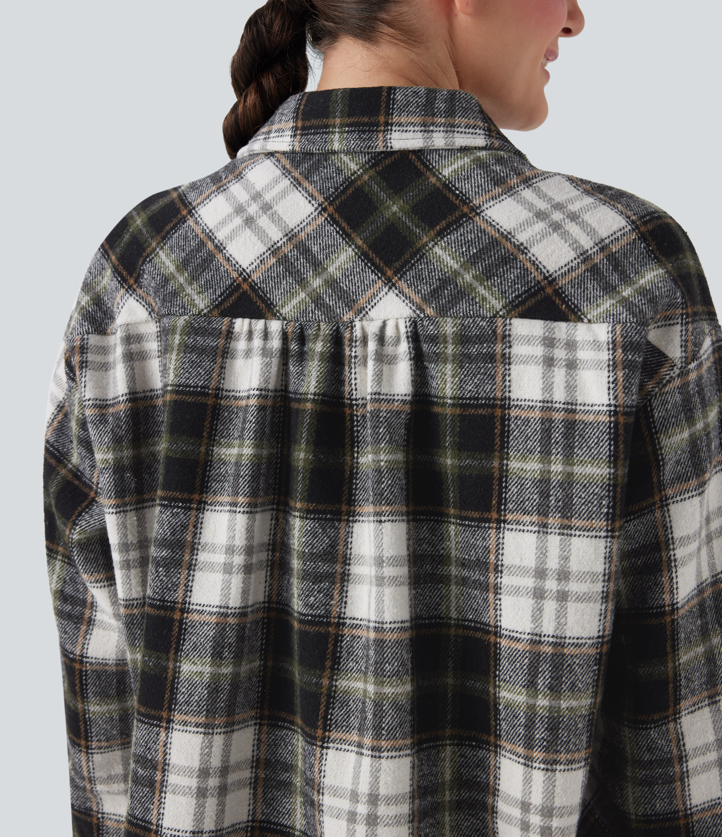 - Plaid patterning in multi-colored tartan design for a bold and versatile look.