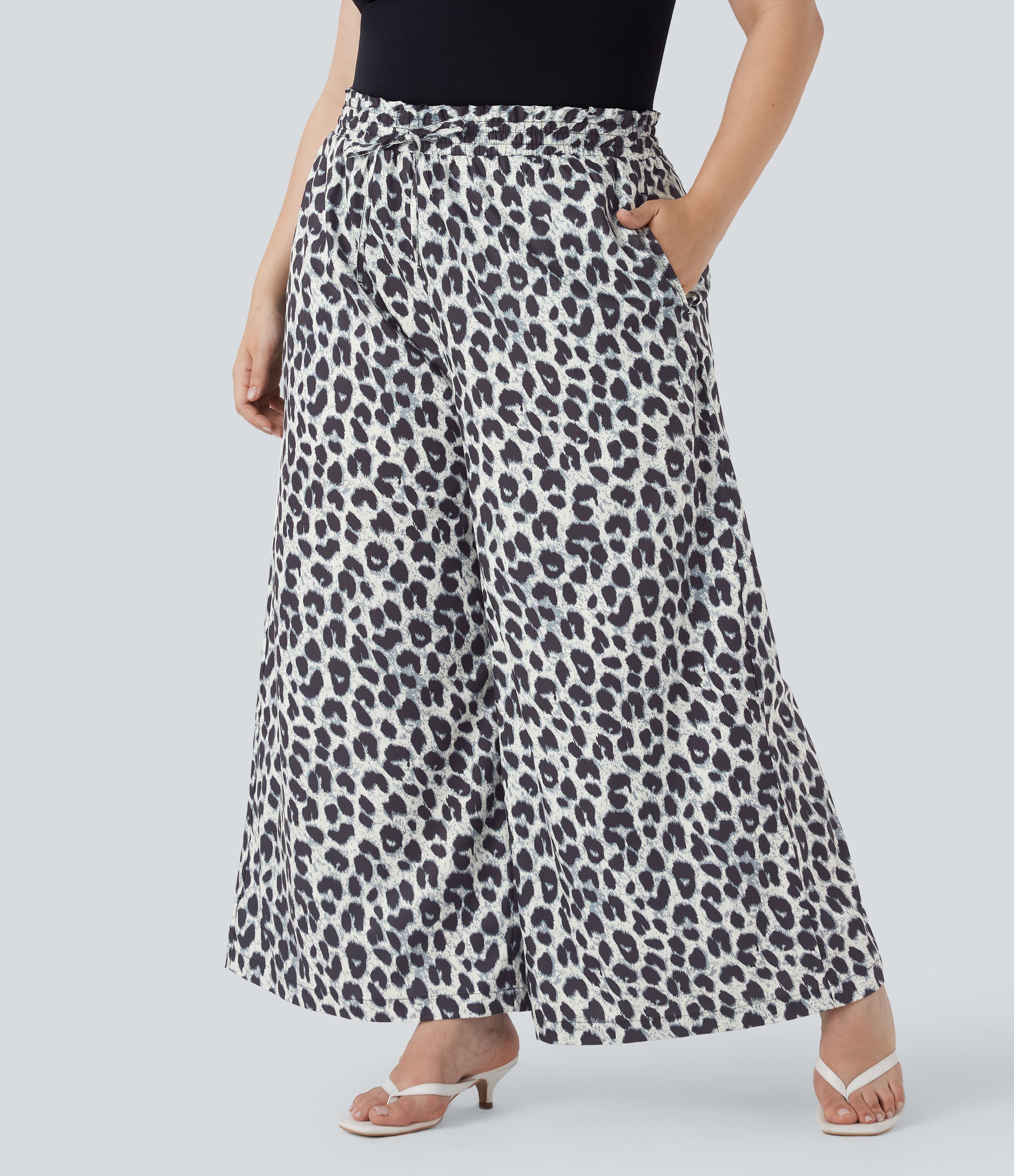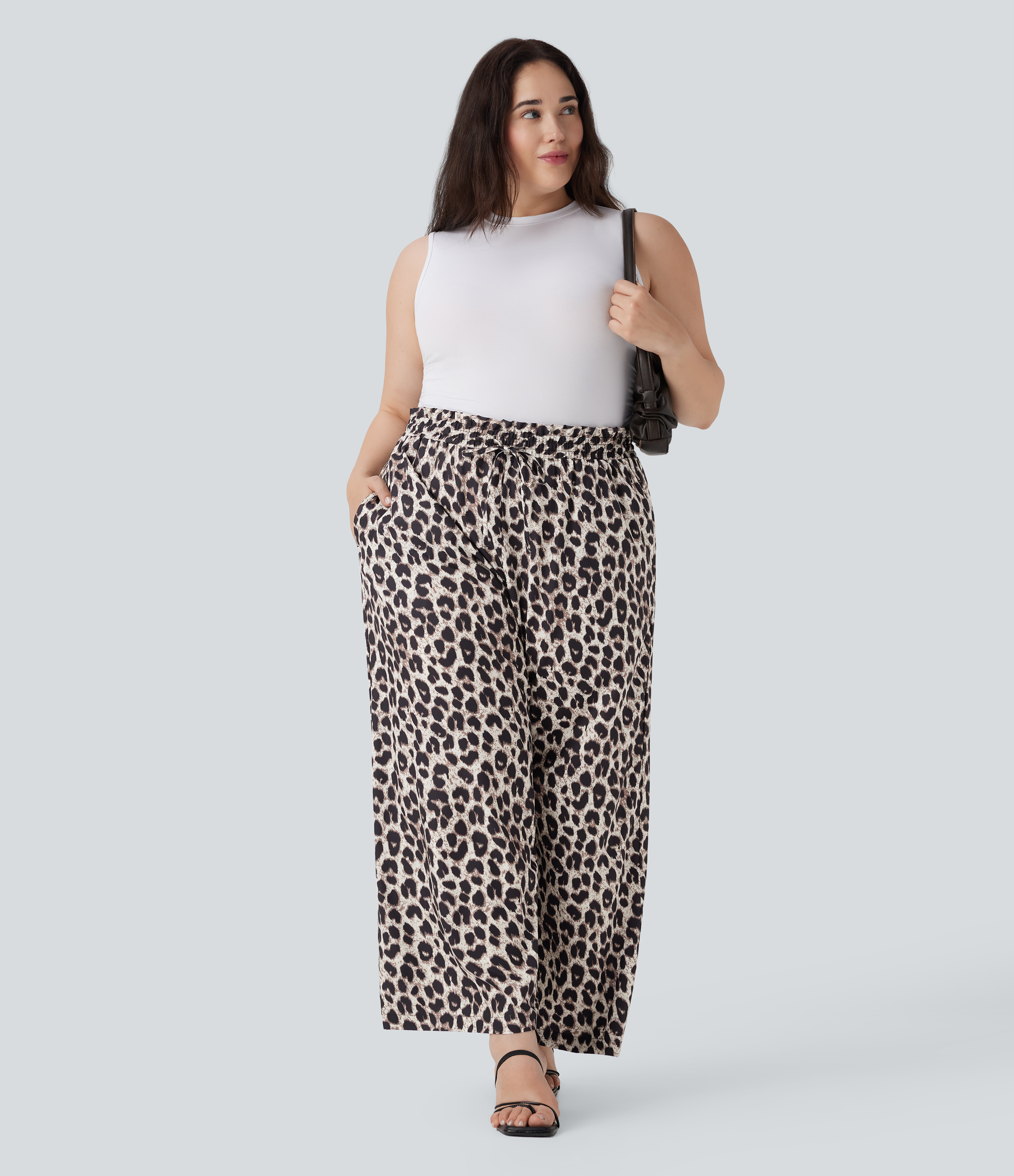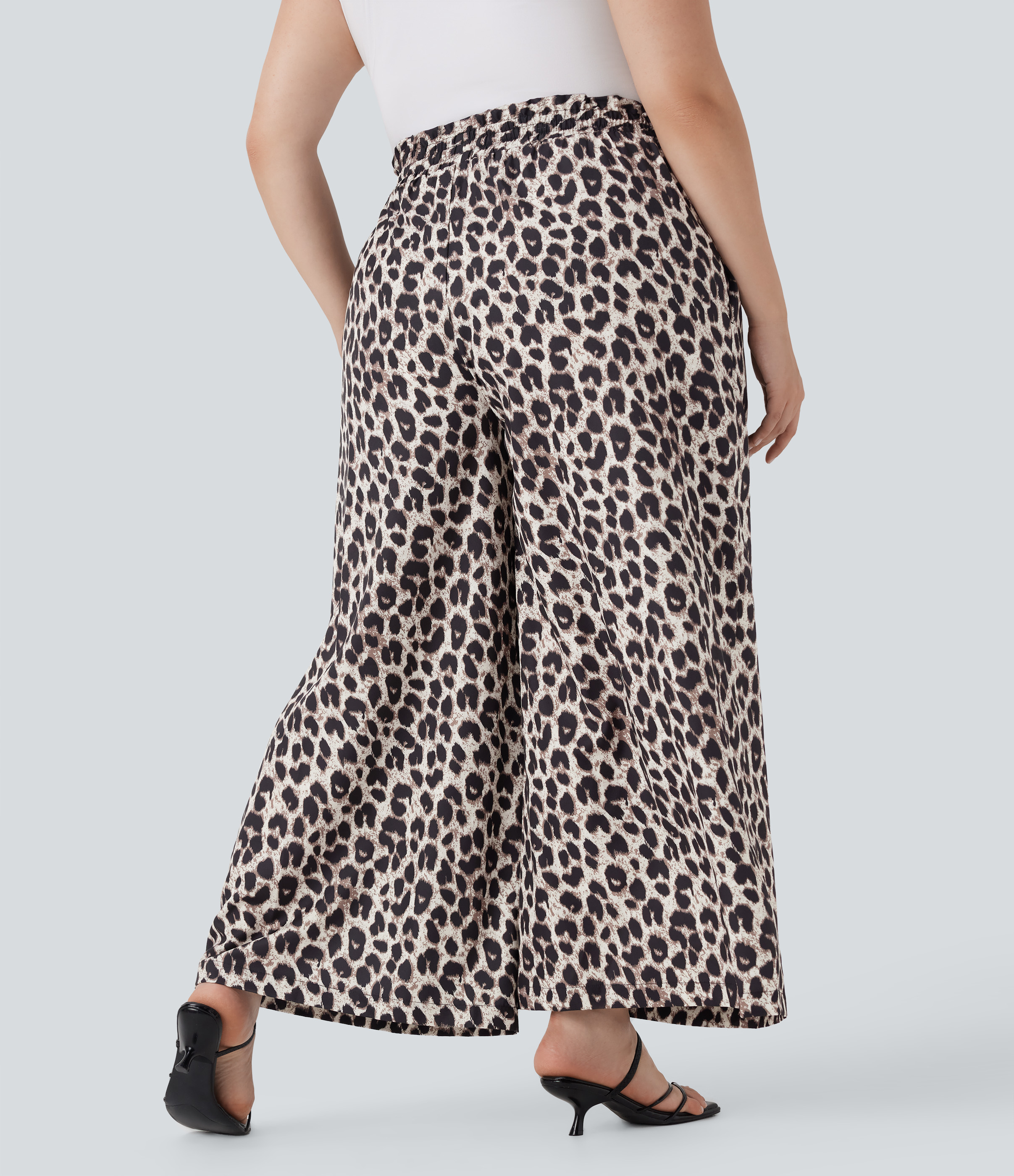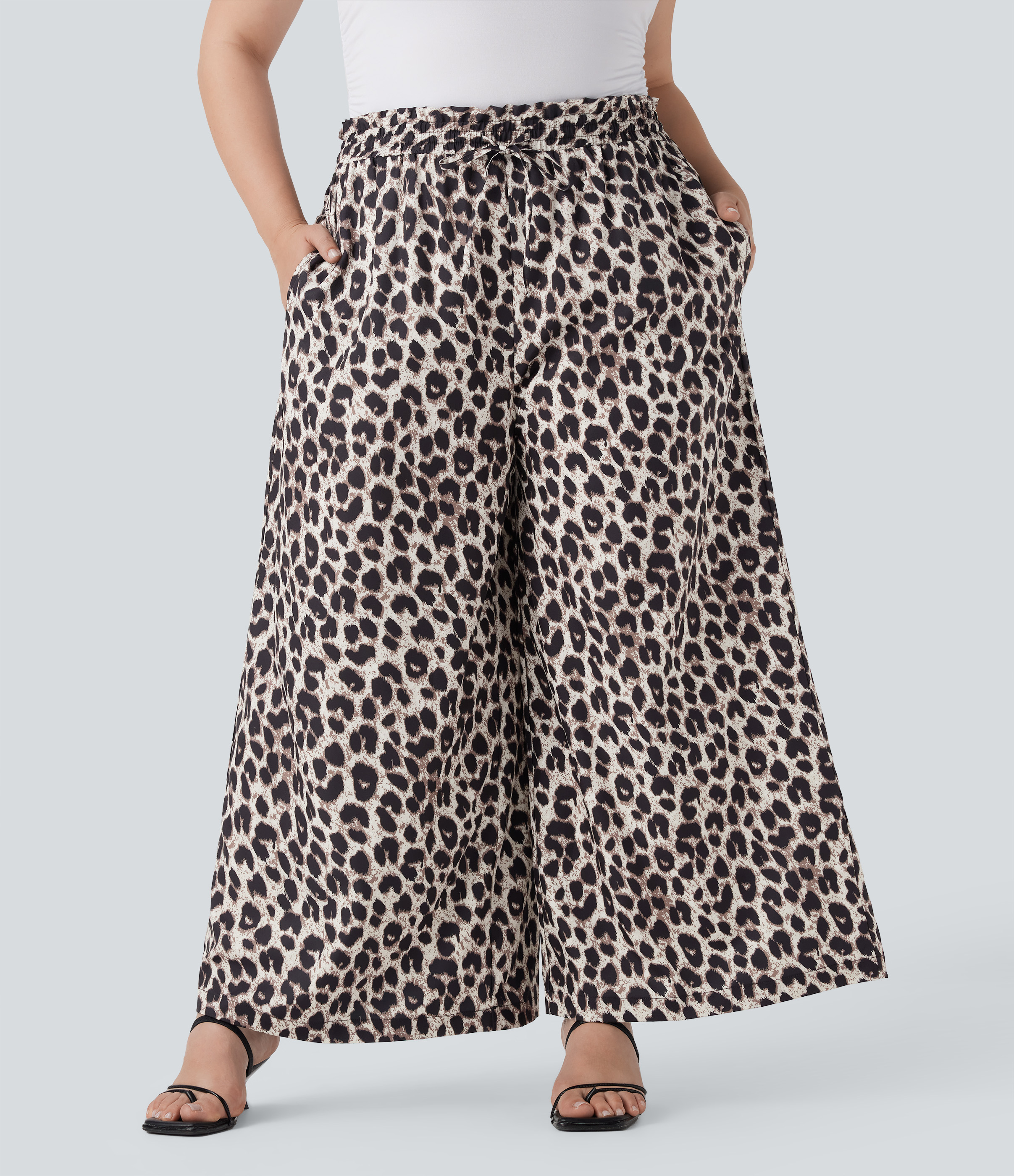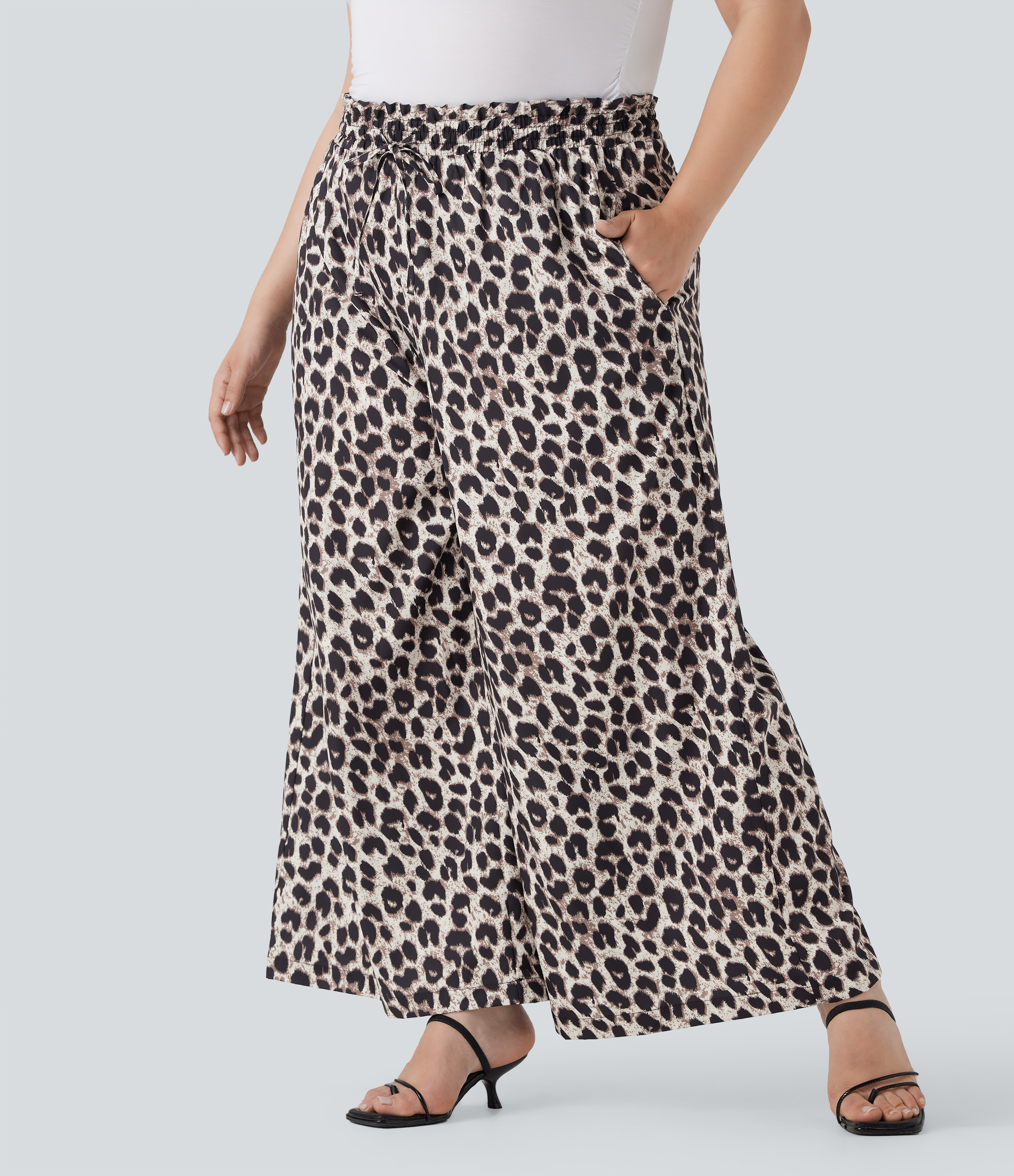 • Plus Size High Waisted Drawstring Leopard Print Wide Leg Casual Pants with Pockets