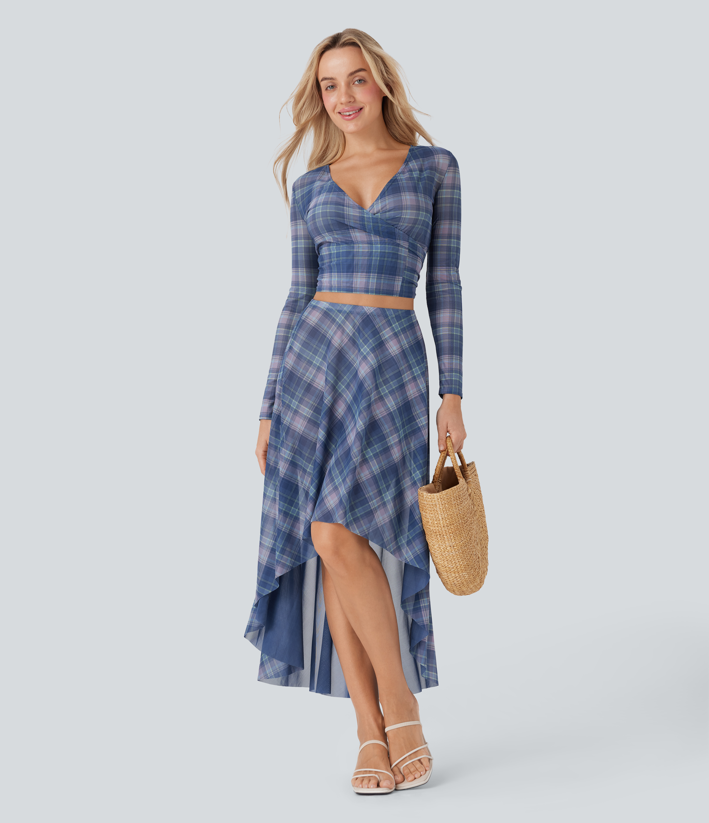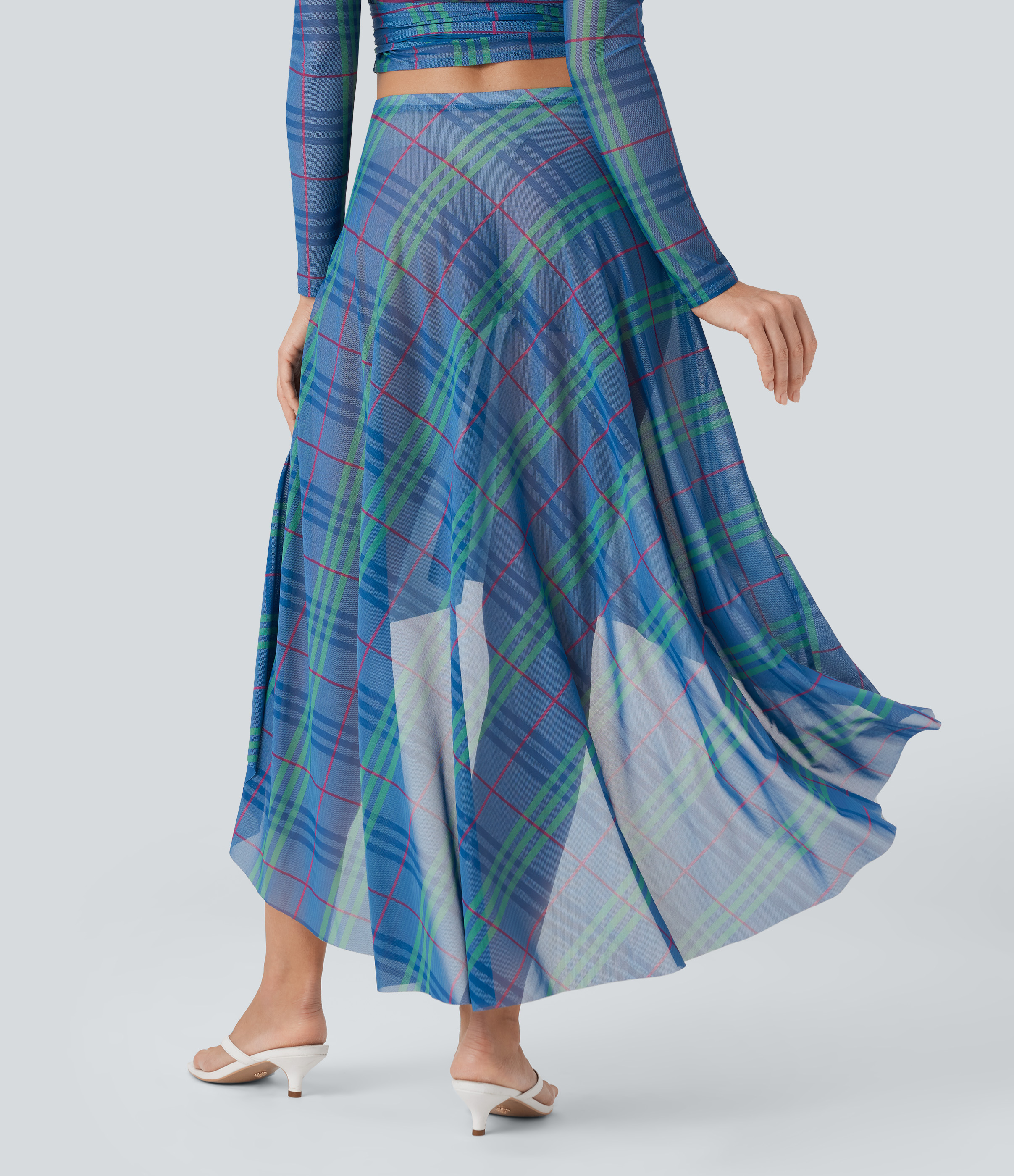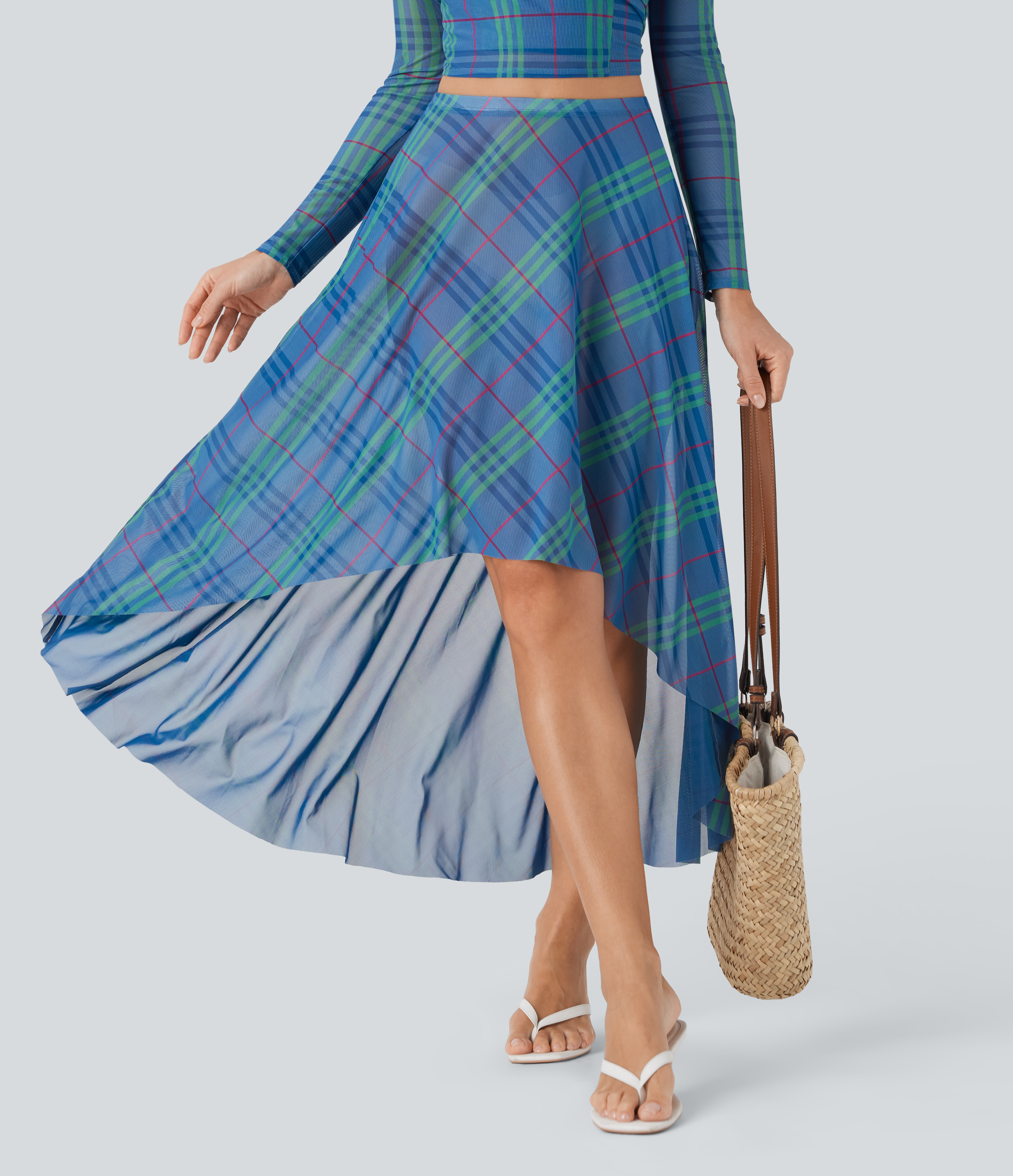 - Plaid patterning in multi-colored tartan design for a bold and versatile look.