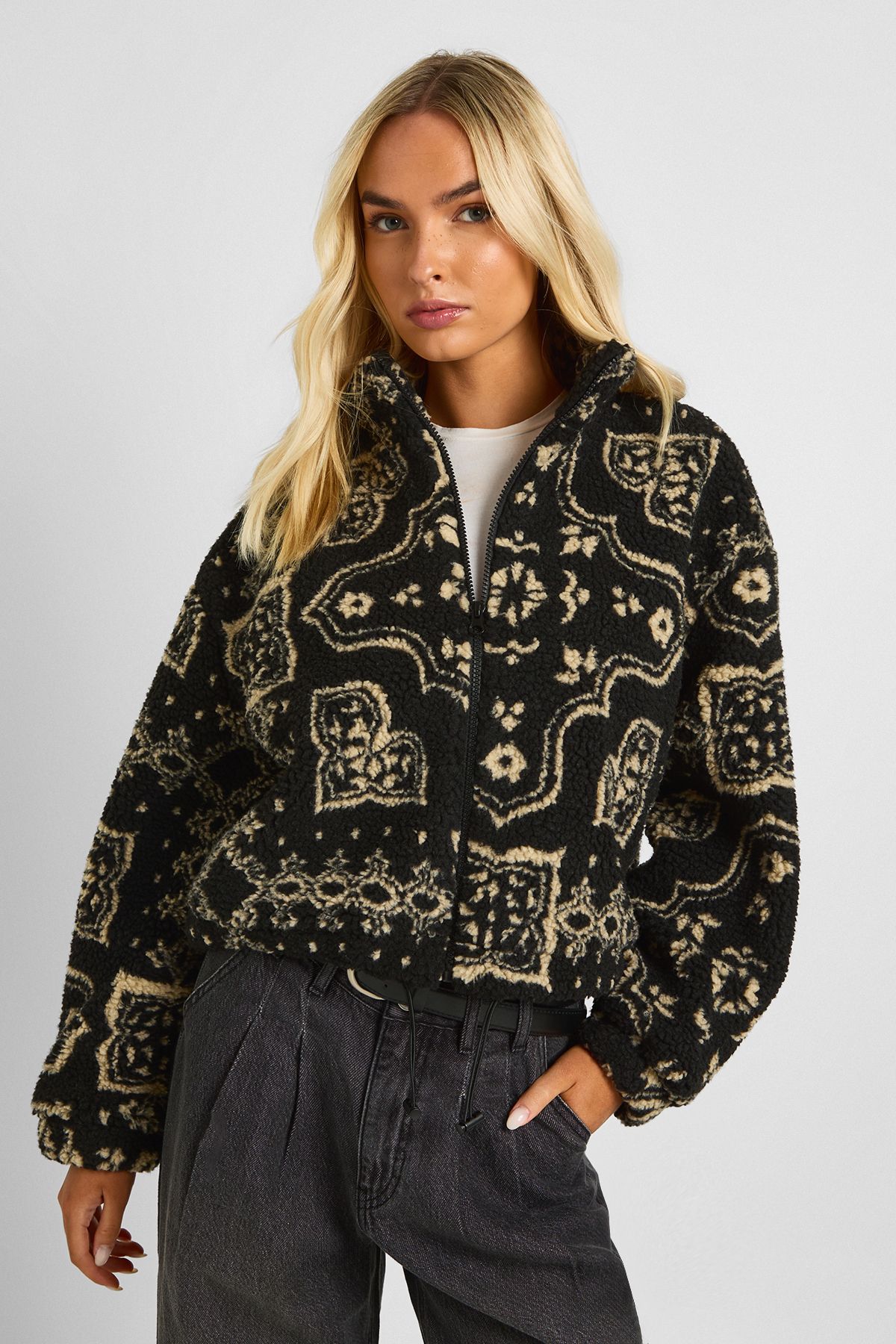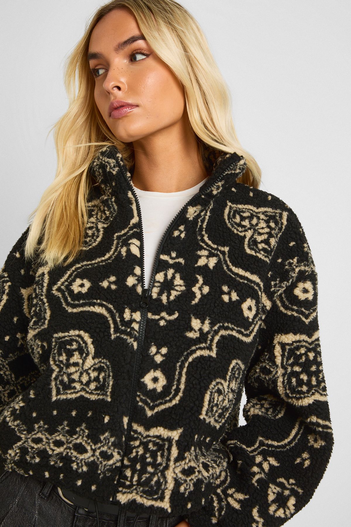• Ribbed collar, cuffs and hem for a classic bomber jacket finish Make a statement with this distinctive Bandana Teddy Zip Bomber Jacket that combines comfort with on-trend style. The bold bandana print creates visual interest whilst the soft teddy texture adds a tactile dimension to your casual wardrobe. Style with wide-leg denim trousers and a simple white tee for an effortlessly cool daytime look, or throw over a casual dress with trainers for weekend brunches. The cropped length works brilliantly with high-waisted bottoms, creating a balanced silhouette. Perfect for transitional weather, this jacket is ideal for family gatherings, casual coffee dates or festival outings. The versatile design allows for easy customisation of your look - wear fully zipped for maximum impact of the print or open over layers when the temperature rises.