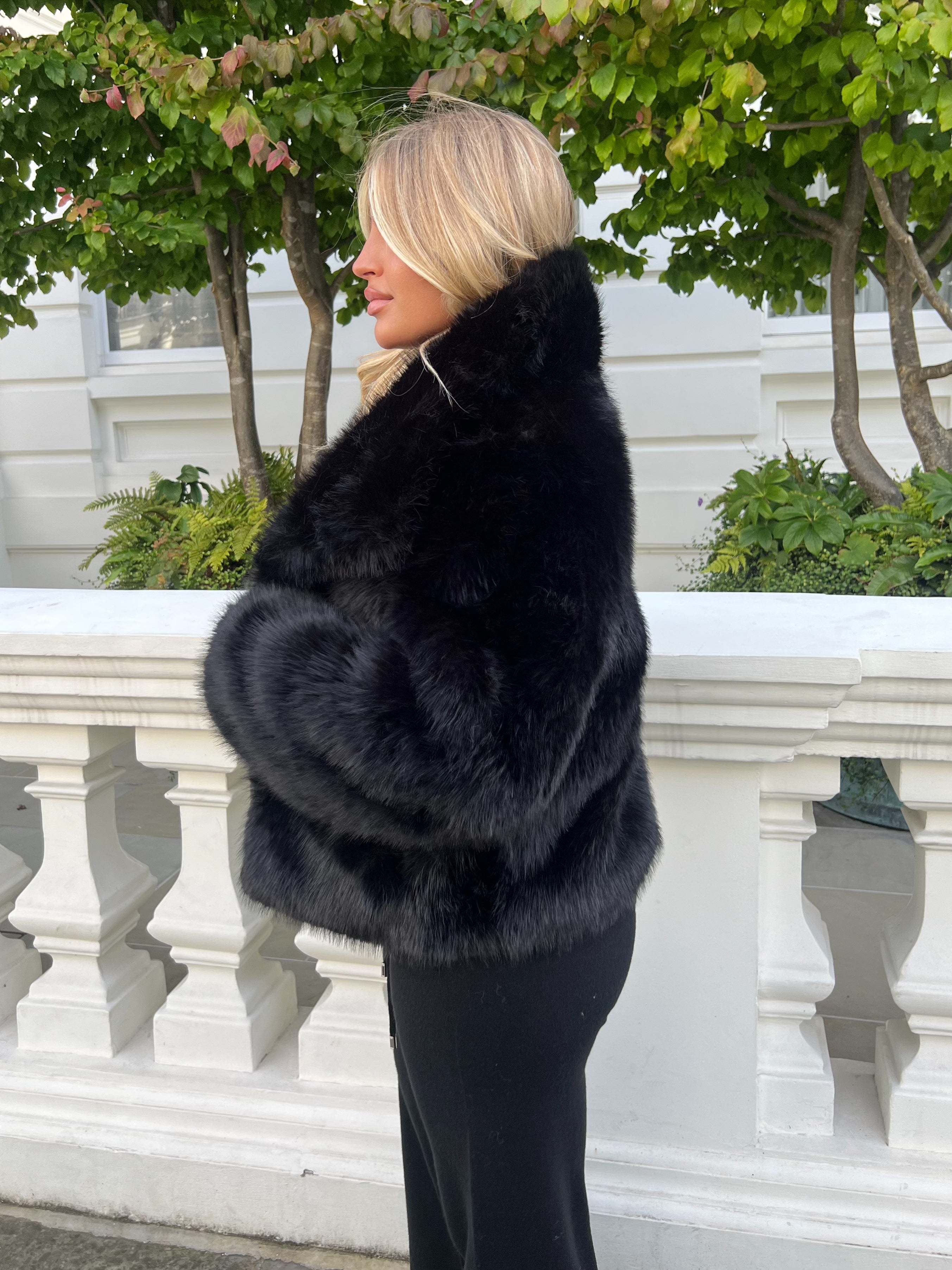 Expertly crafted with a large, luxurious collar and long sleeves for warmth and style. Made from premium faux fur, this elegant jacket is both fashionable and functional. Fastens securely with a hook and eye closure. Stay stylish and cozy this season with our Premium Faux Fur Collared Jacket.