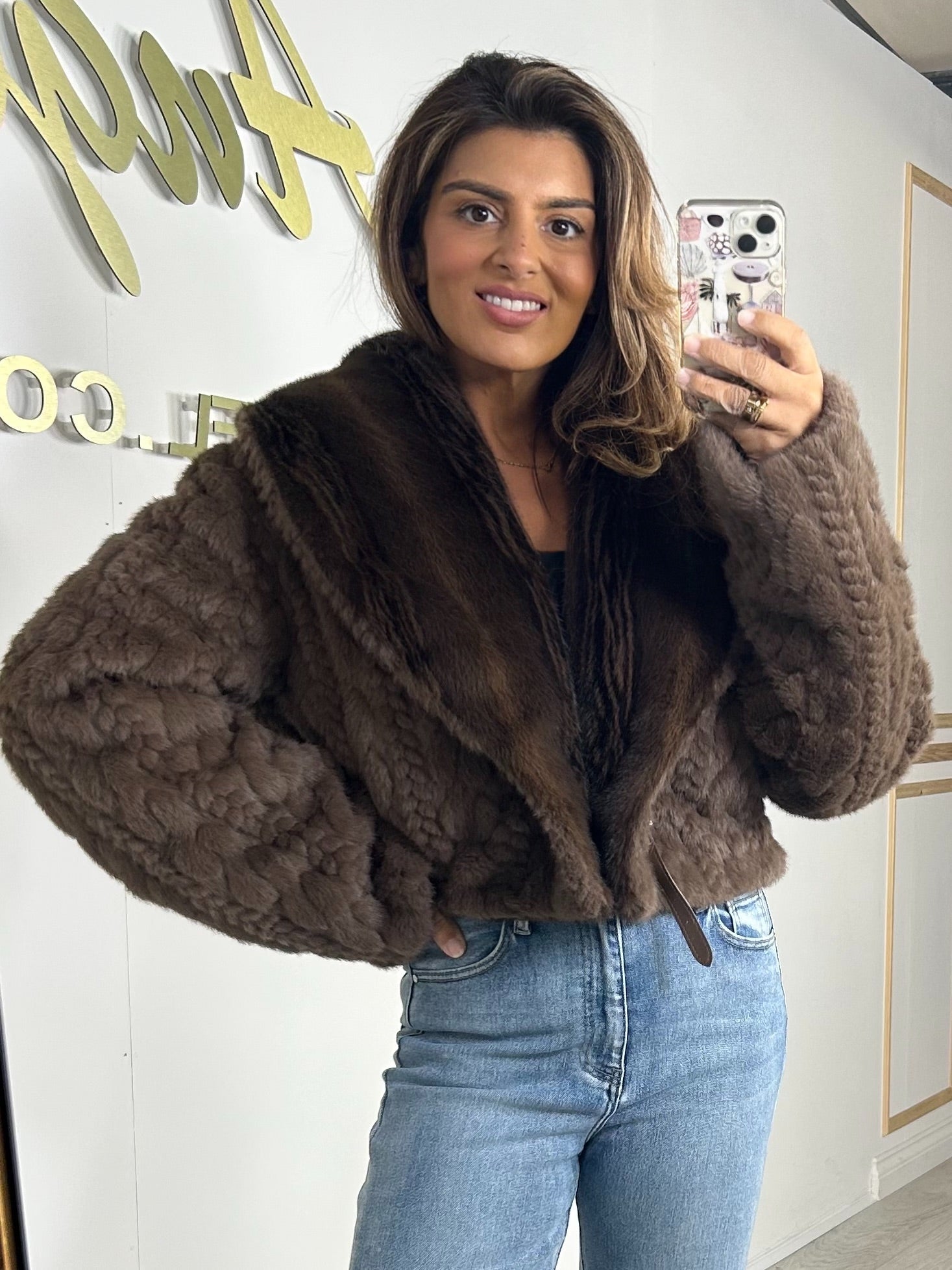 Cable Knit Faux Fur Collared Belted Cropped Jacket