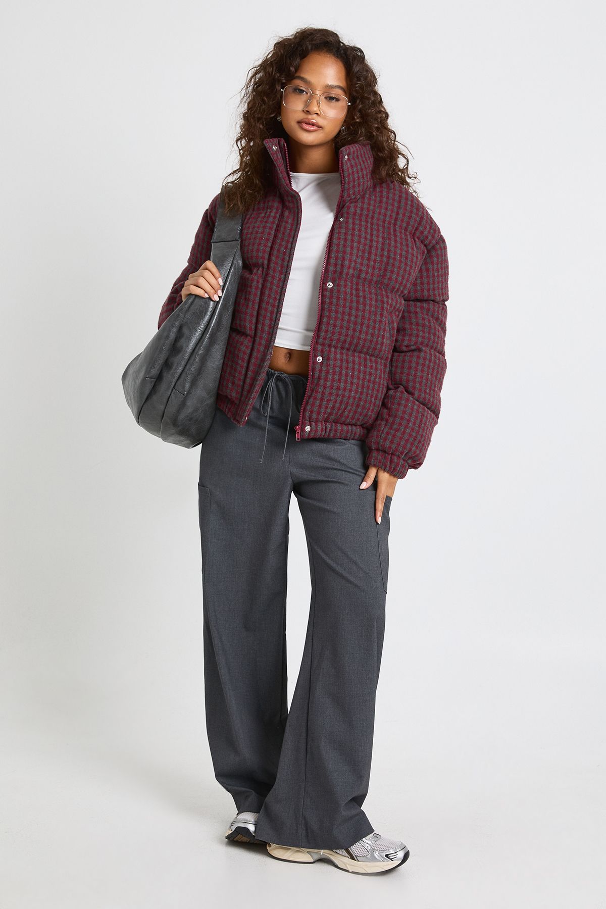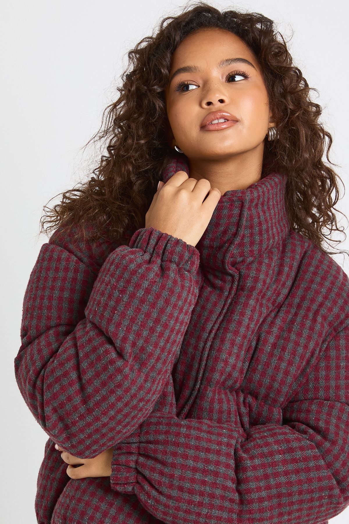 - Make a fashion-forward statement with this eye-catching check puffer jacket from Boohoo. The trendy cropped length and oversized silhouette create a relaxed yet stylish look that's perfect for casual outings. Style with wide-leg trousers and a simple white top for an effortlessly cool ensemble, or pair with your favourite jeans and trainers for weekend coffee runs. The distinctive check pattern adds visual interest to any outfit, whilst the practical funnel neck keeps you snug when temperatures drop. This versatile piece works brilliantly for family gatherings, casual meet-ups with friends, or simply running errands in style. The relaxed fit allows for comfortable layering over jumpers and hoodies, making it an essential addition to your cold-weather wardrobe that combines practicality with on-trend appeal.