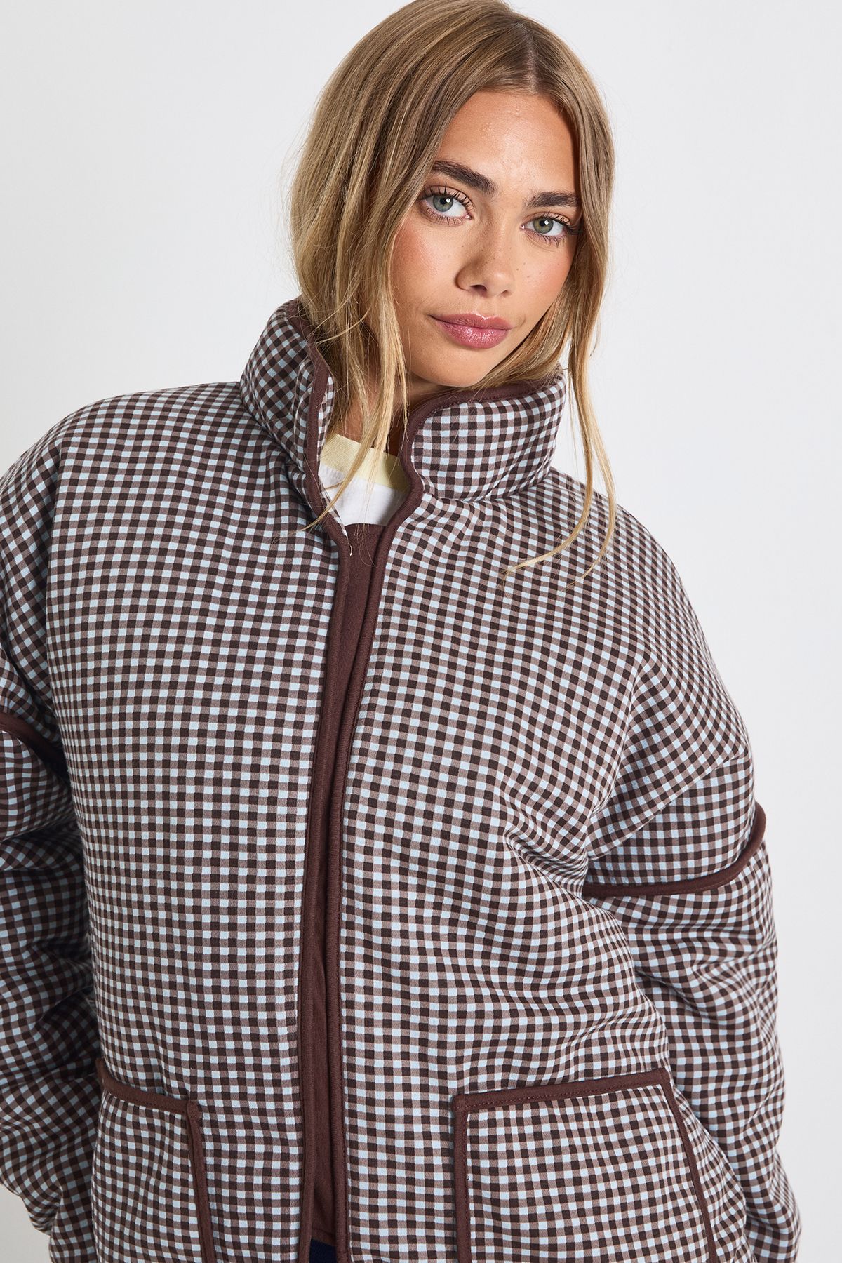 - Quilted padding offers comfortable insulation for cooler days Make a statement with this eye-catching Check Oversized Jacket that combines comfort with on-trend style. The roomy silhouette creates a fashionably relaxed look that's perfect for layering over your favourite basics. Style with a simple crop top and pleated mini skirt for a casual daytime ensemble, or pair with straight-leg jeans and trainers for weekend coffee dates. The versatile design works brilliantly for family gatherings or casual outings with mates. For chillier days, layer over a chunky knit jumper for added warmth without compromising on style. The distinctive check pattern and contrast trim detailing ensure you'll stand out from the crowd whilst maintaining that effortlessly cool vibe that Boohoo is known for. This jacket is the ultimate throw-on piece that will quickly become your go-to for adding character to any casual outfit.