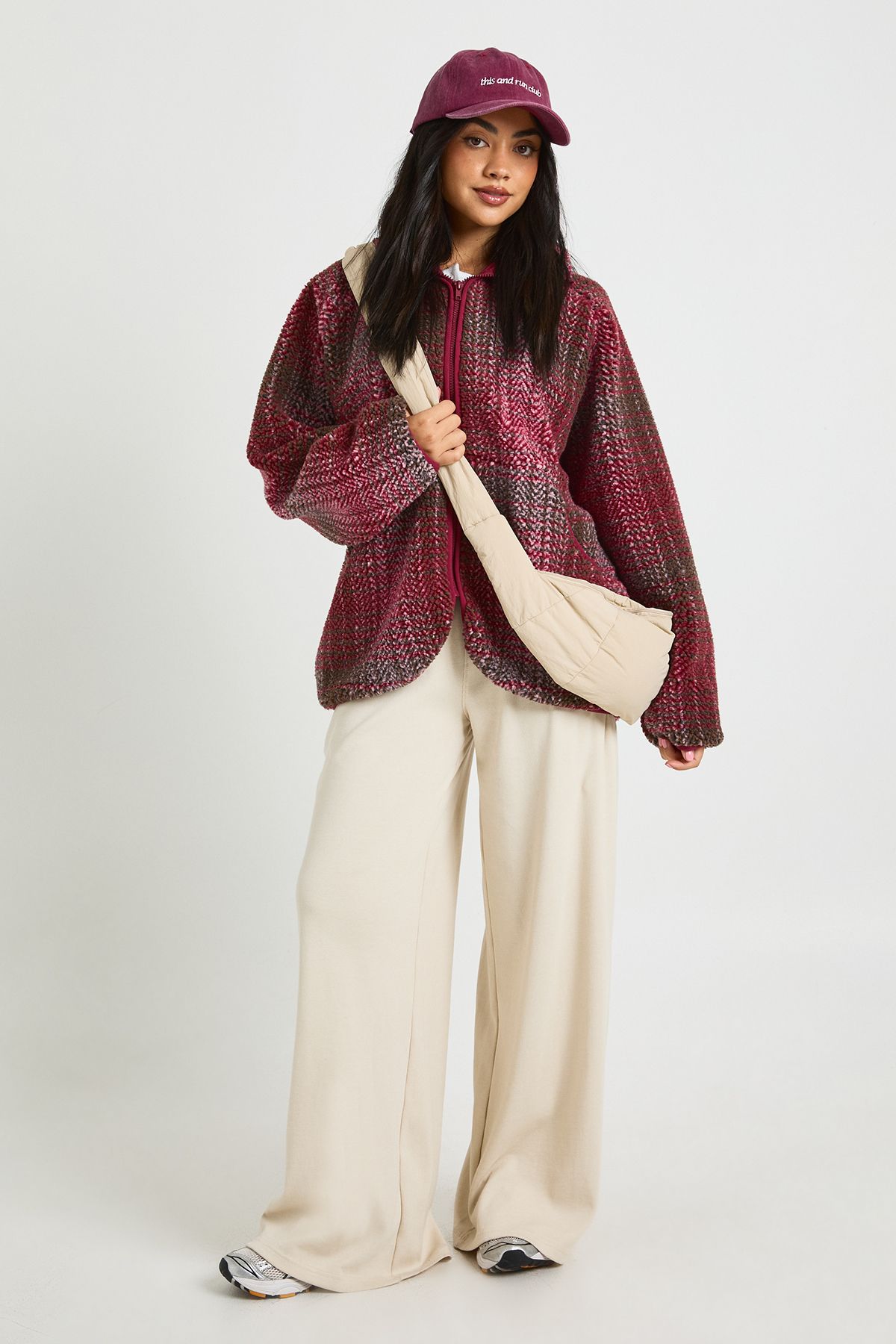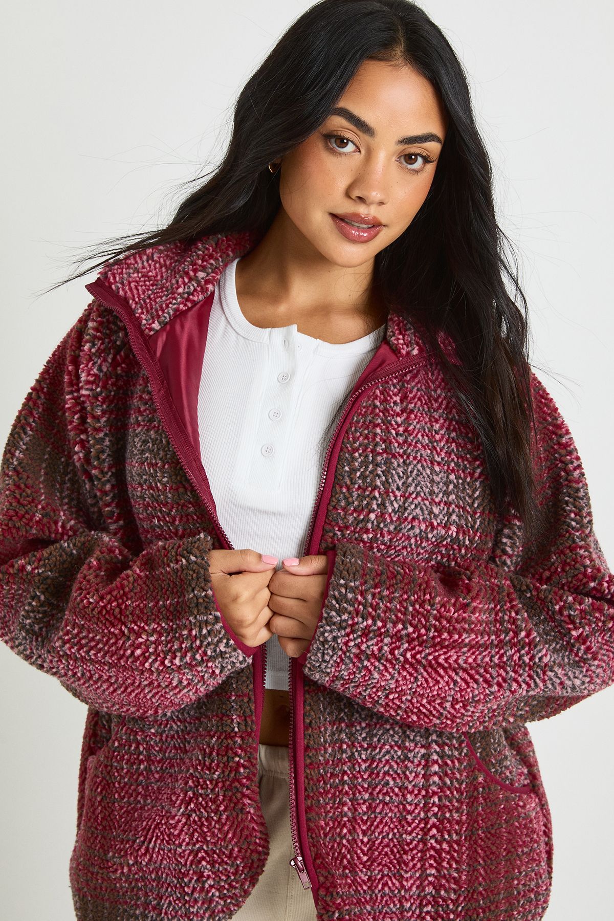 - Oversized teddy zip-up jacket featuring a distinctive check pattern throughout