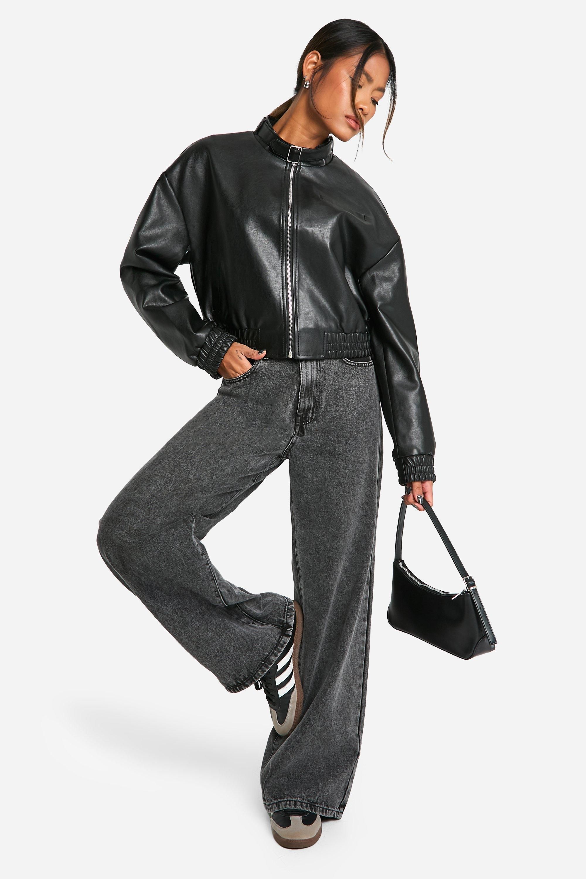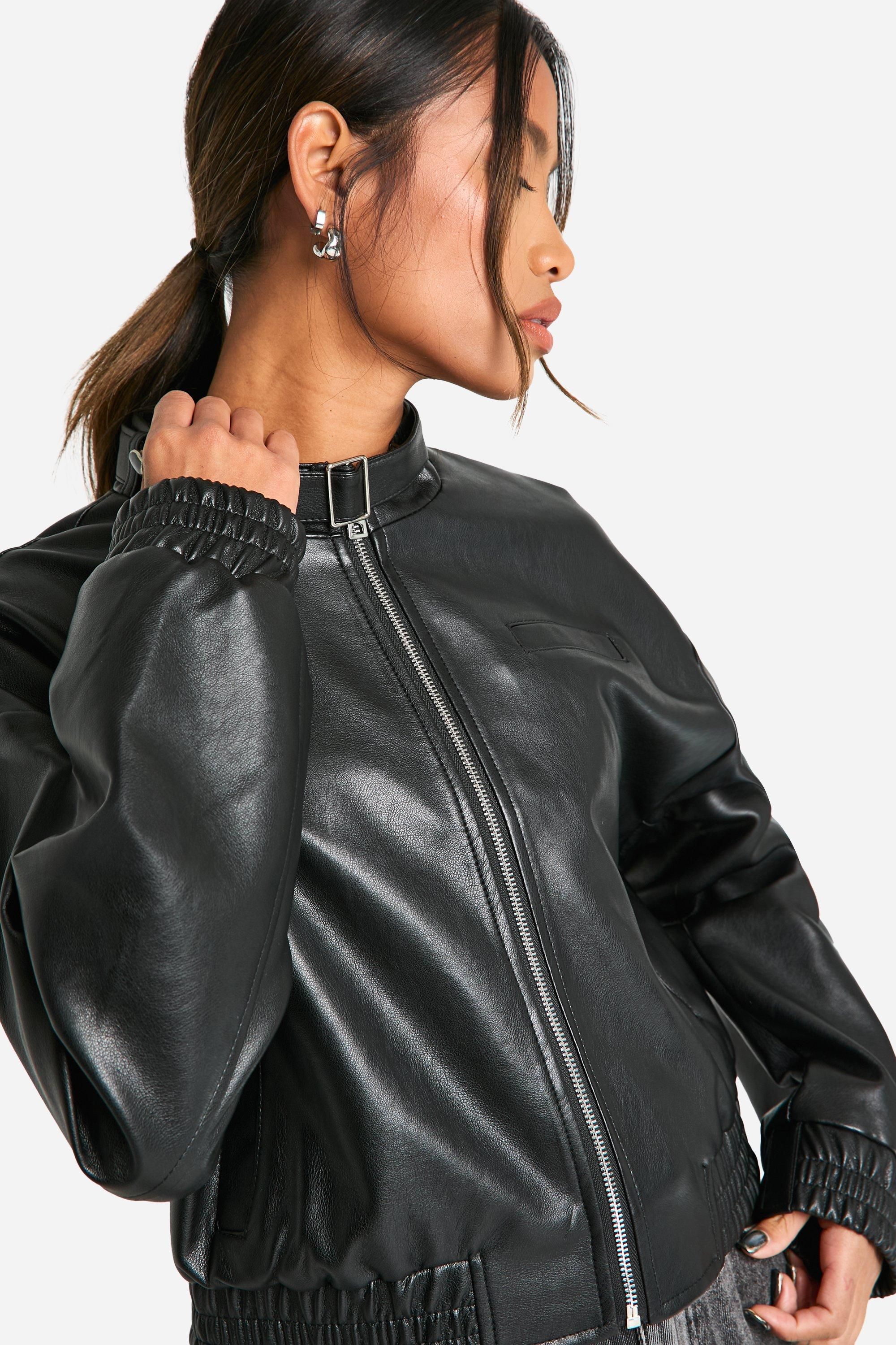 - Make a bold statement with this edgy faux leather bomber jacket from Boohoo. The unique collar detail adds a contemporary touch to the classic silhouette, while the cropped length creates a flattering profile. Style it with high-waisted wide-leg jeans and chunky trainers for a casual day out, or dress it up with a midi skirt and ankle boots for an evening with friends. The versatile design makes it ideal for various occasions, from family gatherings to casual outings. Layer it over a turtleneck jumper on cooler days or pair it with a crop top when the weather warms up. This jacket is a must-have piece for the fashion-forward woman who wants to stay on-trend without compromising on comfort or style.