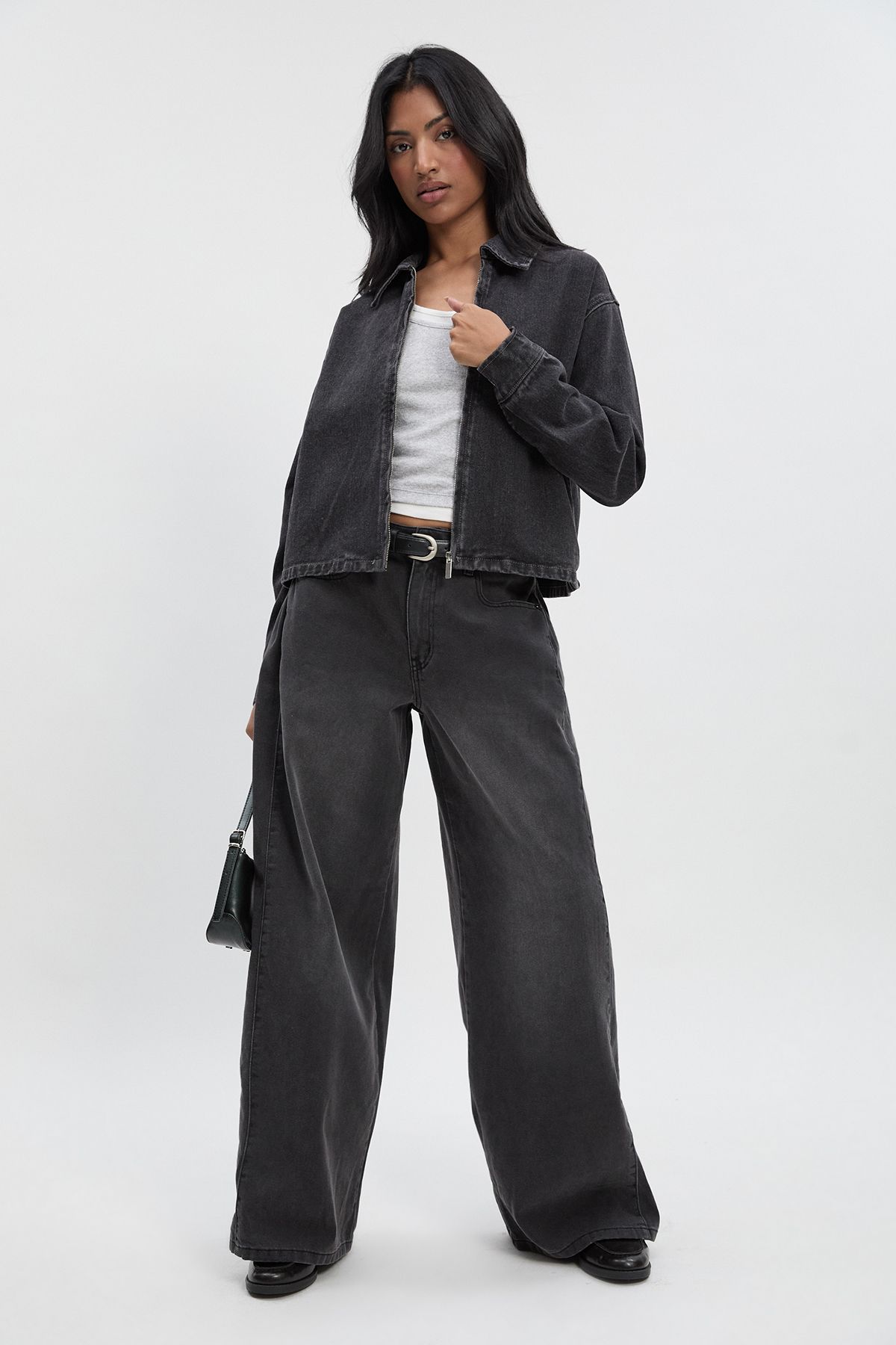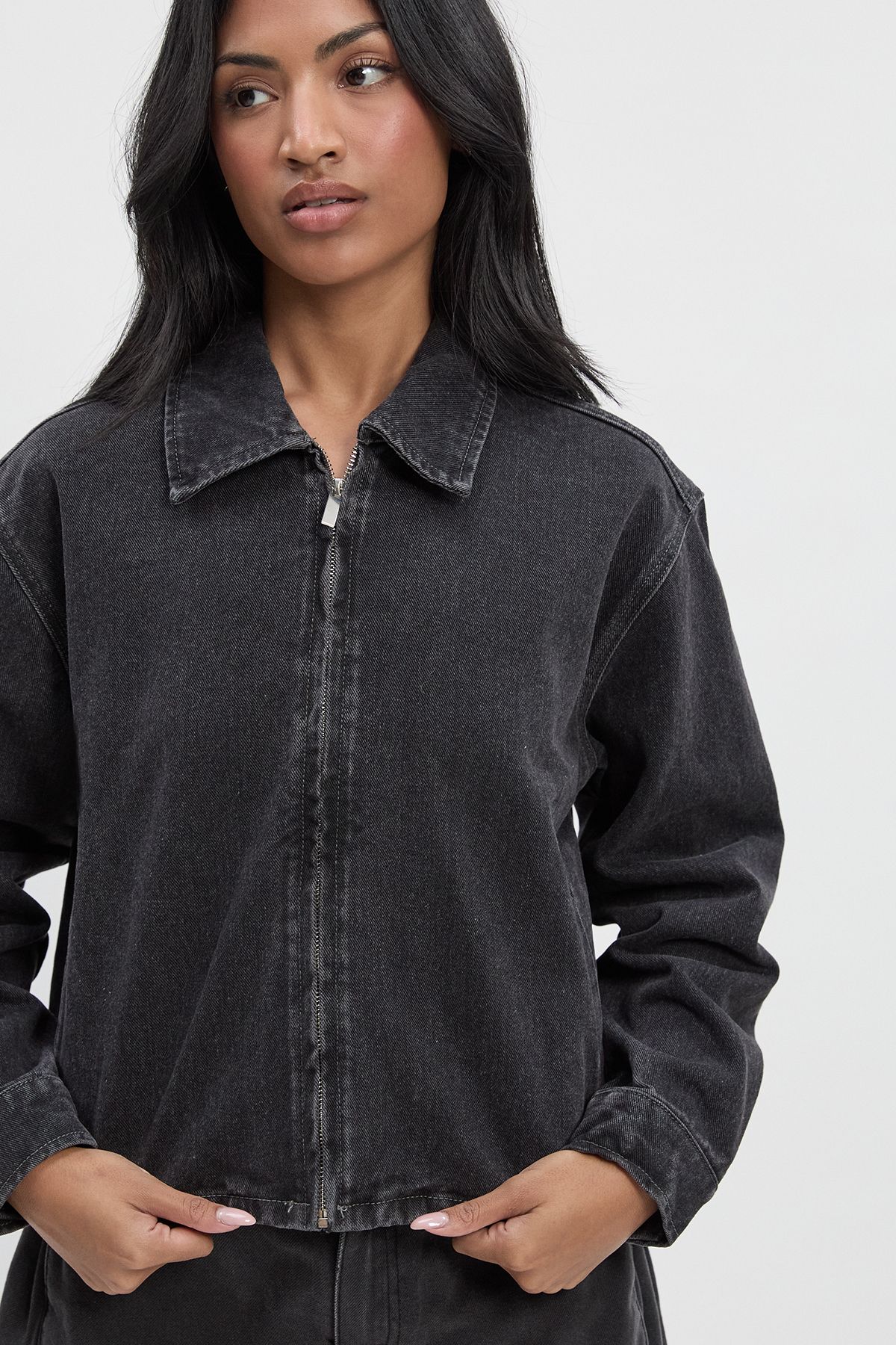 - This collared denim jacket is the ultimate casual wardrobe staple that works hard for your everyday style. The cropped, boxy cut creates a contemporary silhouette that pairs brilliantly with high-waisted trousers as shown, or with your favourite A-line skirts and dresses. For daytime outings, layer over a simple white tee with wide-leg jeans and trainers for an effortlessly cool double denim moment. When evening calls, throw it over a fitted midi dress with ankle boots and statement earrings. The versatile zip-front design allows for multiple styling options - wear fully zipped for a more polished look or open to showcase layered pieces underneath. Perfect for unpredictable British weather, this jacket is ideal for family gatherings, weekend brunches, or casual Friday office wear when paired with tailored trousers.