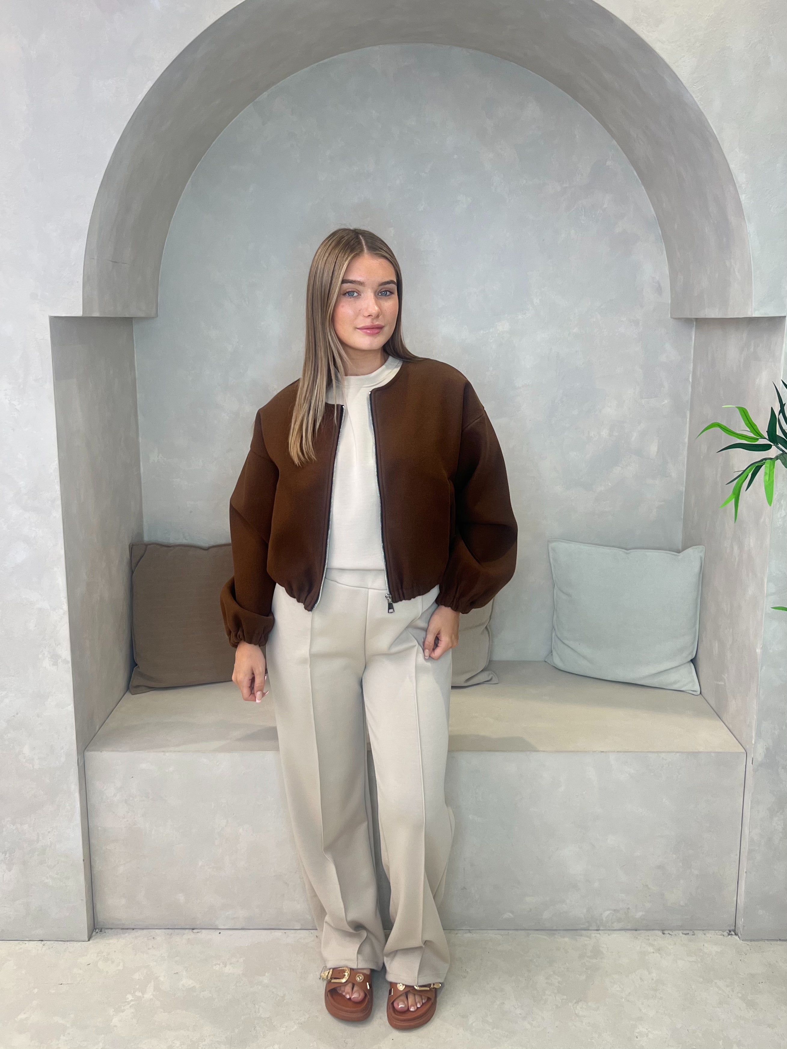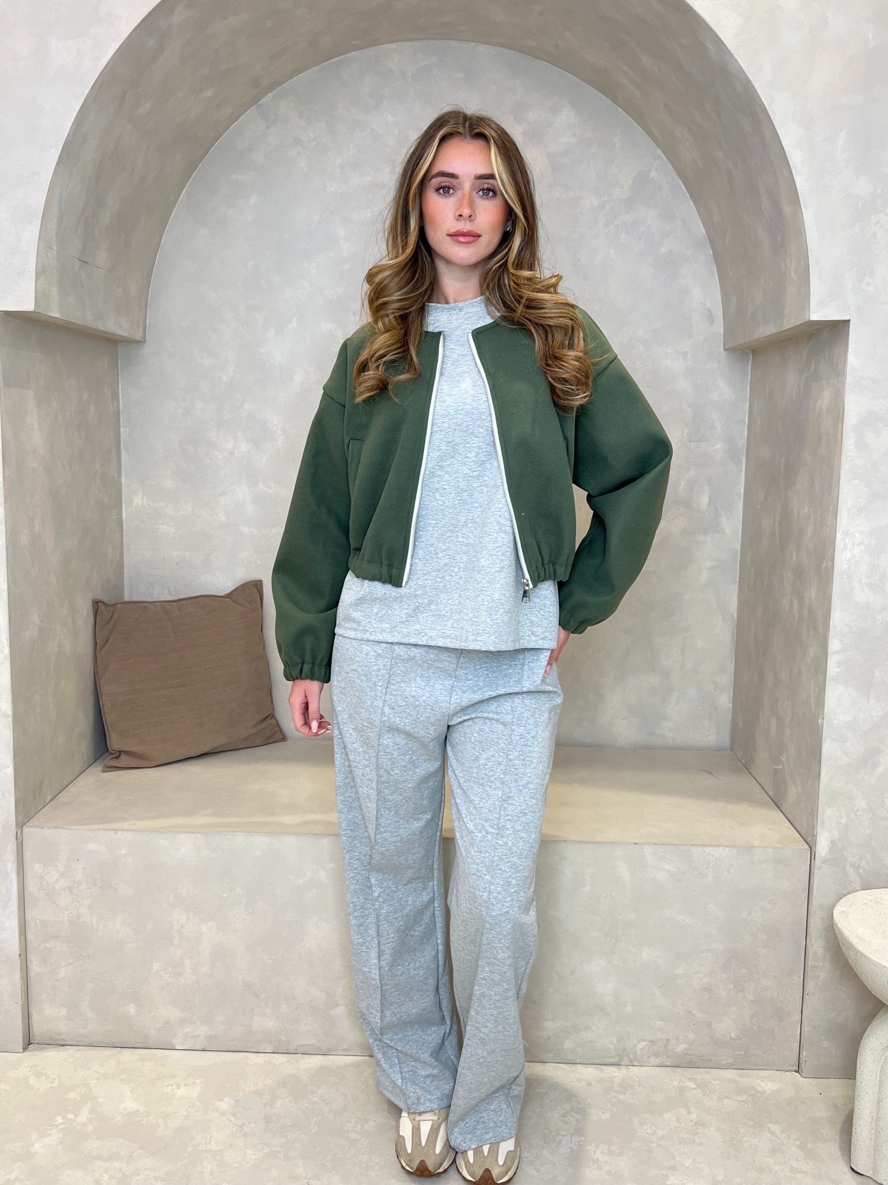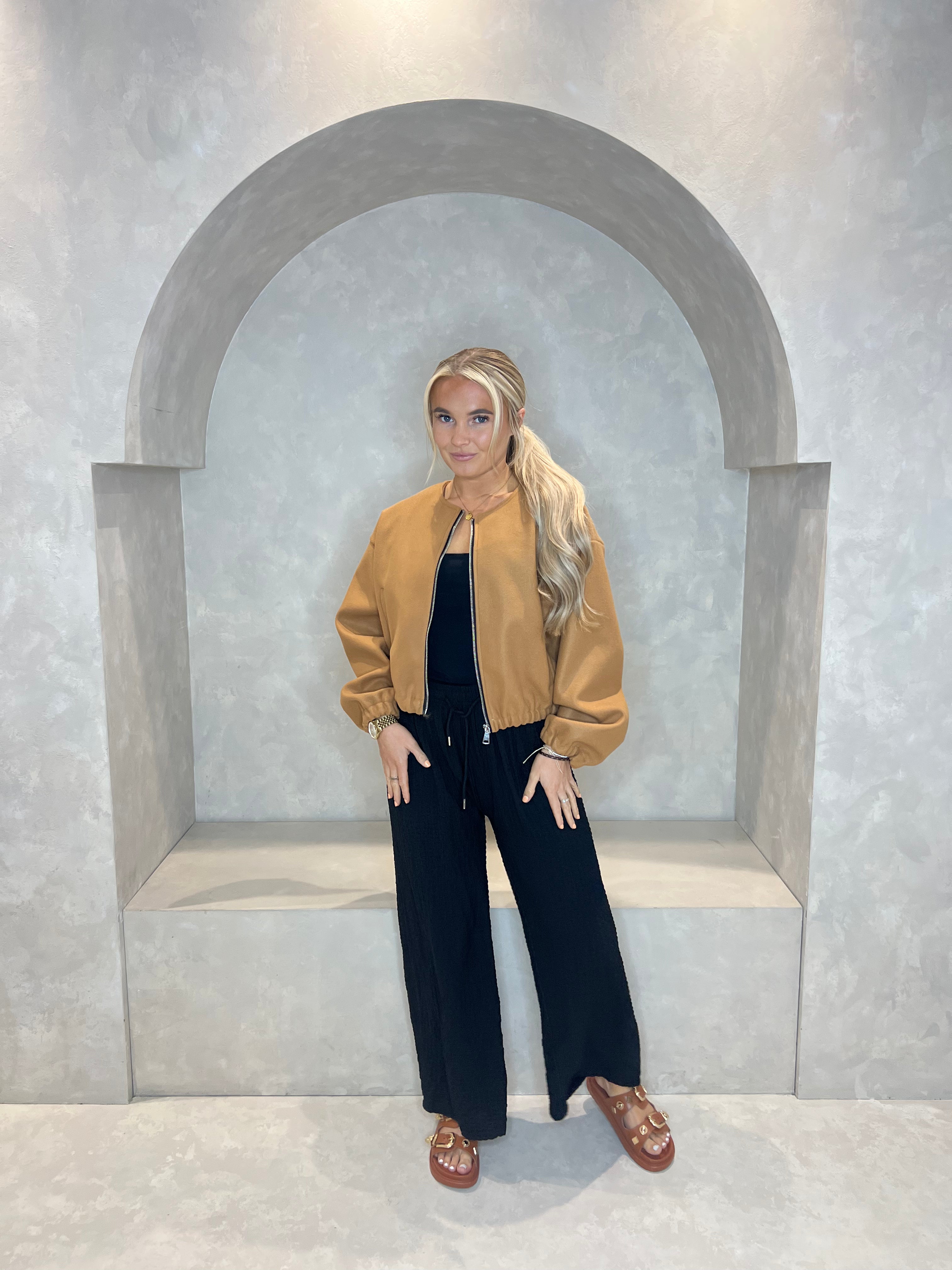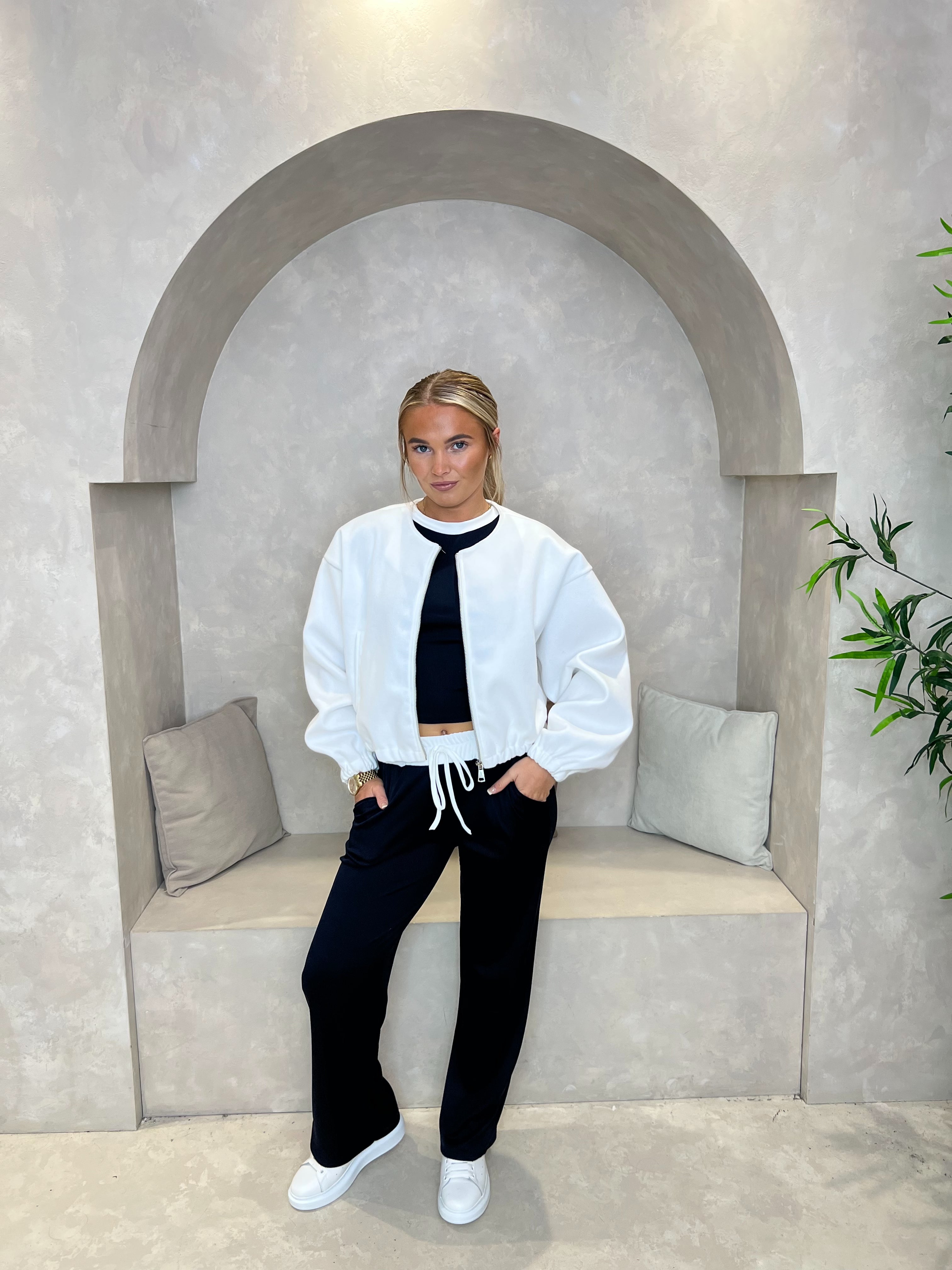 This collarless bomber jacket features elasticated cuffs, as well as two pockets for convenience. The zip fastening allows for easy and secure closure. Stay stylish and functional with this modern jacket.