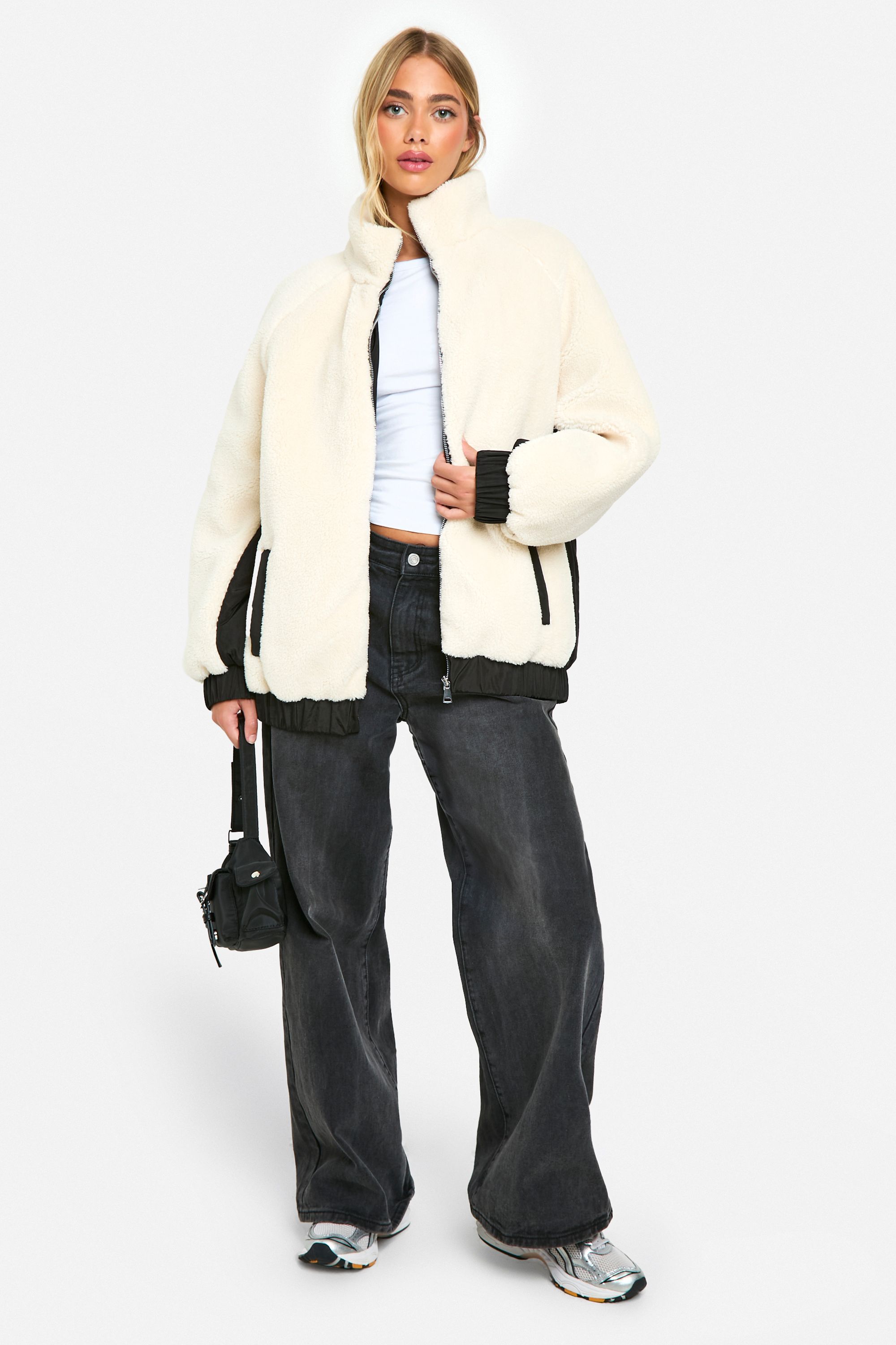 - This teddy jacket from Boohoo is the perfect blend of comfort and style for the fashion-forward woman. The soft borg fabric offers a luxurious feel, while the contrasting nylon inserts add a contemporary twist to the classic teddy coat silhouette. Ideal for casual outings, this versatile piece can be styled effortlessly with various looks. Pair it with wide-leg trousers and trainers for a relaxed weekend ensemble, or throw it over a simple tee and jeans for impromptu coffee dates. The high collar and full-length zip provide extra cosiness on chilly days, making it a go-to choice for outdoor events or laid-back family gatherings. With its on-trend design and practical features, this jacket is sure to become a staple in your autumn and winter wardrobe, offering both warmth and style for the social butterfly who values fashion-forward pieces at accessible price points.