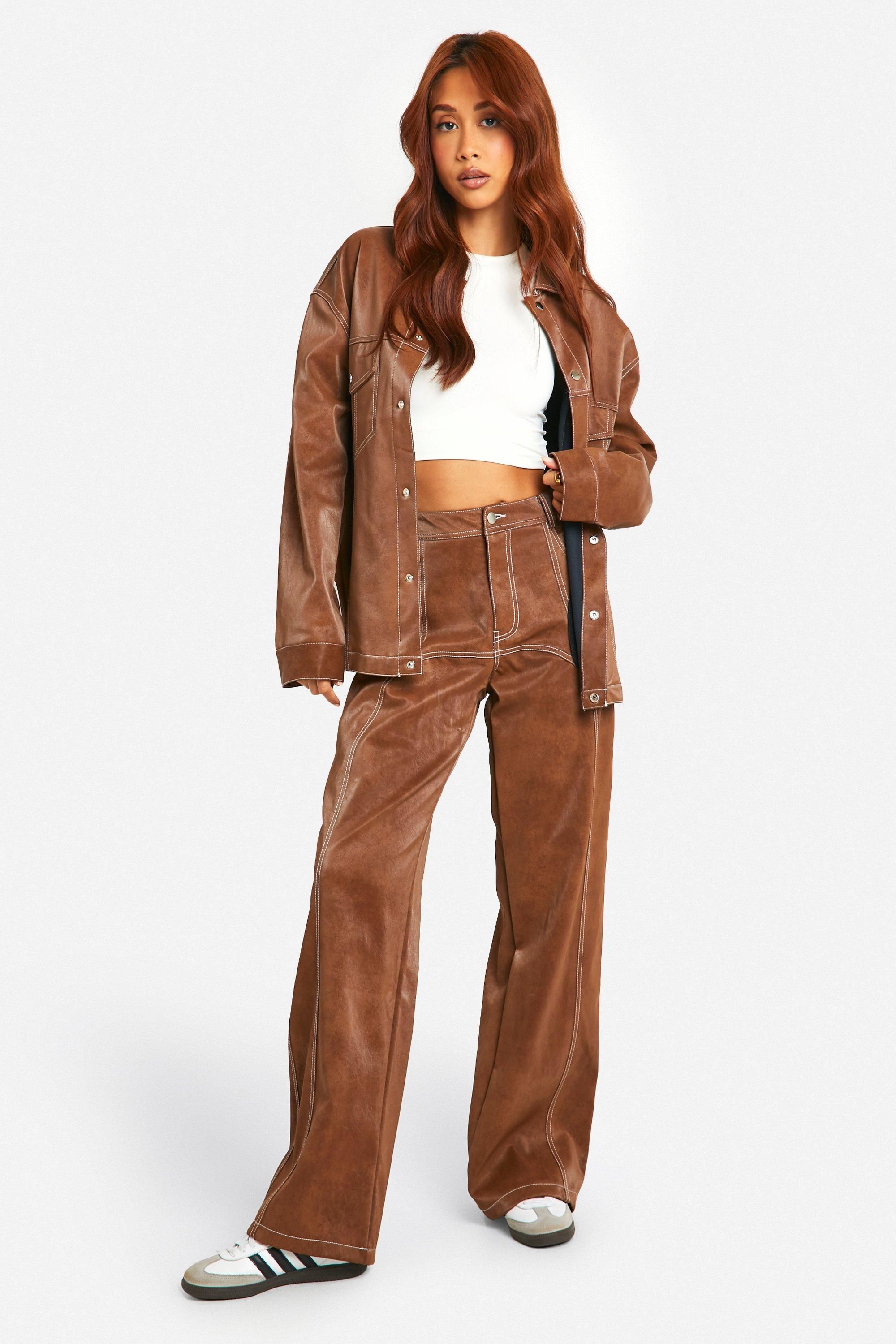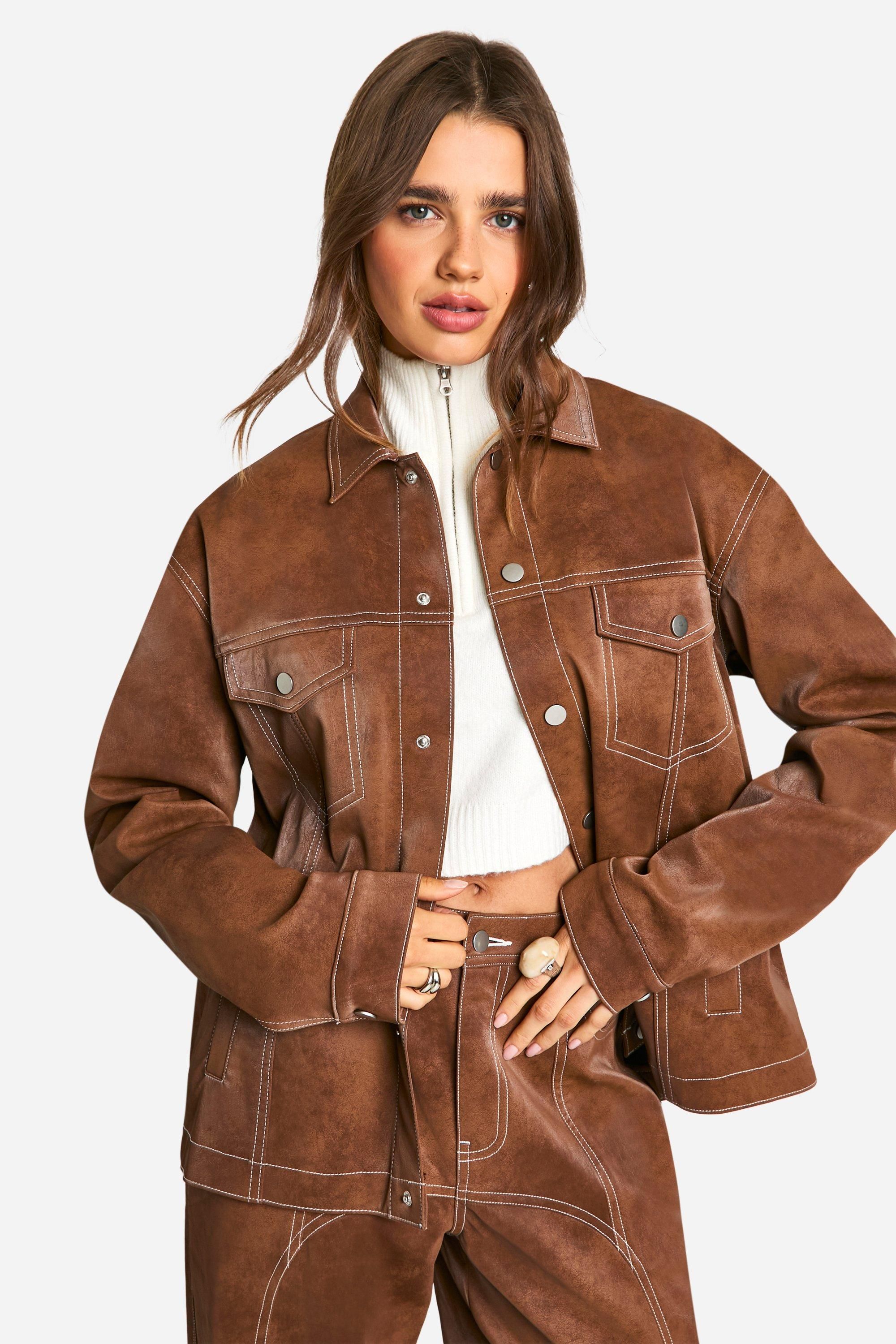 - Channel effortless cool with this vintage-look faux leather jacket from Boohoo. The oversized silhouette offers a contemporary twist on a classic style, perfect for the fashion-forward woman who values both comfort and trend-setting looks. The contrasting stitching adds visual interest, while the multiple pockets provide both functionality and style. Pair this jacket with wide-leg trousers and a crisp white top for a chic ensemble that's ideal for casual outings or family gatherings. For a more relaxed look, throw it over a simple tee and your favourite jeans. The versatile nature of this jacket makes it a go-to piece for various casual events, easily dressed up or down to suit your needs. Its timeless appeal ensures it will remain a staple in your wardrobe for seasons to come.