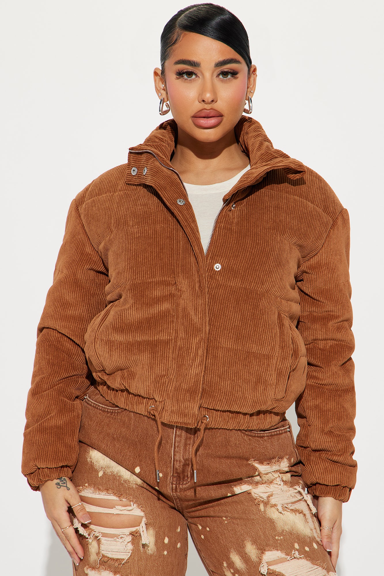 Available In Camel, Mauve And Taupe.Cropped Corduroy PufferDrawstring WaistHigh Neck CollarZipper And Snap Button FrontPocketsShell: 87% Polyester 13% NylonLining: 100% PolyesterPadding: 100% PolyesterImported
