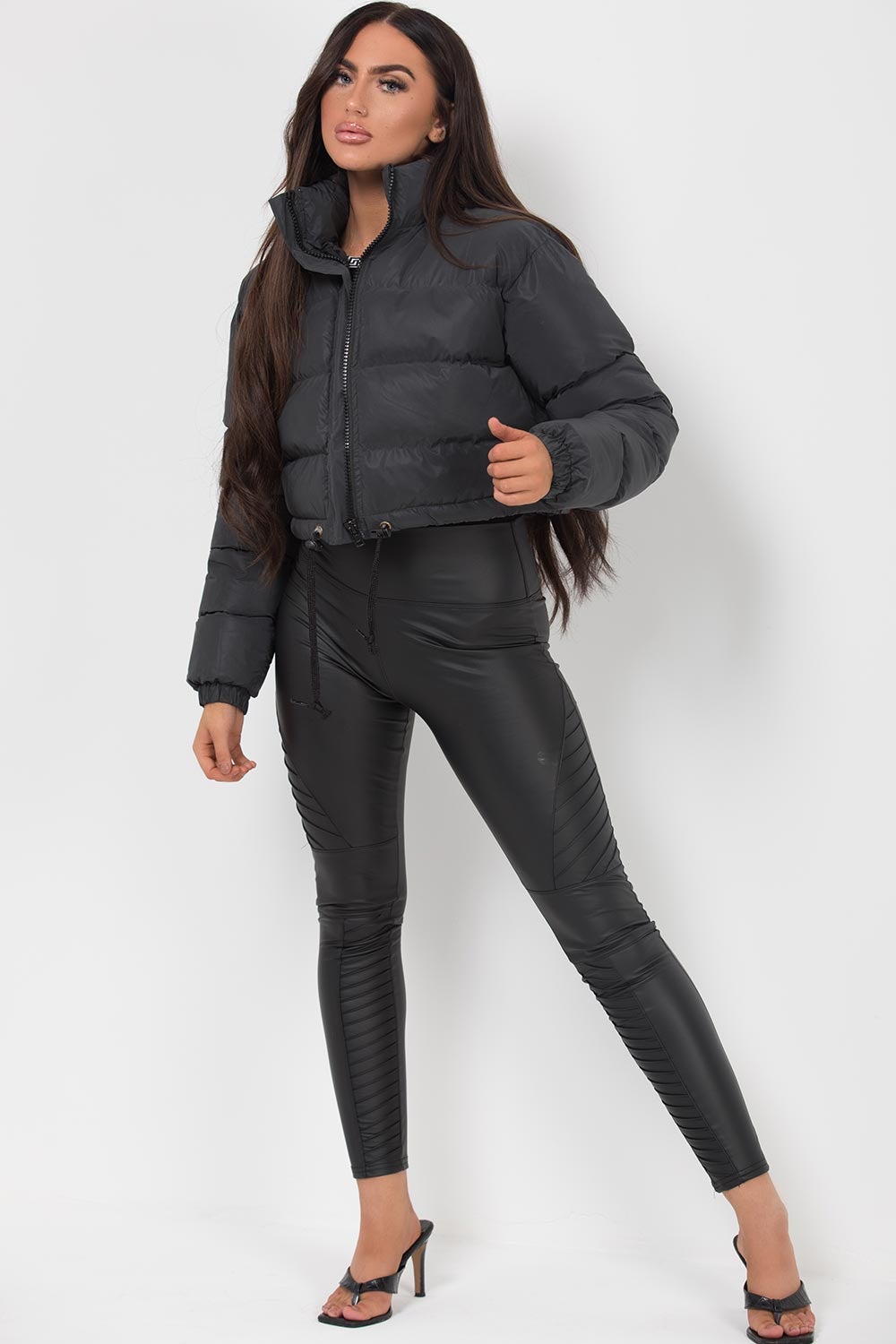 Crop puffer jacket in reflective black. This crop padded jacket is perfect to be added with any outfit all year around. Featuring reflective fabric, padded puffer style, zip fastening and drawstring waist. Style it with our high waisted ripped jeans to complete the look. Also available in Grey.