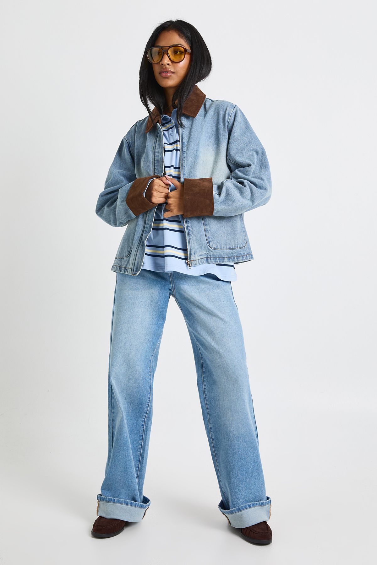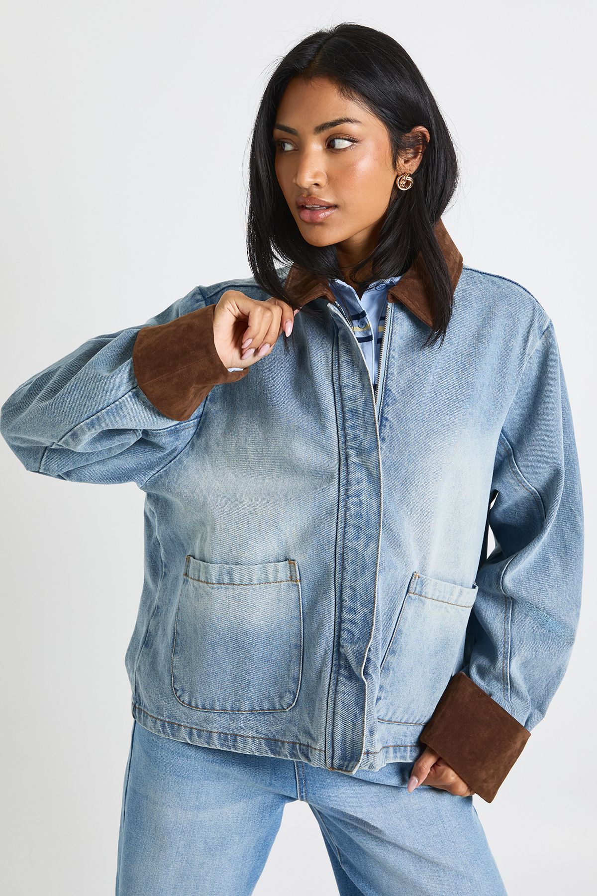 - The Denim Barn Jacket reimagines a timeless casual staple with contemporary flair. Its relaxed fit creates the perfect canvas for layering over everything from striped tops to cosy jumpers. Style with matching wide-leg jeans and trainers for an on-trend double denim look that's perfect for weekend brunches or casual gatherings. For a more structured ensemble, pair with tailored trousers and ankle boots. The contrasting corduroy collar and cuffs add textural interest and a nod to traditional workwear, whilst the roomy silhouette ensures comfort without compromising on style. This versatile piece transitions seamlessly between seasons - layer over a hoodie during cooler months or wear open over a simple tee when temperatures rise. A true wardrobe essential that combines practicality with Boohoo's signature contemporary edge.