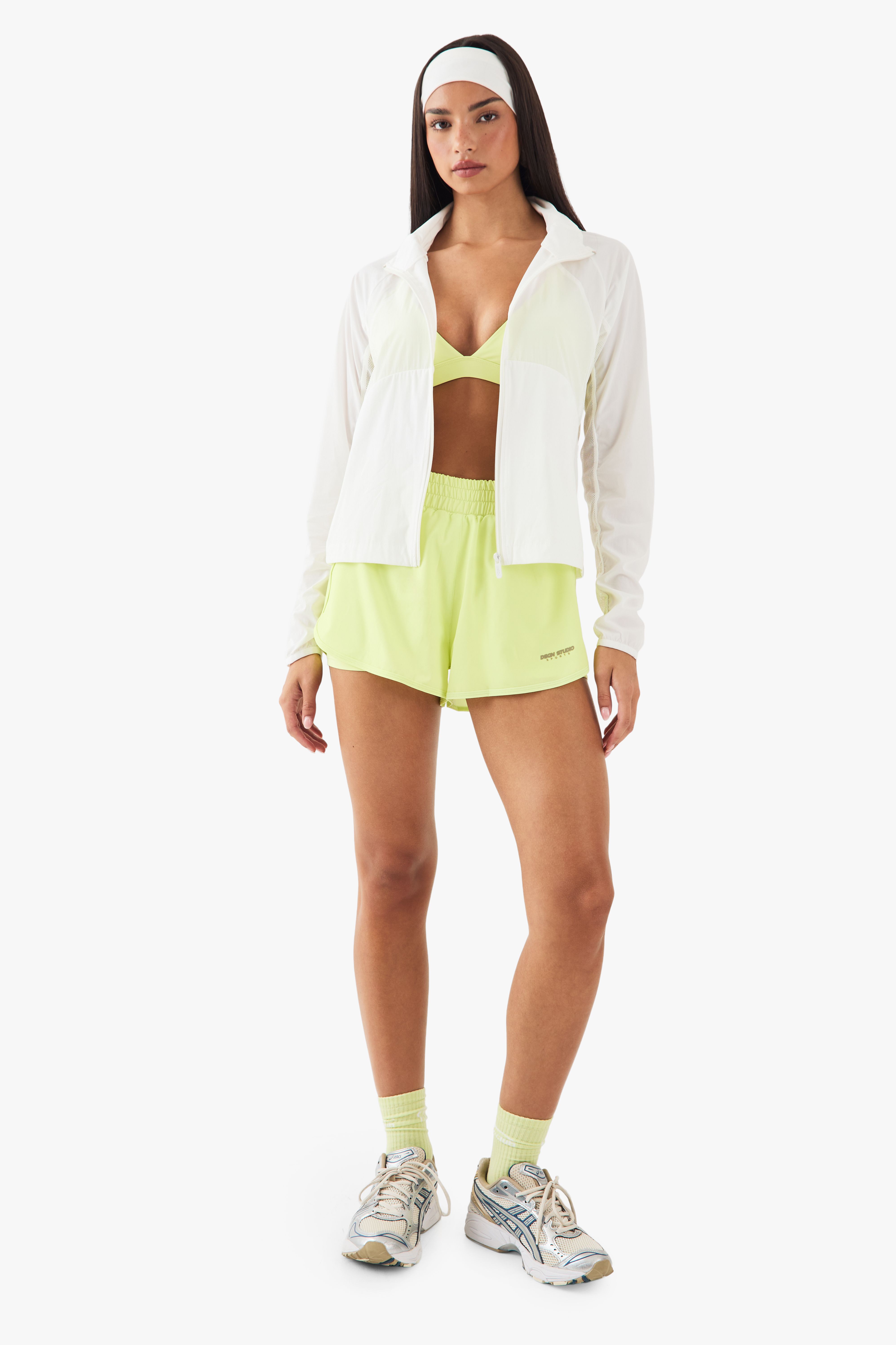 - Relaxed fit allowing for layering over sports bras or lightweight tops The DSGN Studio Light Weight Mesh Panel Running Jacket combines functionality with contemporary style for your active lifestyle. The thoughtfully placed mesh panels create a cooling effect during intense training sessions, whilst the high neck design offers protection against the elements. Perfect for morning jogs, evening runs or as a lightweight layer for your commute to the gym. Style with coordinating shorts as shown for a cohesive activewear ensemble, or pair with leggings and trainers for a practical workout look. The versatile design transitions effortlessly from exercise to casual outings, making it an essential addition to your activewear collection. Ideal for layering in transitional weather or as a standalone piece during warmer months, this jacket delivers on both performance and style for the fashion-conscious fitness enthusiast.