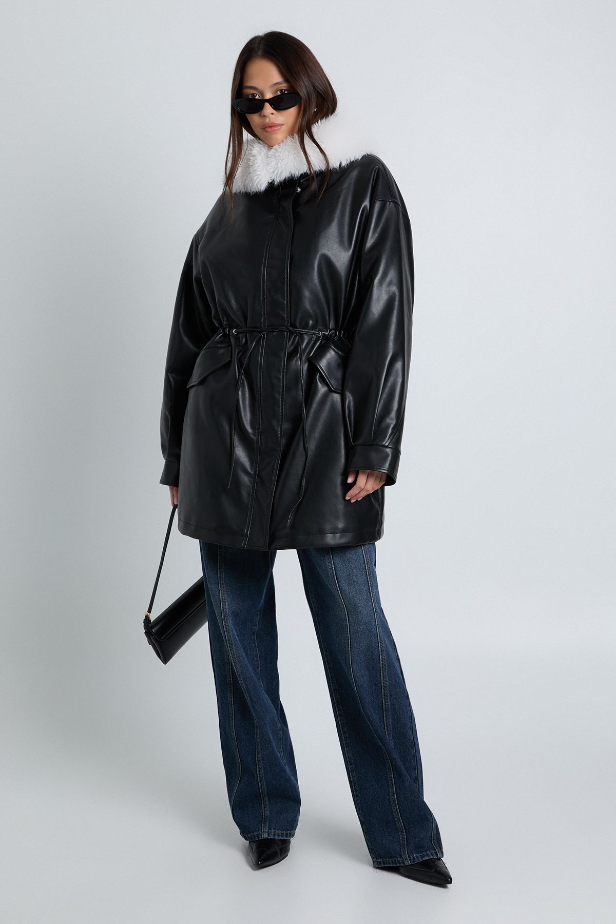 • Faux Fur Collar Faux Leather Cinched Waist Jacket