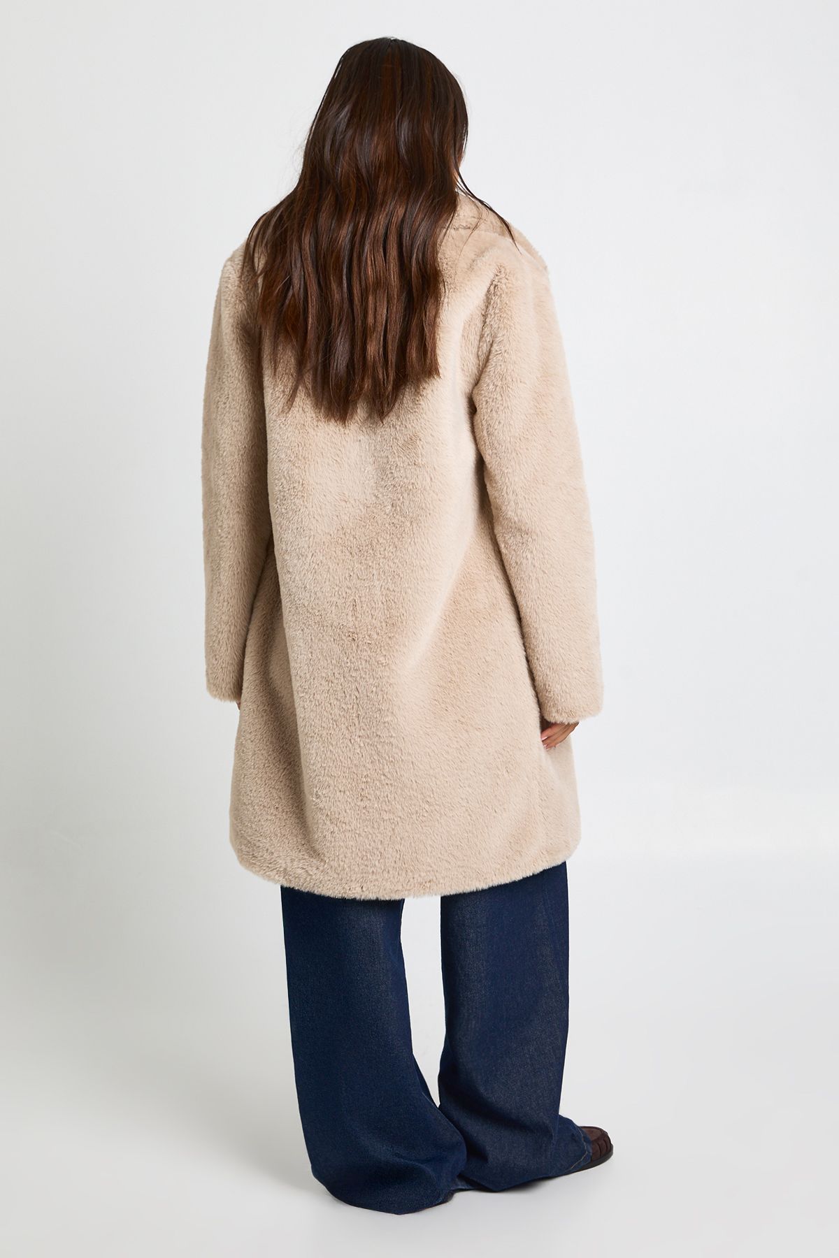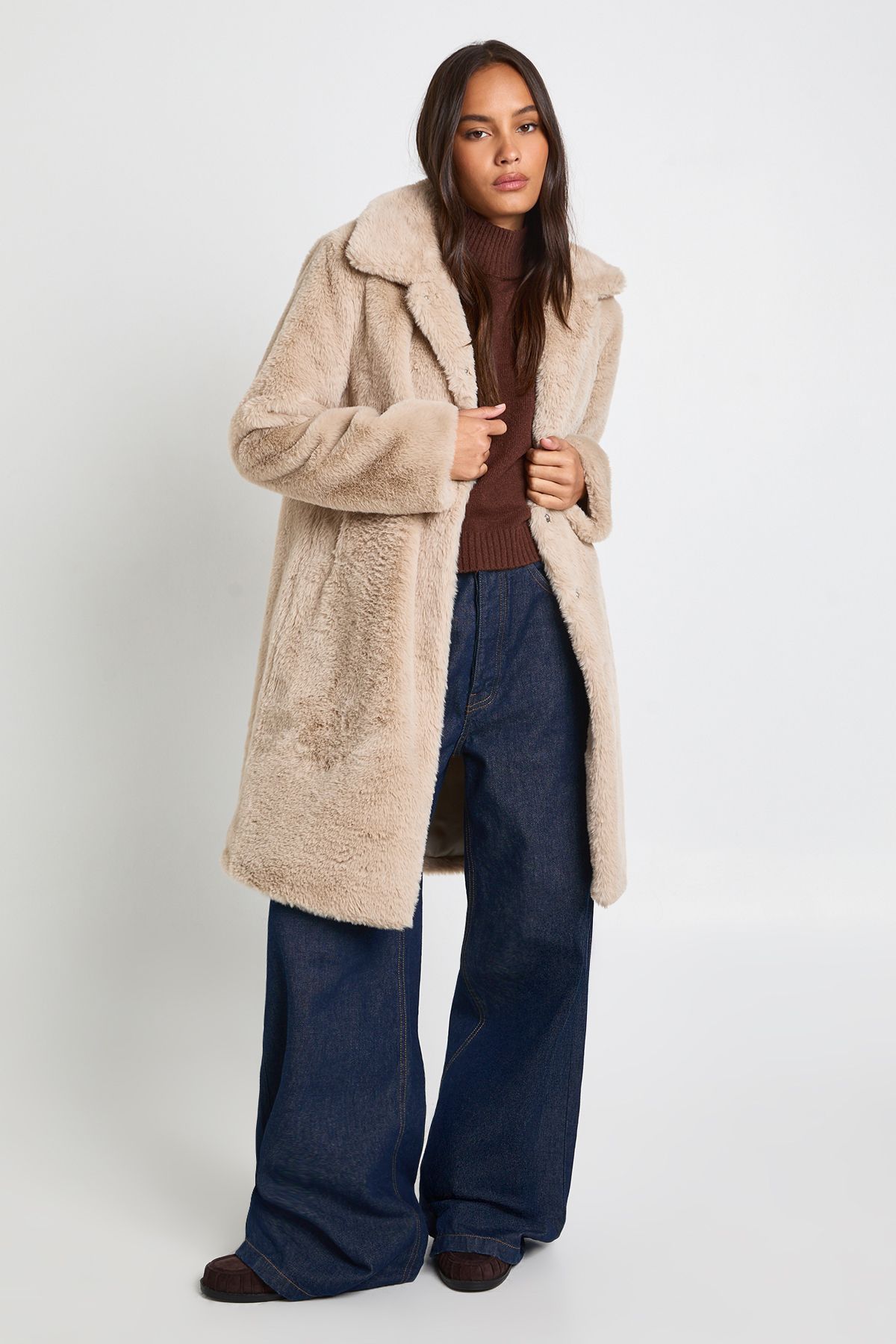 • Luxurious faux fur collar adds a touch of glamour to this midaxi-length jacket
