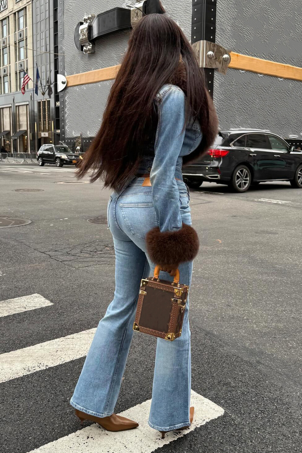 Faux Fur Patchwork Jacket Jeans Casual Denim Matching Set-Blue
