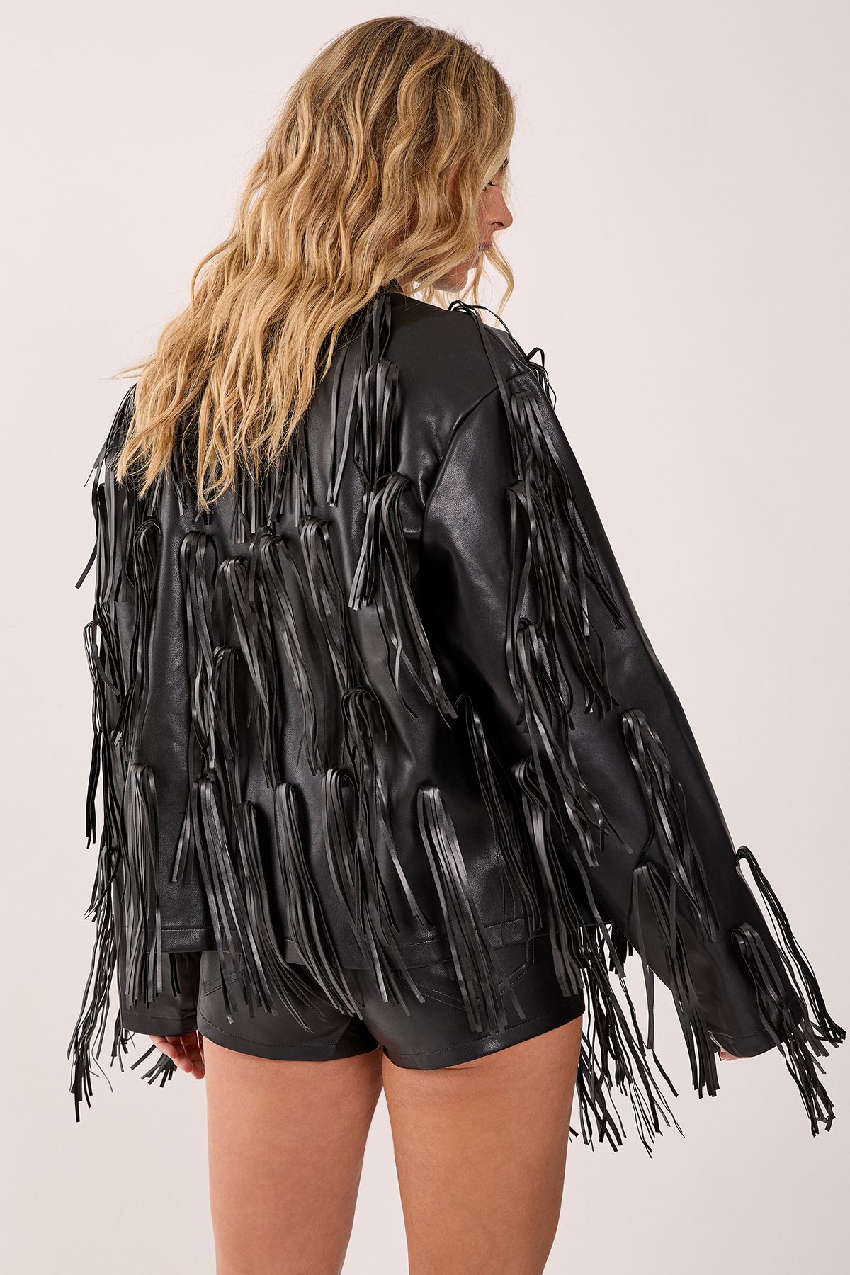 - Make an unforgettable entrance in this show-stopping NastyGal Faux Leather Tassel Jacket. The dramatic fringing creates movement with every step, transforming a simple outfit into something extraordinary. Style with the matching shorts and a delicate lace crop top for festival season, or throw over a simple slip dress to add edge to evening attire. The versatile design works brilliantly for day-to-night transitions - pair with denim and boots for casual daywear or with a bodycon dress for after-dark drama. The oversized silhouette allows for comfortable layering in cooler weather, whilst the striking texture ensures you'll stand out from the crowd. This jacket doesn't just complete an outfit - it defines it, bringing rock-chic attitude to any look you create.