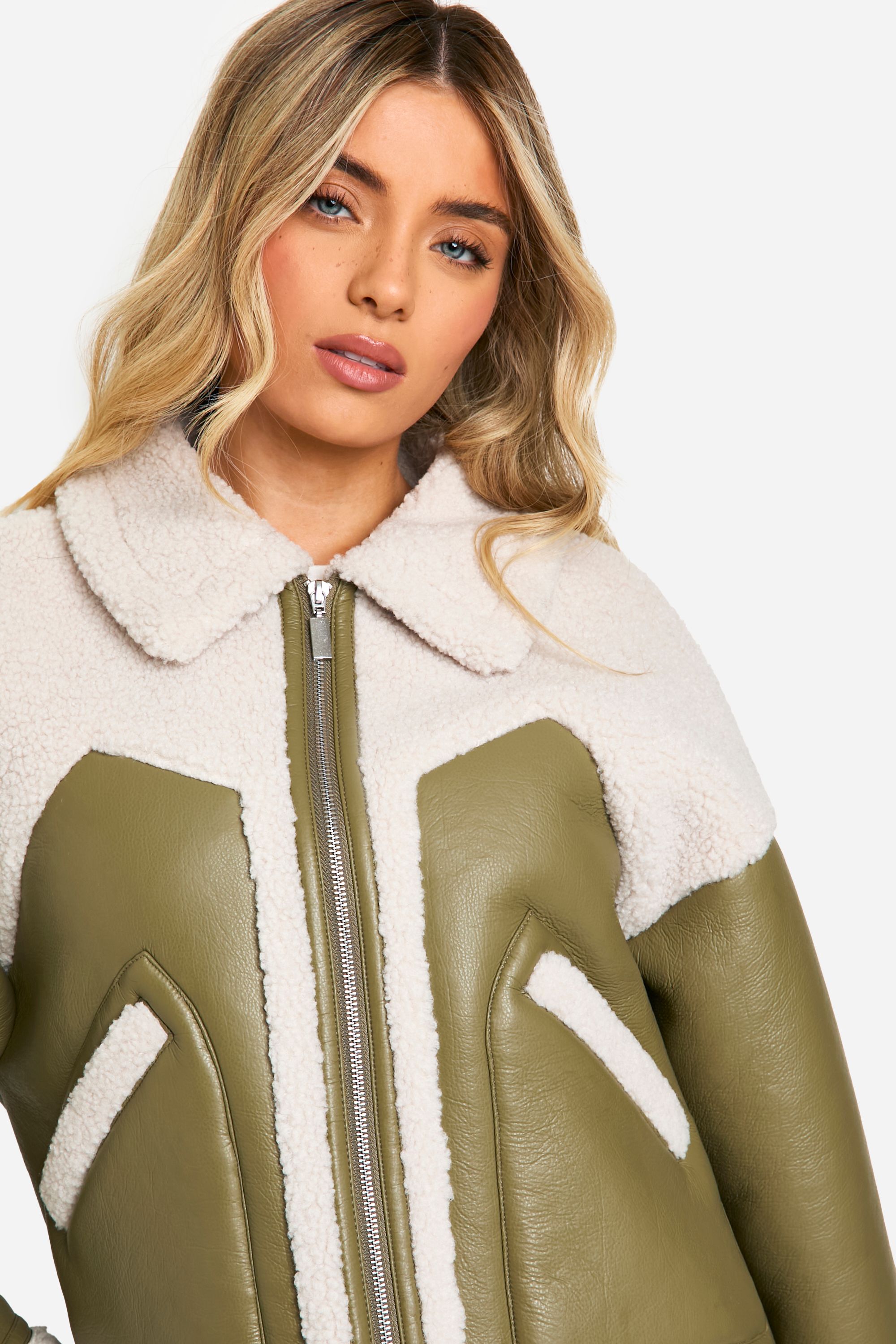 - Make a statement in this eye-catching faux leather aviator jacket. The contrasting teddy fabric detailing adds a touch of cosiness to the edgy design, perfect for those chilly autumn days. Style it with wide-leg trousers and trainers for a laid-back weekend look, or throw it over a midi dress and ankle boots for a night out with the girls. The versatile nature of this jacket makes it a go-to piece for various casual occasions, from family gatherings to impromptu coffee dates. Its relaxed fit and oversized collar radiate a cool, effortless vibe that's sure to turn heads. Whether you're heading to a music festival or a casual dinner, this jacket will keep you looking stylish and feeling comfortable all day long.