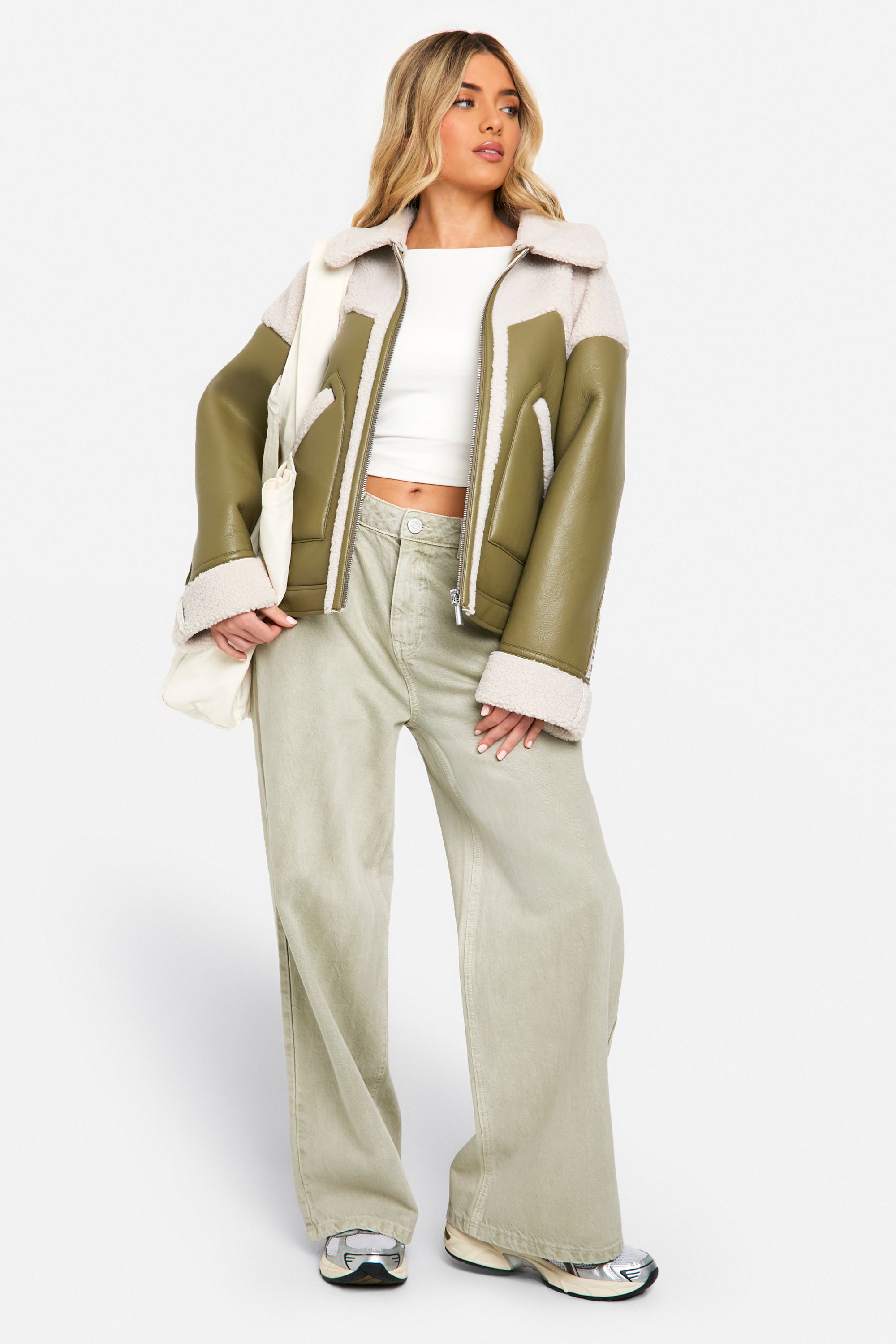 - Relaxed fit with dropped shoulders for effortless style Make a statement in this eye-catching faux leather aviator jacket. The contrasting teddy fabric detailing adds a touch of cosiness to the edgy design, perfect for those chilly autumn days. Style it with wide-leg trousers and trainers for a laid-back weekend look, or throw it over a midi dress and ankle boots for a night out with the girls. The versatile nature of this jacket makes it a go-to piece for various casual occasions, from family gatherings to impromptu coffee dates. Its relaxed fit and oversized collar radiate a cool, effortless vibe that's sure to turn heads. Whether you're heading to a music festival or a casual dinner, this jacket will keep you looking stylish and feeling comfortable all day long.