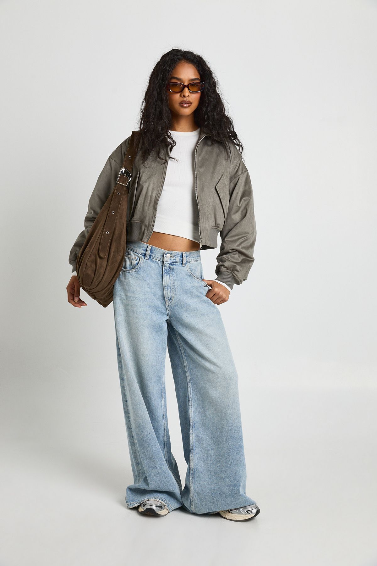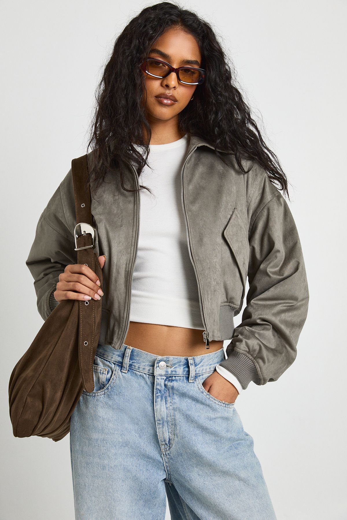 • Relaxed, oversized shoulders creating a stylish silhouette This suede bomber jacket brings timeless cool to your casual wardrobe with its versatile design and relaxed fit. The cropped length makes it perfect for pairing with high-waisted jeans or trousers, creating a balanced silhouette that flatters your figure. Style with wide-leg denim and a simple crop top for an effortlessly chic daytime look, or throw over a mini dress with trainers for weekend brunches. The soft texture adds a touch of luxury to everyday outfits, while the classic bomber shape ensures this piece will remain a wardrobe staple for seasons to come. Ideal for transitional weather, this jacket works brilliantly for casual gatherings, coffee dates, or laid-back evenings with friends - a true Boohoo essential that combines comfort with on-trend style.