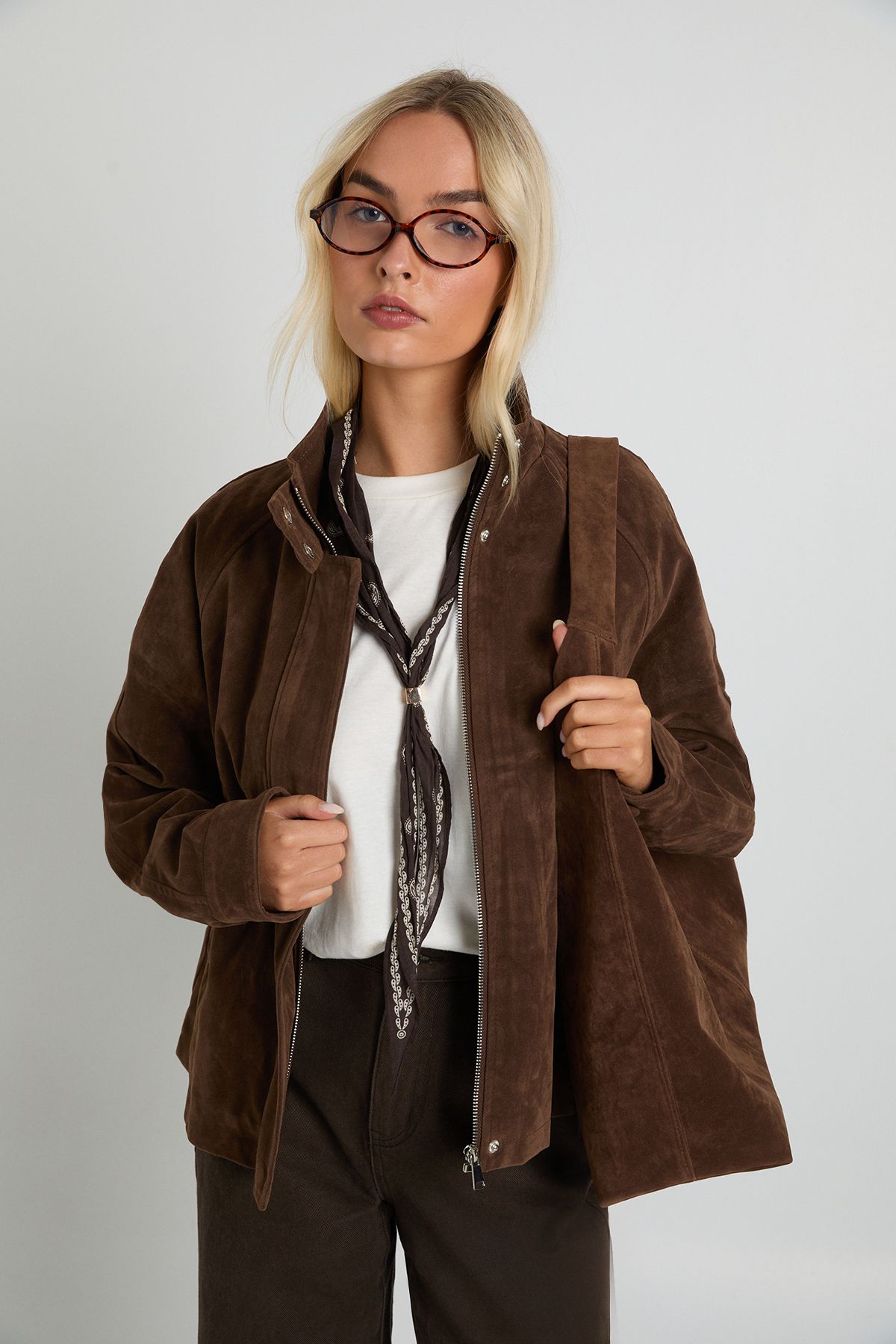 - Luxurious faux suede bomber jacket with a soft-touch finish