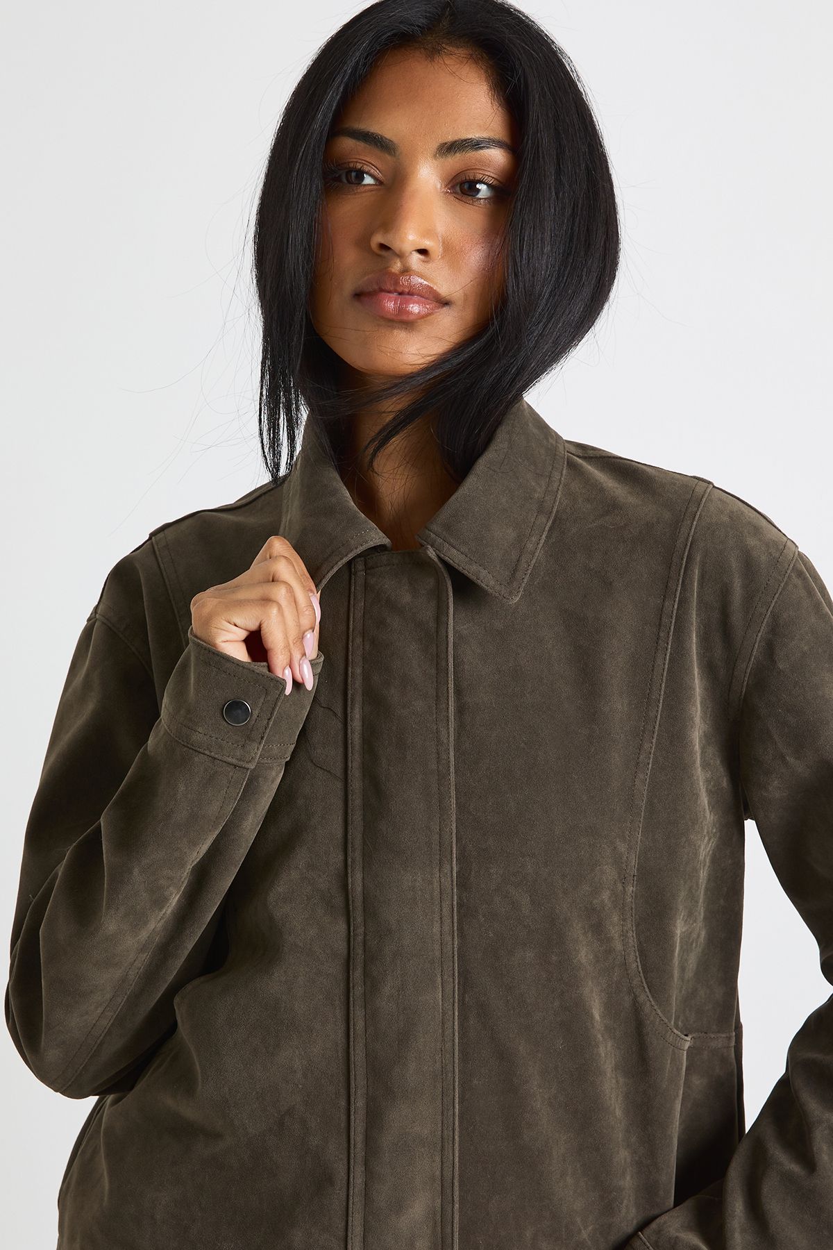 - Soft-touch fabric with a luxurious appearance that adds sophistication to casual outfits This faux suede collared jacket brings a touch of retro charm to your everyday wardrobe. The contrasting plush collar and cuffs create a striking visual element that enhances its casual appeal. Style it as seen with wide-leg checked trousers and trainers for a relaxed weekend look, or pair with your favourite jeans and ankle boots for coffee dates and shopping trips. The versatile design makes it perfect for family gatherings and casual outings when the temperature drops. Layer over a simple tee or chunky knit depending on the weather. Its relaxed fit allows for comfortable movement while maintaining a fashionable silhouette. This Boohoo jacket is a brilliant transitional piece that will quickly become your go-to for adding texture and interest to your casual ensembles.