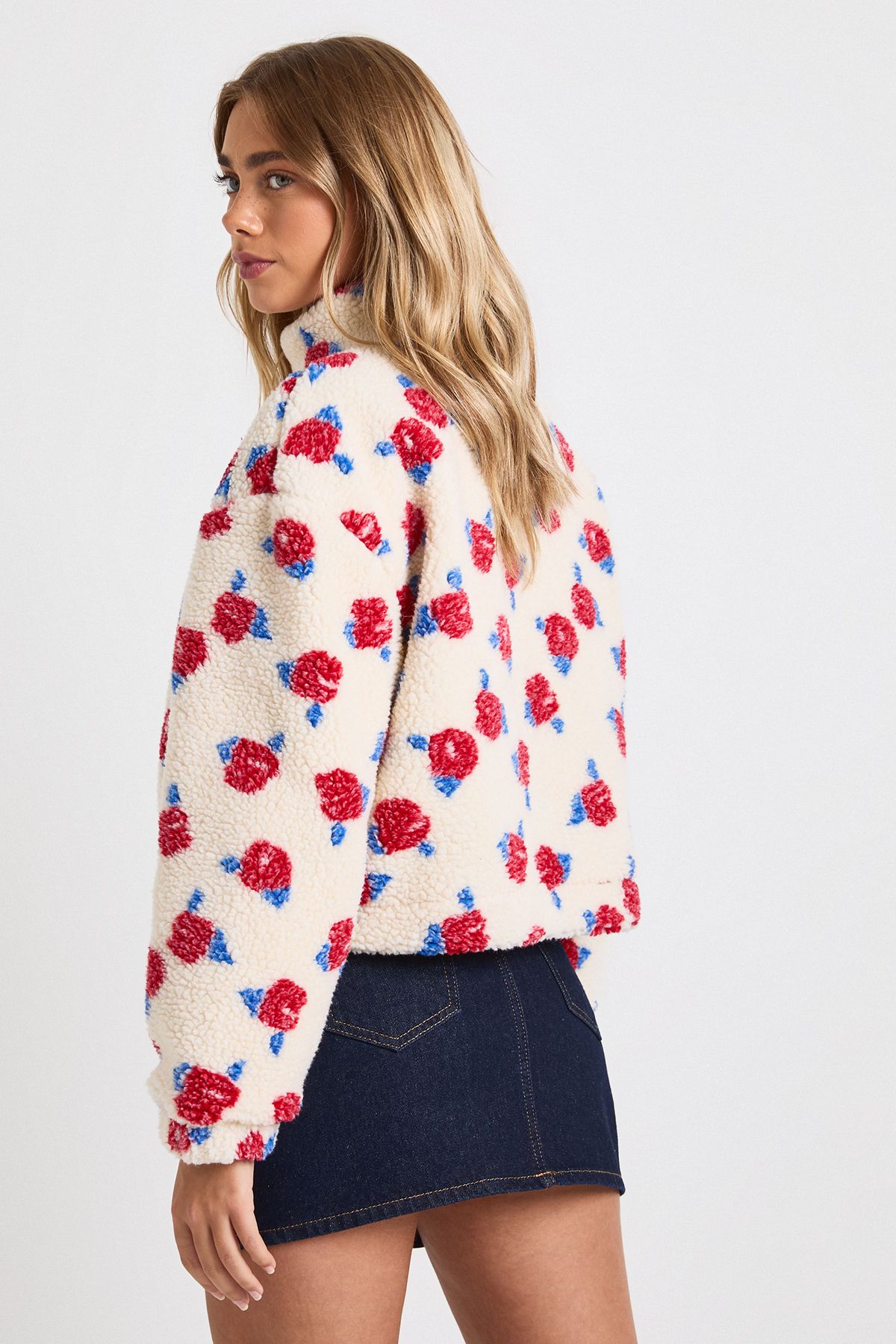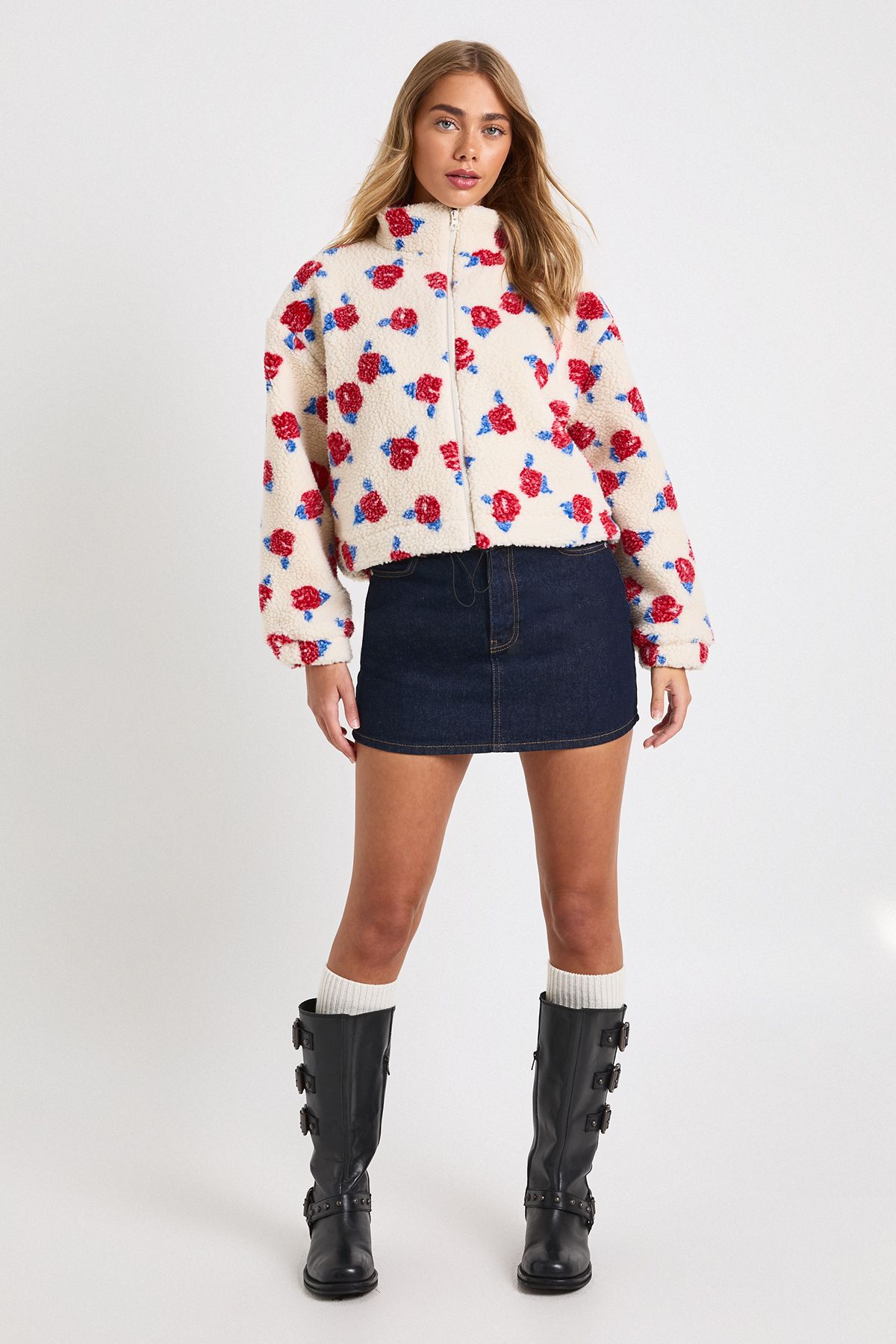 • Plush teddy fabric bomber jacket with vibrant floral print throughout