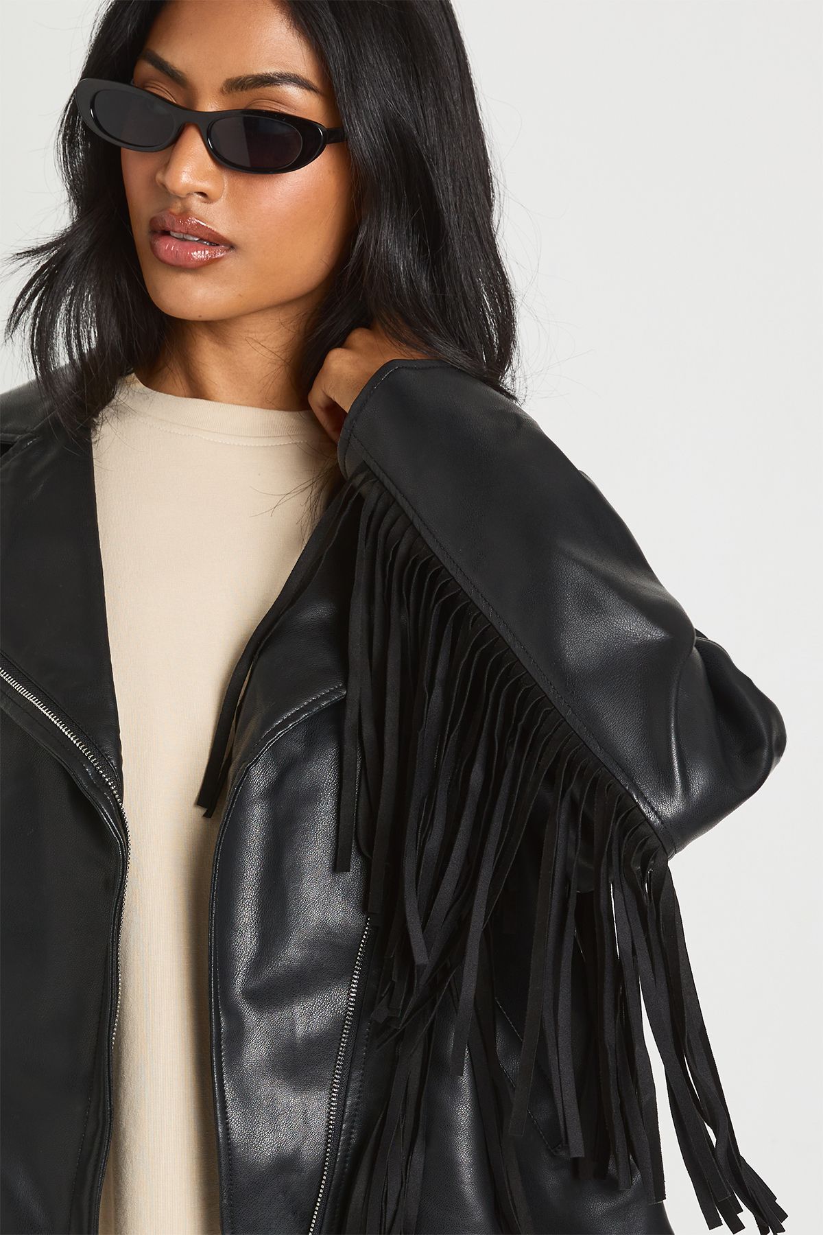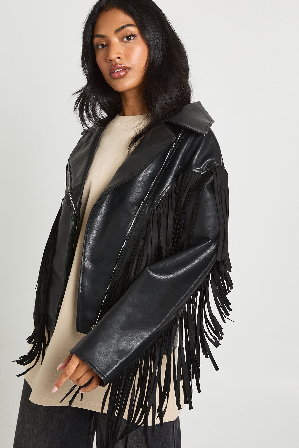 • Edgy biker jacket with eye-catching fringe detail