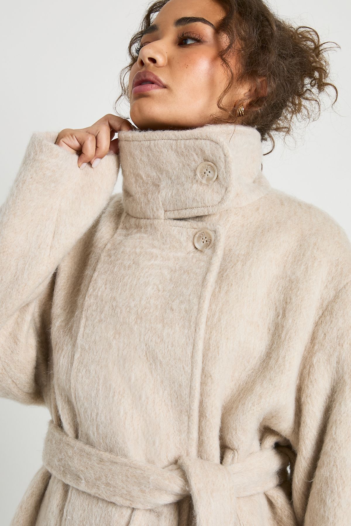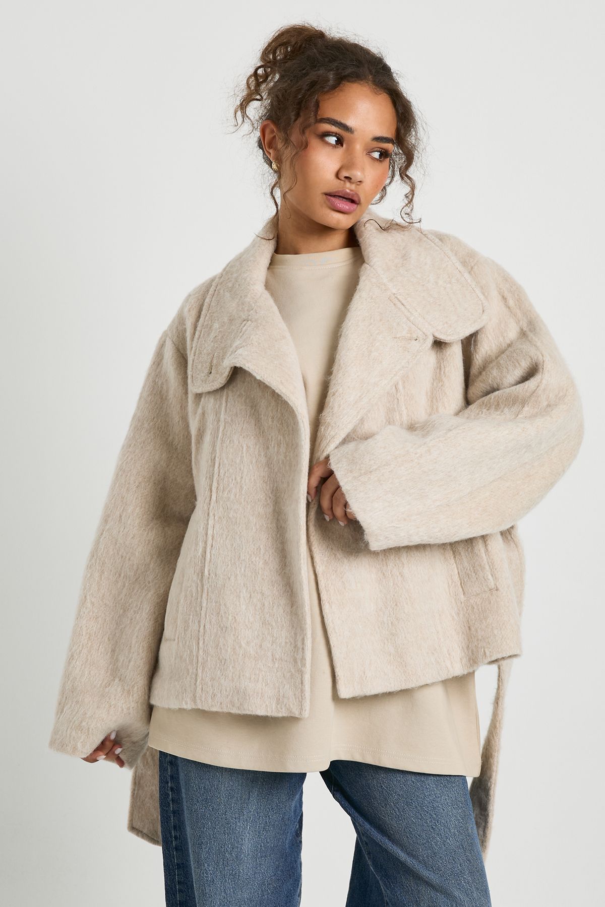 - This belted jacket combines comfort with contemporary style, making it the perfect addition to your casual wardrobe. The relaxed silhouette and generous proportions create a cosy yet chic look that works brilliantly for everyday wear. Style with slim-fitting trousers or leggings to balance the oversized shape, as shown in our styling. For family gatherings or weekend brunches, layer over a simple knit and pair with your favourite jeans and flat shoes for an effortlessly put-together appearance. The versatile design allows for multiple styling options-wear open for a relaxed feel or belted to define your waist. This jacket transitions seamlessly from autumn to winter, making it a practical choice for the British climate. The neutral tone ensures it will complement existing pieces in your wardrobe, while the textured finish adds a touch of sophistication to casual ensembles.