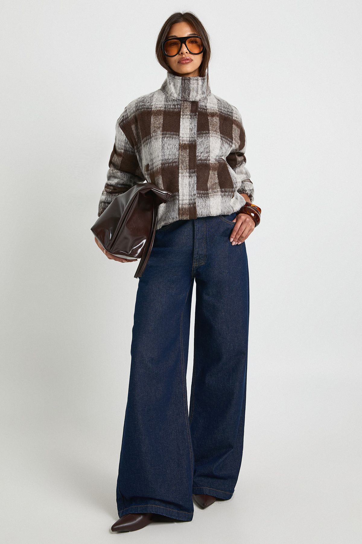 - Make a statement with this eye-catching check bomber jacket that combines classic pattern with modern styling. The relaxed fit creates an effortlessly cool silhouette that works brilliantly with wide-leg denim as shown, or pair with slim-fit trousers for a balanced look. The funnel neck adds a contemporary twist to the traditional bomber style, making it perfect for casual weekend outings or family gatherings. Layer over a simple tee and jeans for daytime coffee dates, or throw on over a lightweight jumper when temperatures drop. This Boohoo bomber is an essential autumn-to-winter transition piece that brings texture and dimension to your everyday wardrobe. Complete the look with chunky trainers and a structured handbag for an outfit that's both practical and fashion-forward.