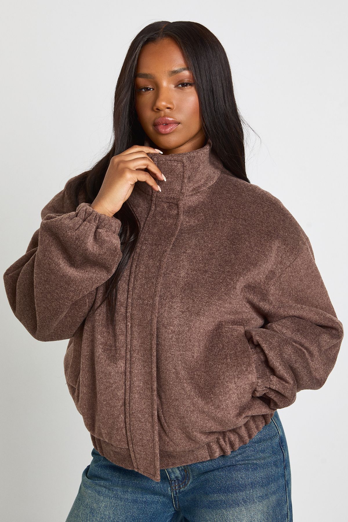 - Add a touch of casual sophistication to your everyday wardrobe with this textured wool-look bomber jacket. The relaxed silhouette offers both comfort and style, making it perfect for those laid-back weekend outings or casual family gatherings. Style as seen with wide-leg jeans and chunky footwear for an on-trend look that balances proportions beautifully. For cooler days, layer over a simple white tee or lightweight jumper. This versatile jacket works wonderfully for coffee dates, shopping trips, or casual meet-ups with friends. The timeless bomber design ensures it will remain a staple in your wardrobe for seasons to come, while the textured finish adds a contemporary twist to this classic silhouette. Pair with your favourite trainers for an effortlessly cool daytime ensemble.