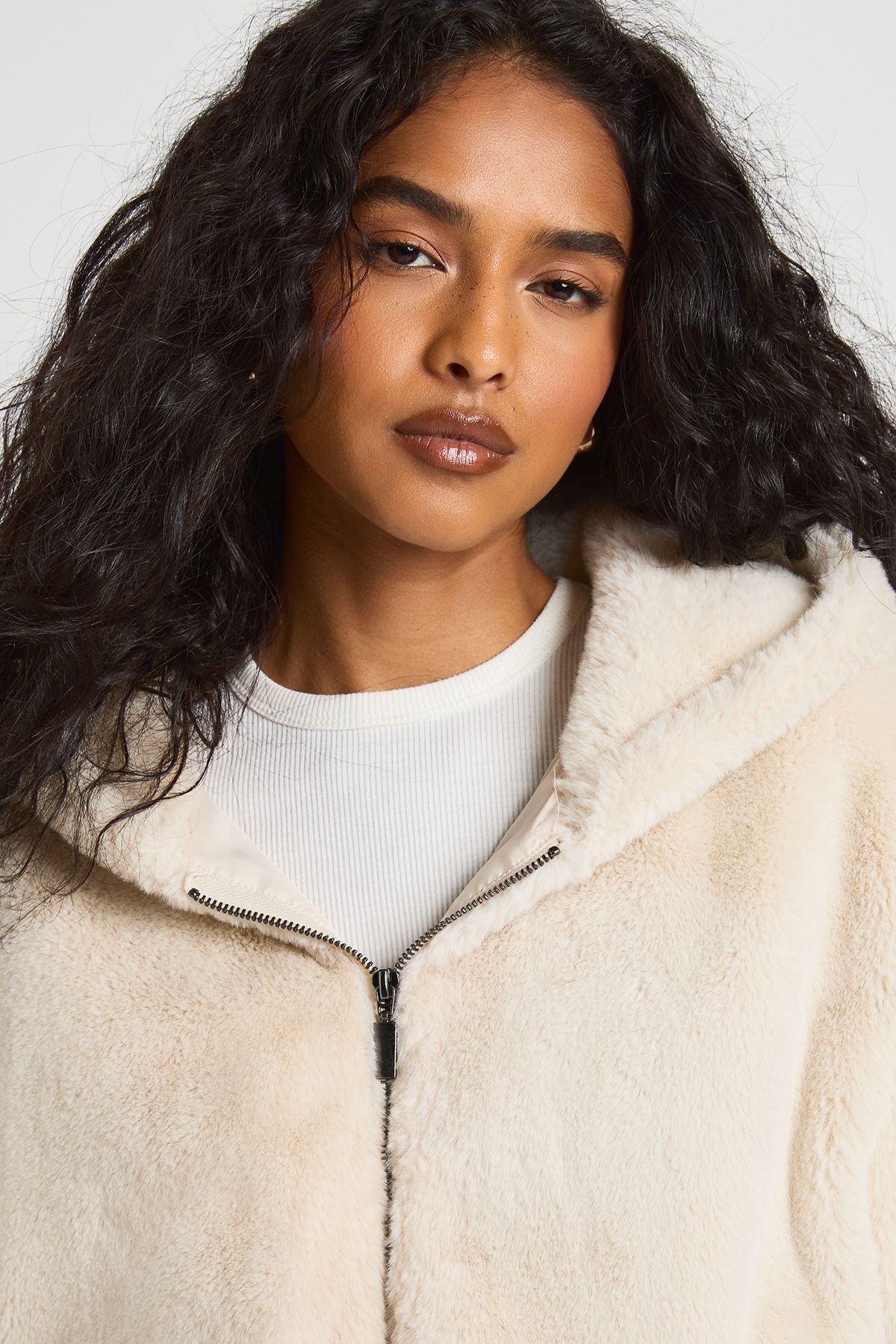 - Plush fur-textured bomber jacket with cosy hood for extra warmth