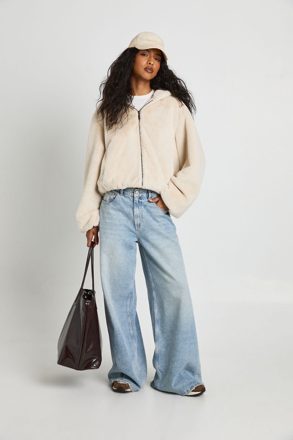 - This fur hooded bomber jacket from Boohoo combines casual comfort with on-trend styling. The plush texture and relaxed fit make it ideal for layering over your favourite basics when temperatures drop. Style as shown with a simple white tee and wide-leg jeans for an effortlessly cool weekend look, or pair with a midi dress and trainers for casual gatherings. The versatile design works brilliantly for family outings, coffee dates or casual shopping trips. Add a crossbody bag to complete the ensemble while keeping your hands free. This jacket strikes the perfect balance between fashion-forward design and everyday wearability - a true wardrobe hero that will see you through the cooler months in style.