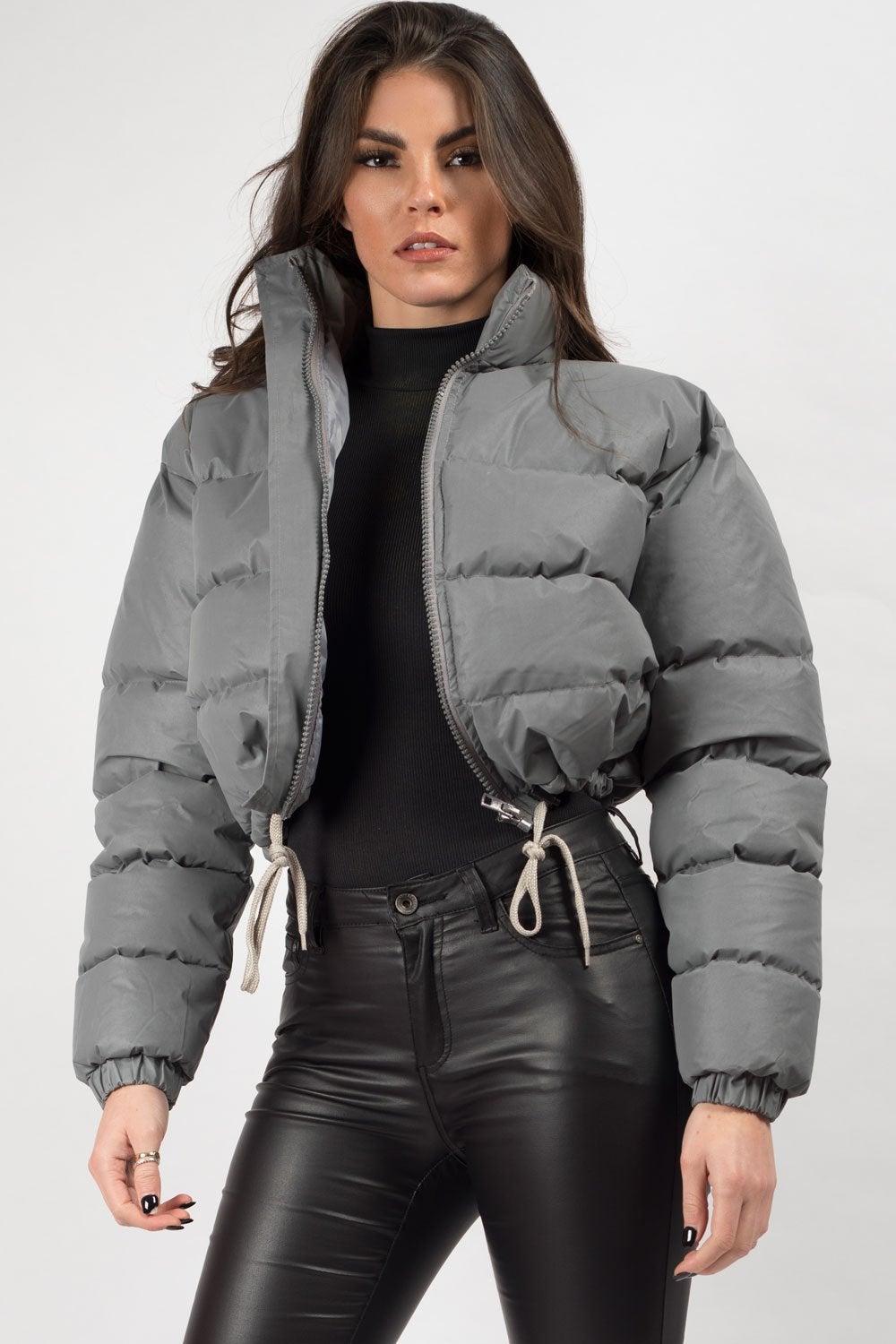 Reflective jackets are becoming must have for your AW wardrobe. This reflective puffer jacket features cropped length, highly reflective grey fabric, zip fastening and drawstrings. Style it with our high waist jeans or with a dress for your next party. Also available in BLACK.