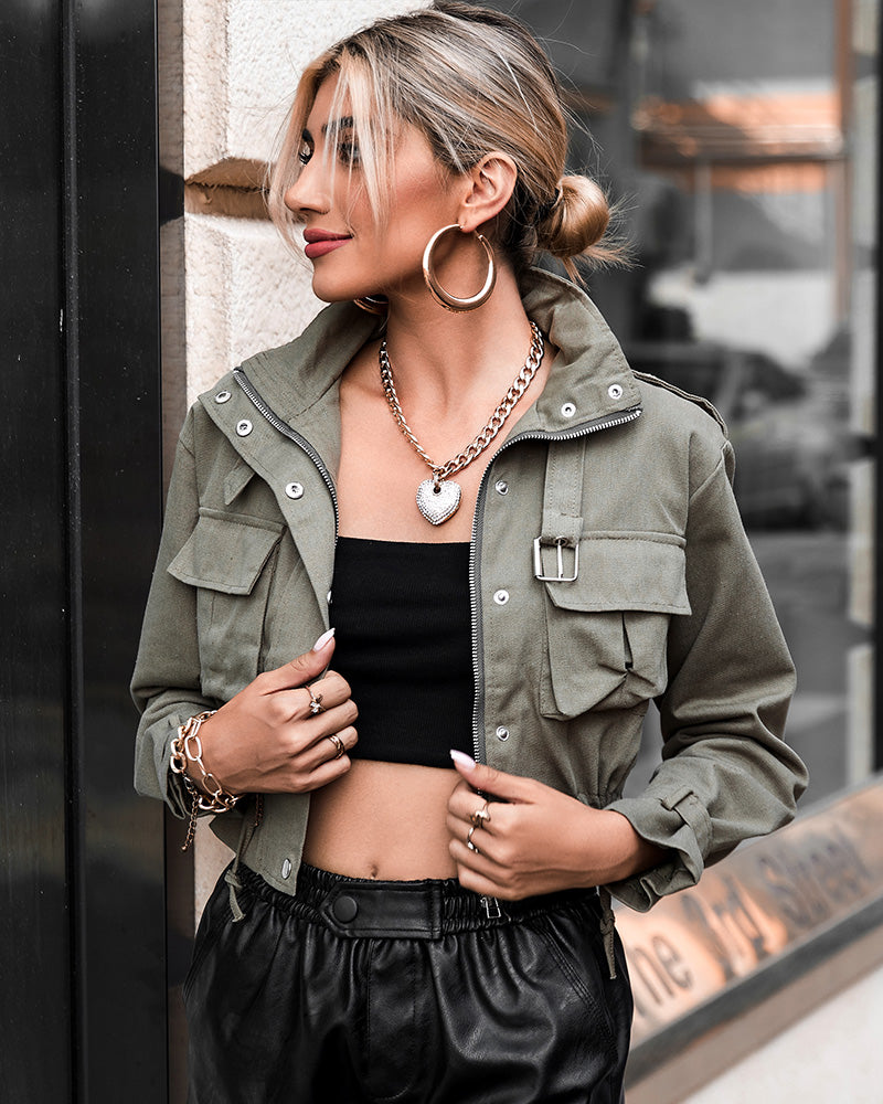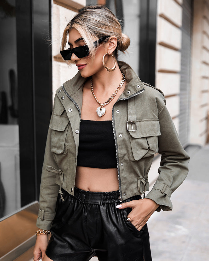 High Neck Zip Up Snap Button Front Flap Pockets Design Cargo Biker Jacket Casual Drawstring Crop Coat