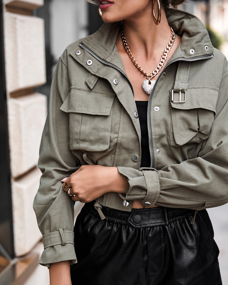 • High Neck Zip Up Snap Button Front Flap Pockets Design Cargo Biker Jacket Casual Drawstring Crop Coat
