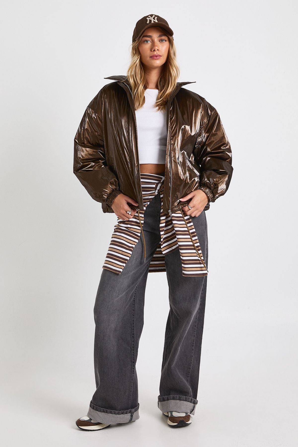 • Make a bold statement with this striking high shine bomber jacket that captures attention with its lustrous finish. The relaxed fit creates a fashionable oversized look that's perfect for layering over casual outfits. Style with a simple crop top and high-waisted jeans for an effortless daytime ensemble, or throw over a hoodie with wide-leg trousers and trainers for the ultimate in street style. The versatile design works brilliantly with casual attire for family gatherings or weekend brunches. For a trendy contrast, pair with a baseball cap and chunky boots as seen on our model. This standout piece from Boohoo adds instant edge to your wardrobe whilst maintaining that essential casual comfort, making it the perfect outerwear choice for the fashion-forward woman who wants to stay ahead of trends without compromising on wearability.