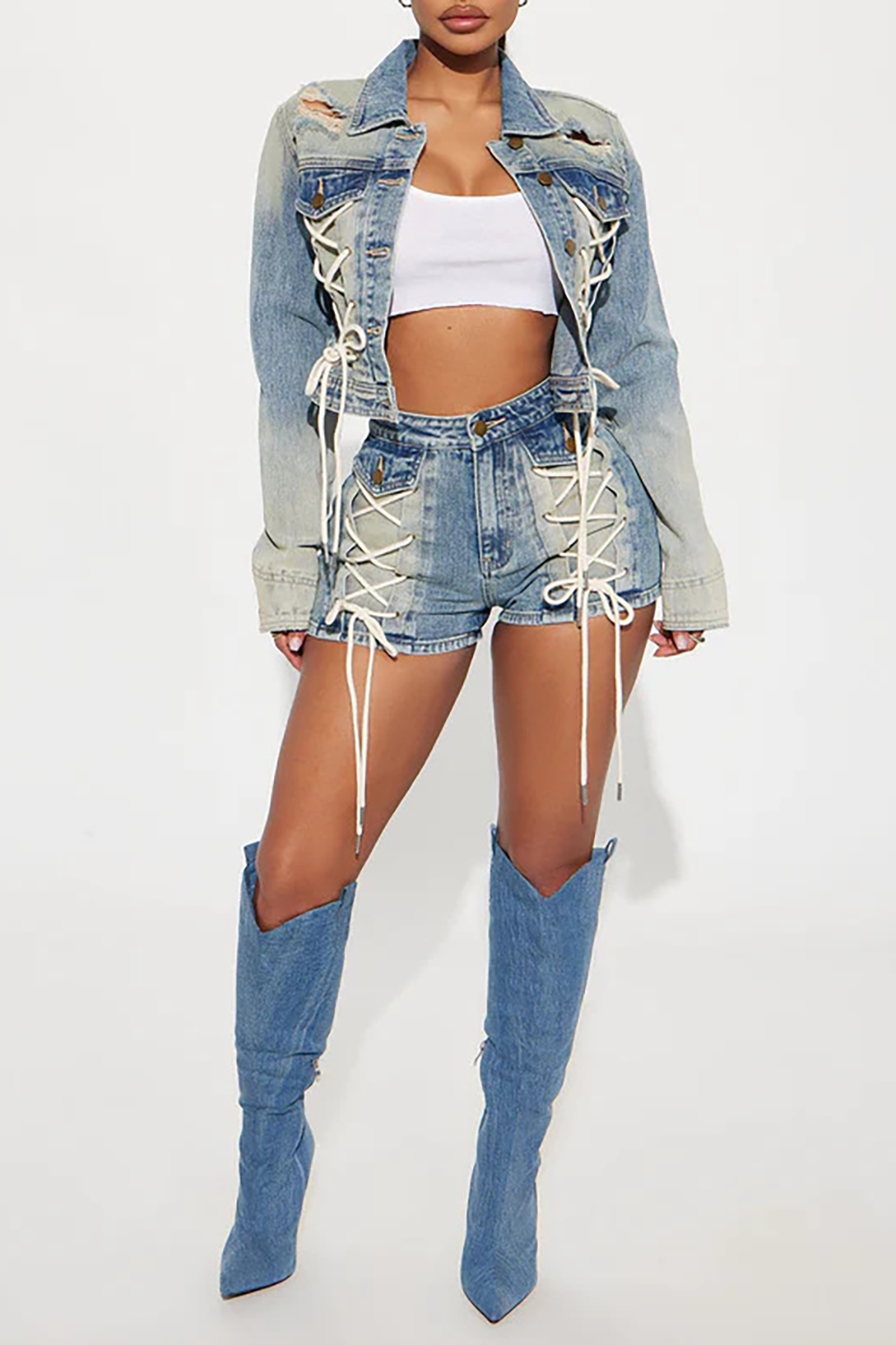 • Lace Up Design Denim Crop Jacket Slim Fit Shorts Matching Set-Blue